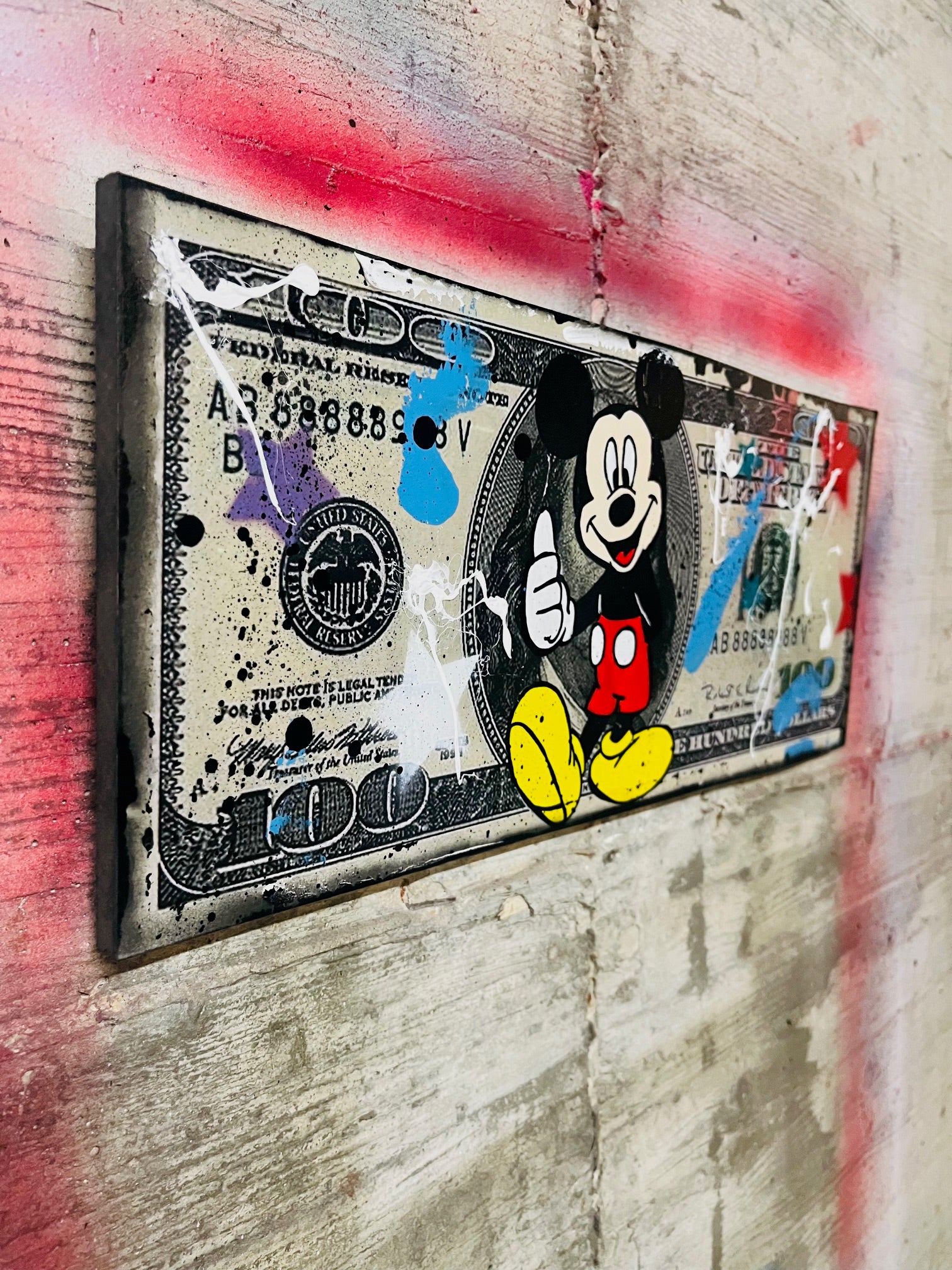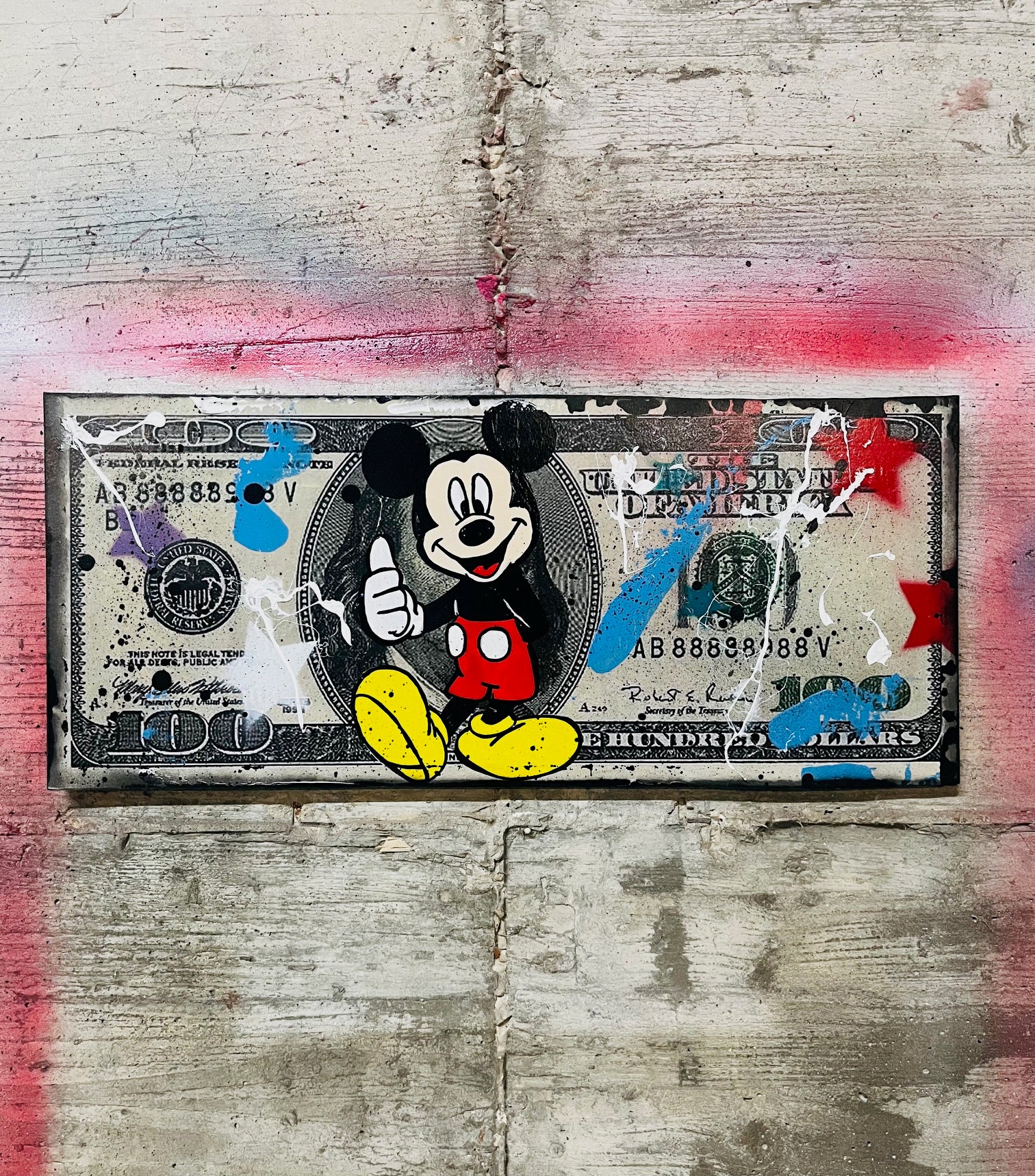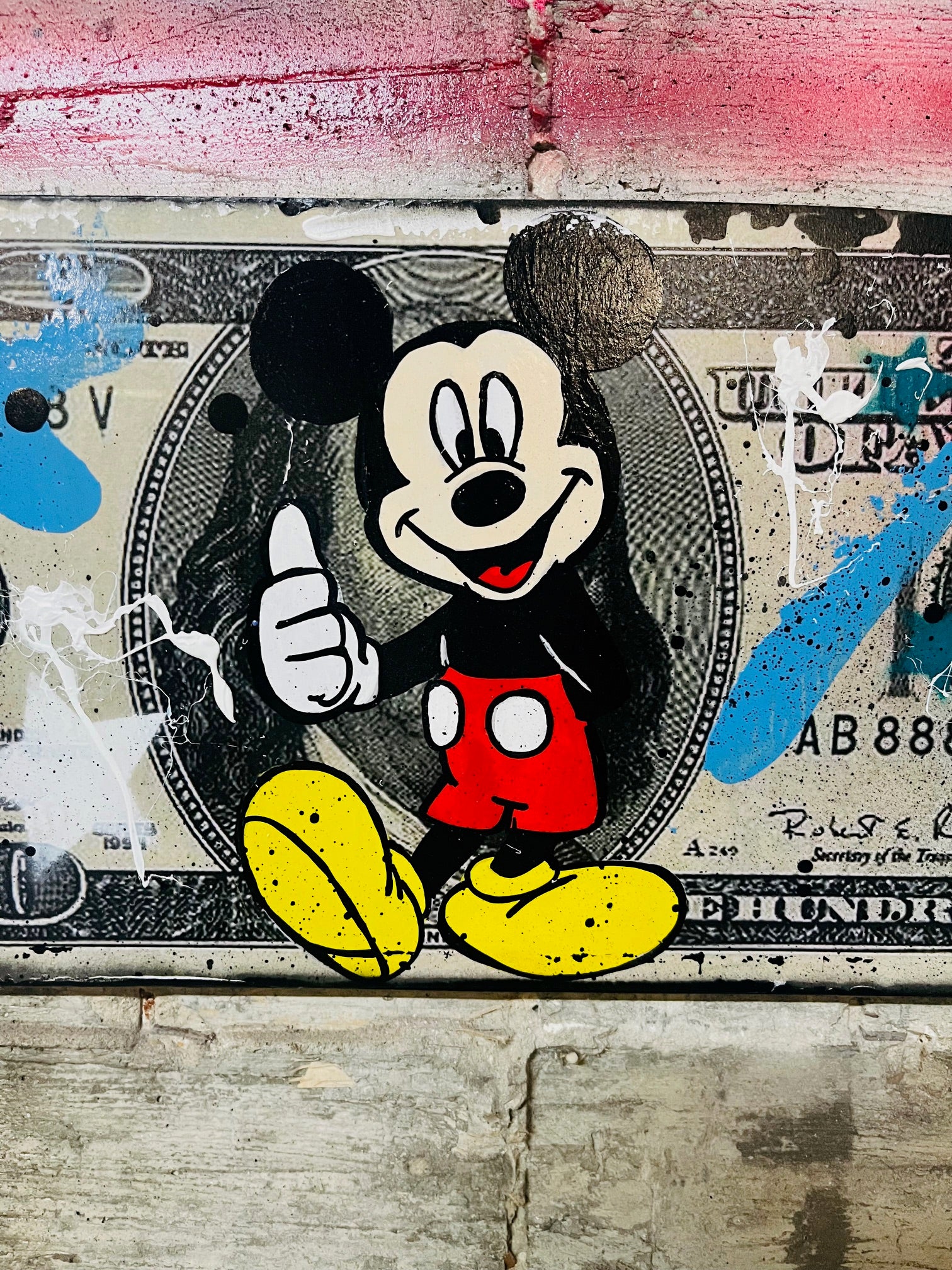 The main subject, Mickey Mouse, is drawn with vibrant acrylic colors, creating a dynamic contrast with the collage of 100-dollar bills that make up the background. The bills, symbols of wealth and material desire, enrich the image with a reflection on consumerism, while Mickey Mouse, beloved and iconic, appears to counterbalance this economic context.