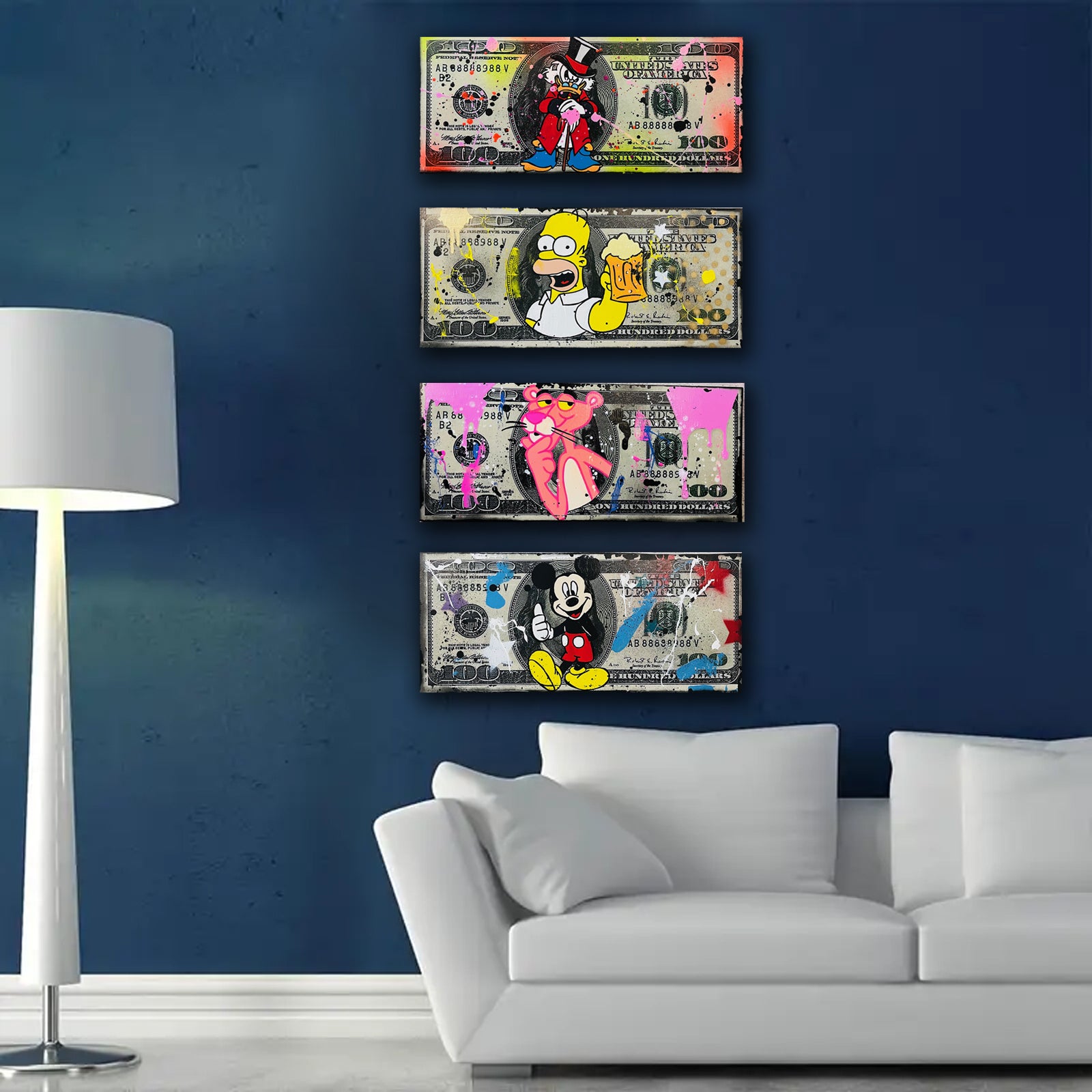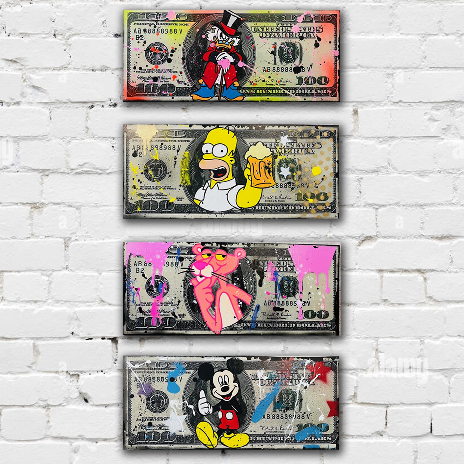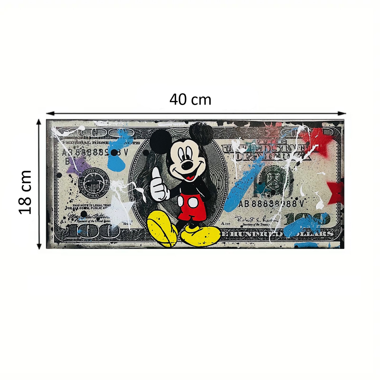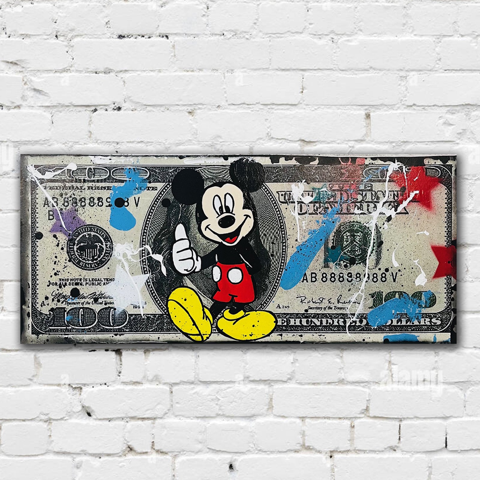 The main subject, Mickey Mouse, is drawn with vibrant acrylic colors, creating a dynamic contrast with the collage of 100-dollar bills that make up the background. The bills, symbols of wealth and material desire, enrich the image with a reflection on consumerism, while Mickey Mouse, beloved and iconic, appears to counterbalance this economic context.