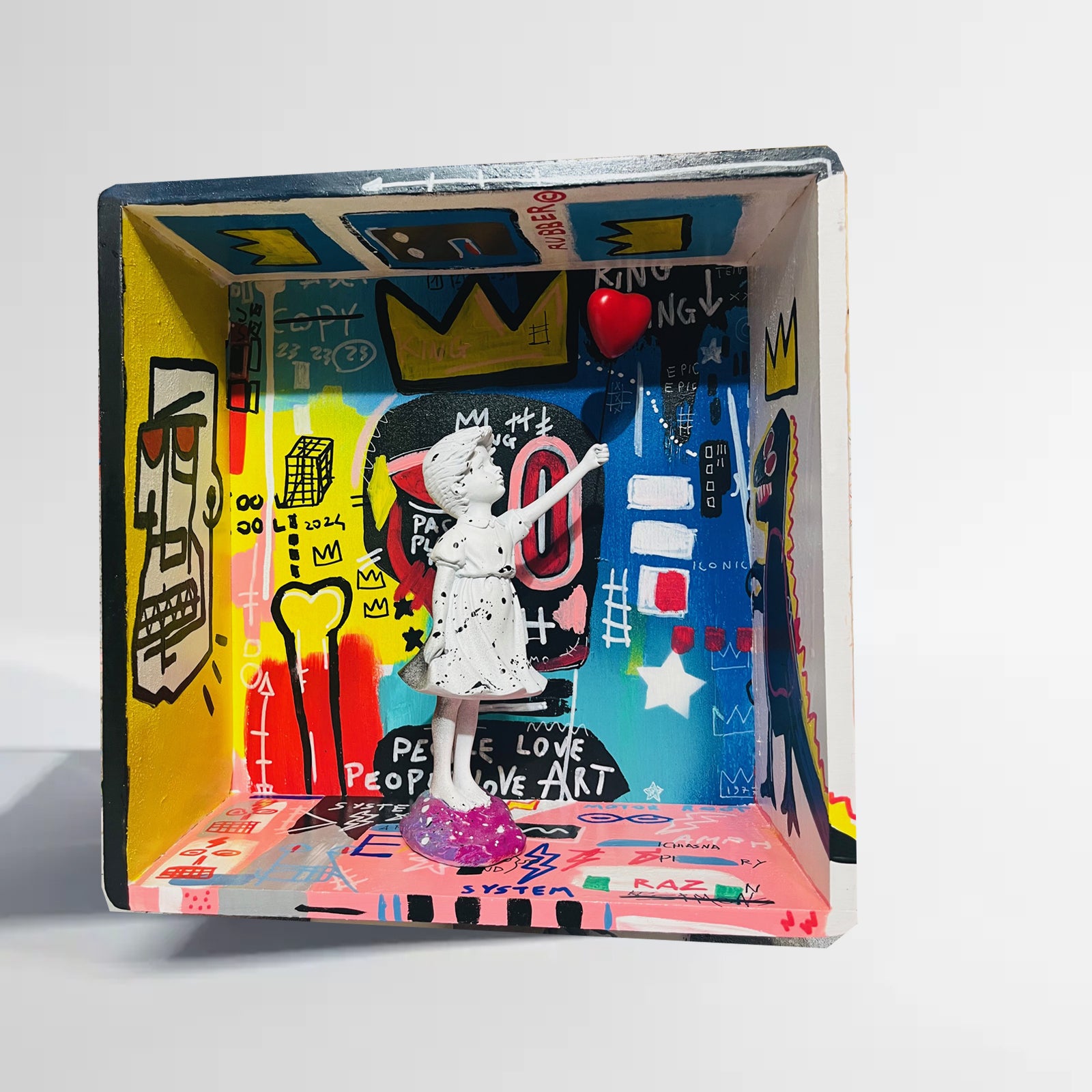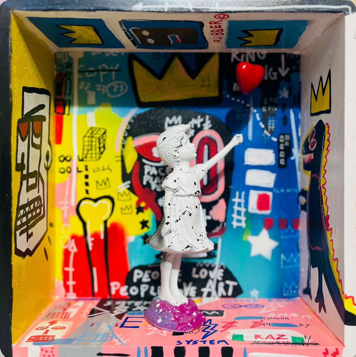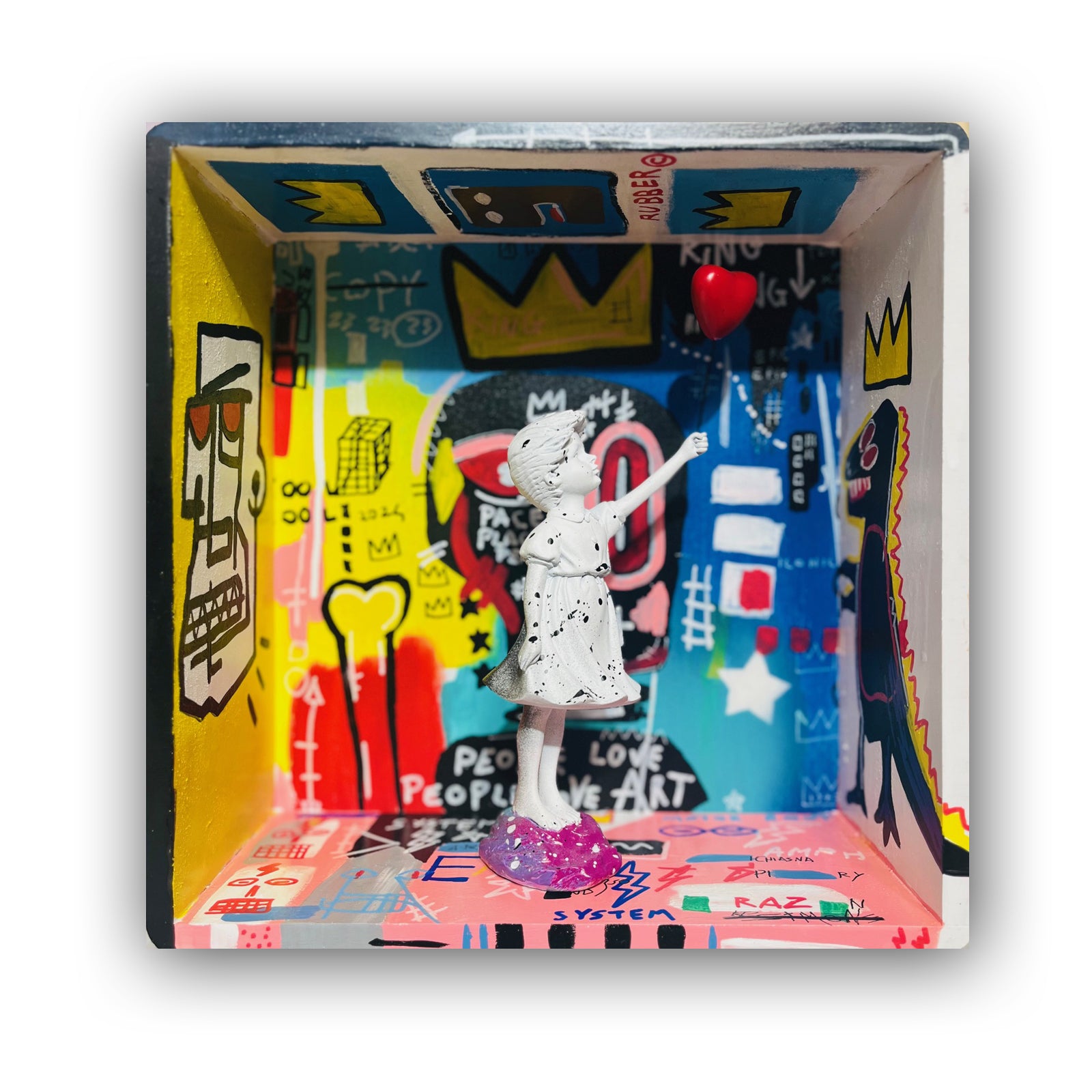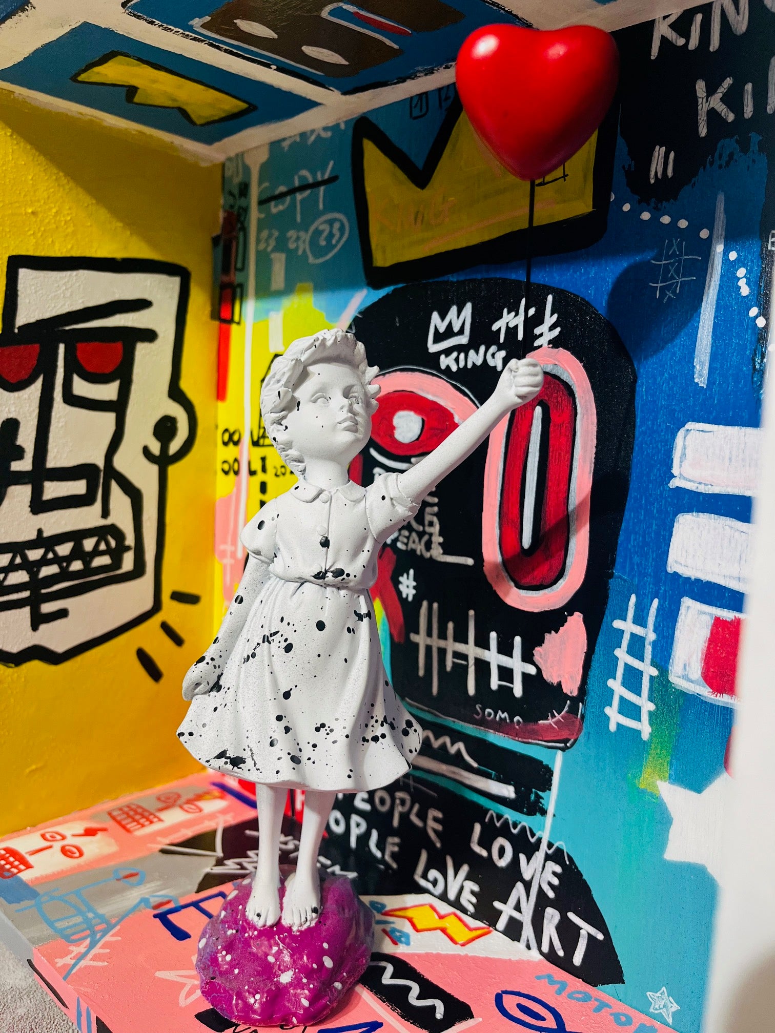 The artwork is created using a mix of materials such as a resin statue and wooden panels. Girl with Balloon is a reproduction of Banksy's famous artwork. The statue is installed on an wooden frame (29x29x11,5cm) and the background and the frame has been drawn and painted by hand in a mix of J.M. Basquiat artworks.