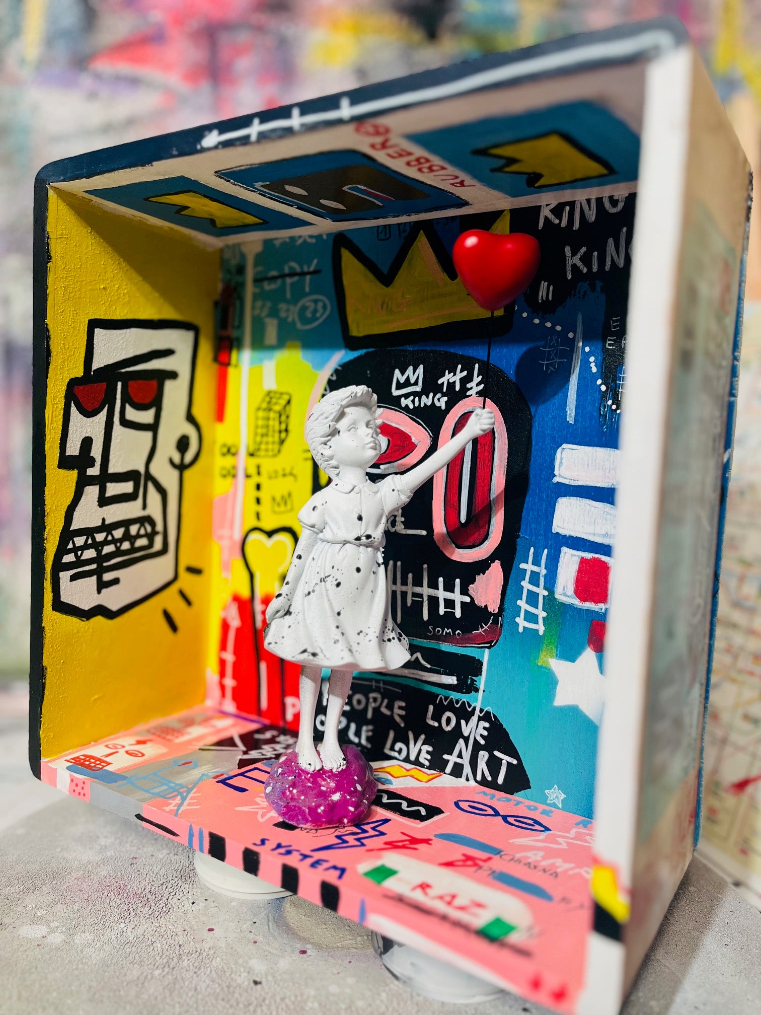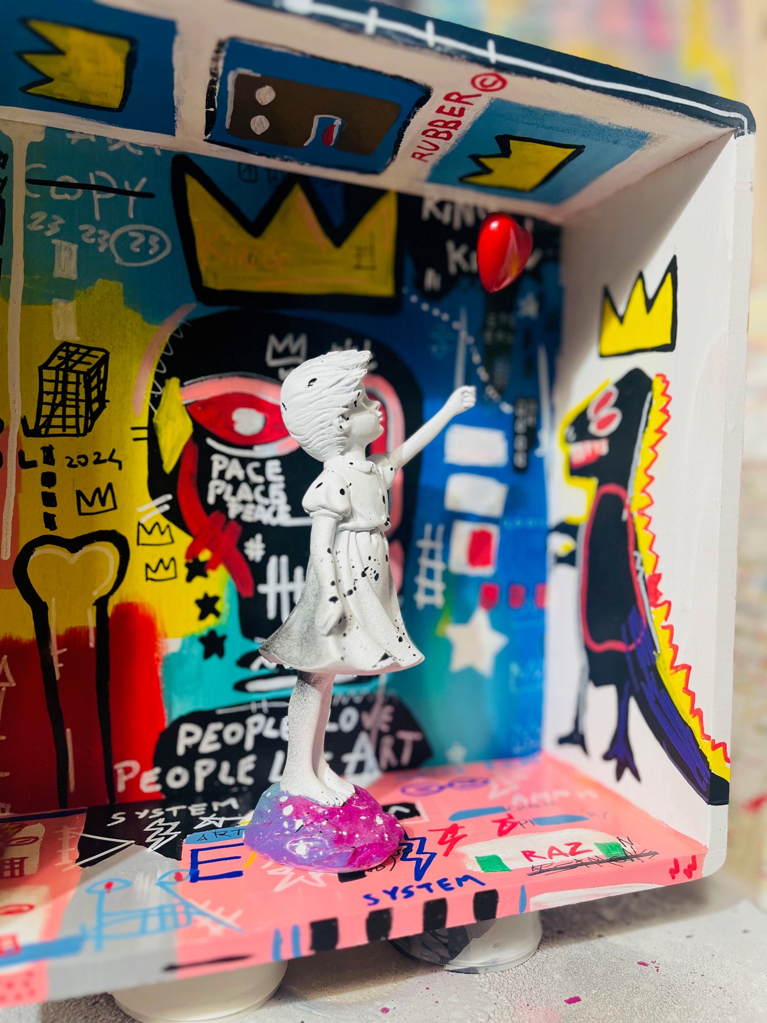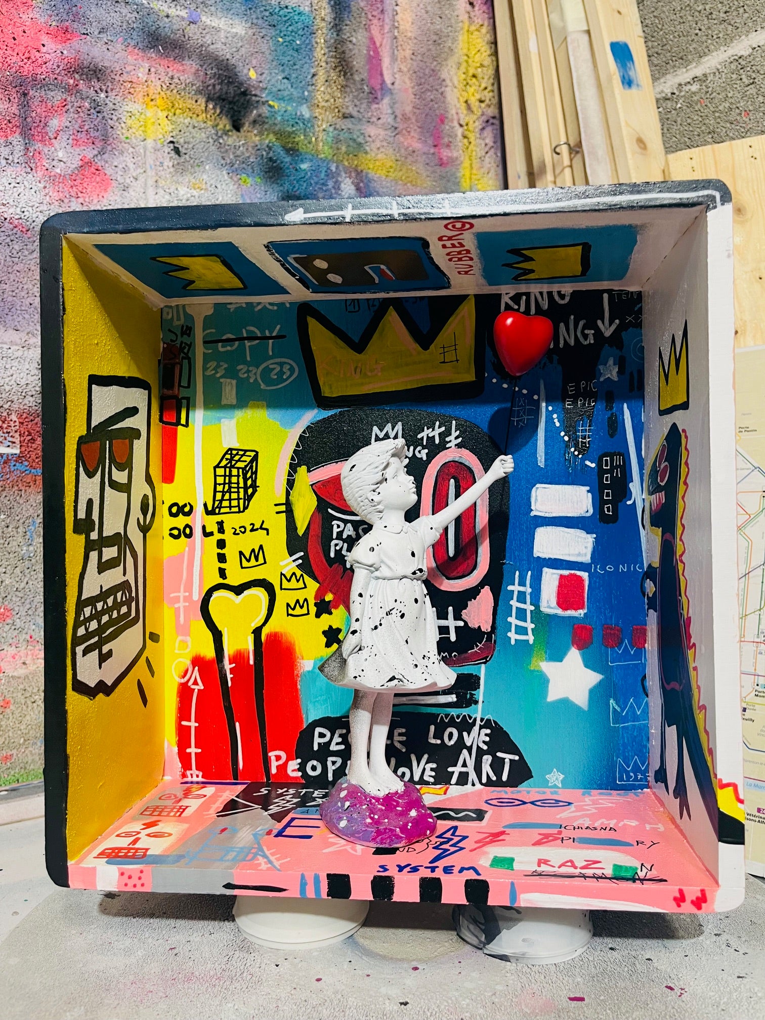 The artwork is created using a mix of materials such as a resin statue and wooden panels. Girl with Balloon is a reproduction of Banksy's famous artwork. The statue is installed on an wooden frame (29x29x11,5cm) and the background and the frame has been drawn and painted by hand in a mix of J.M. Basquiat artworks.