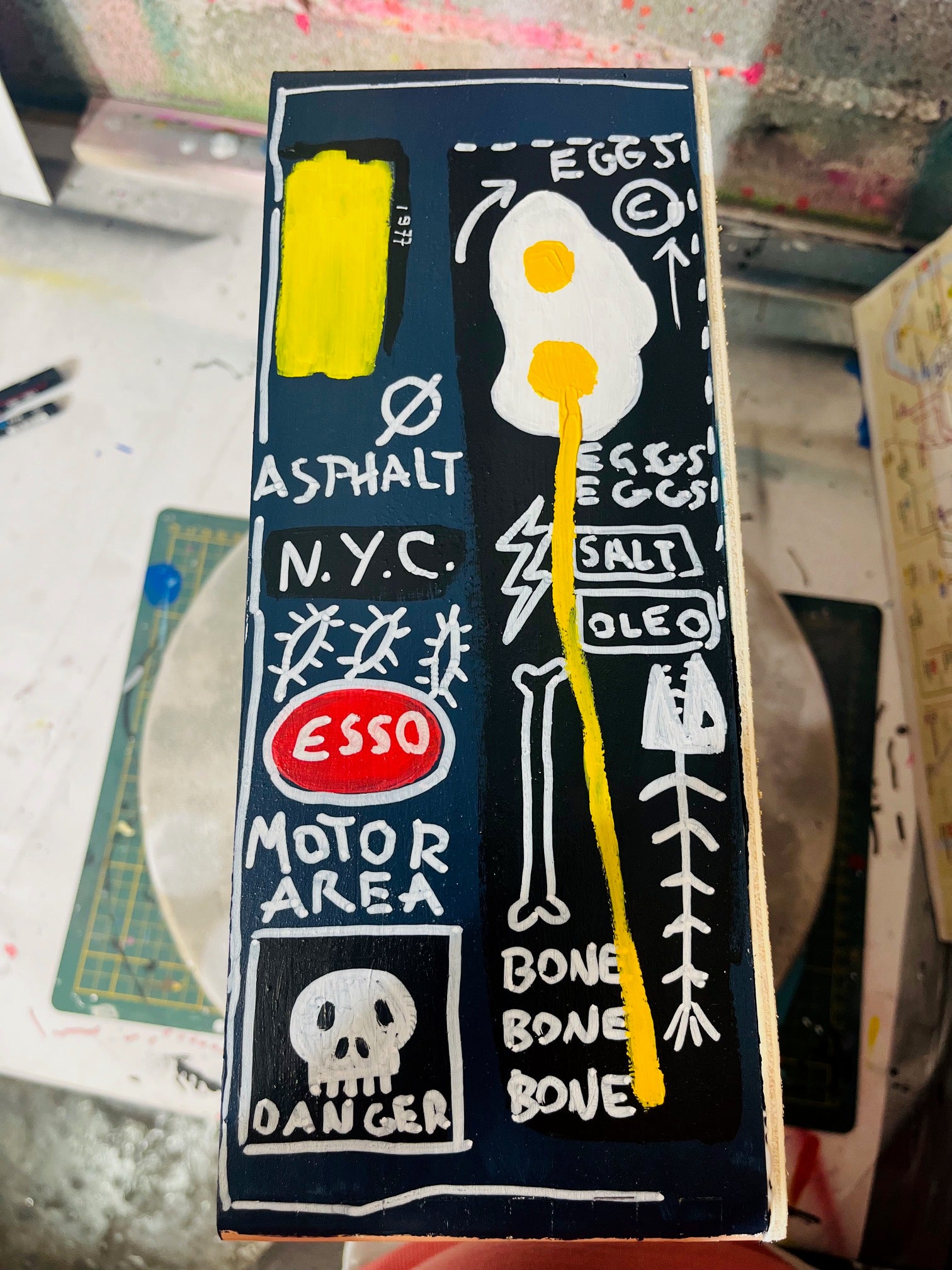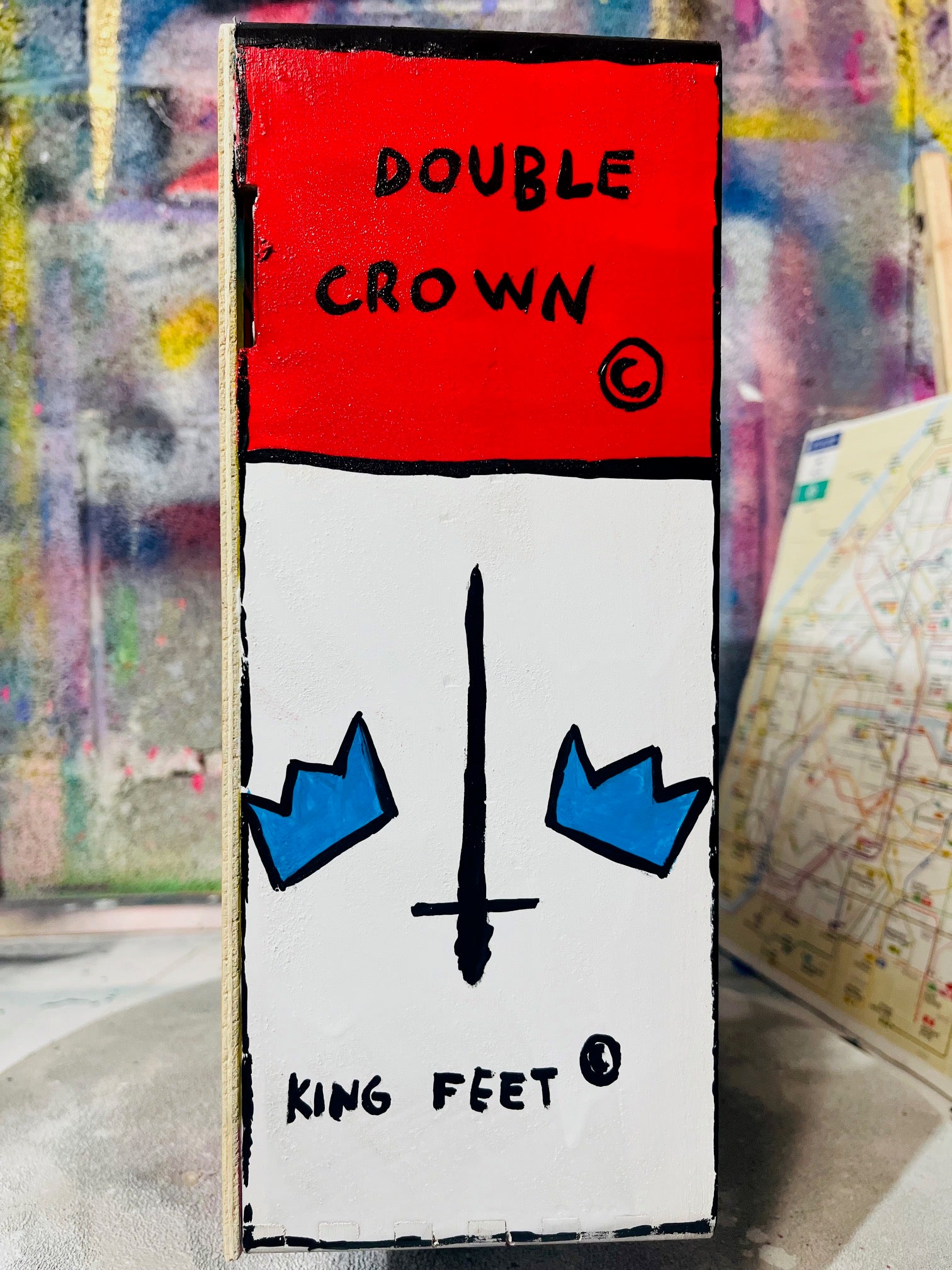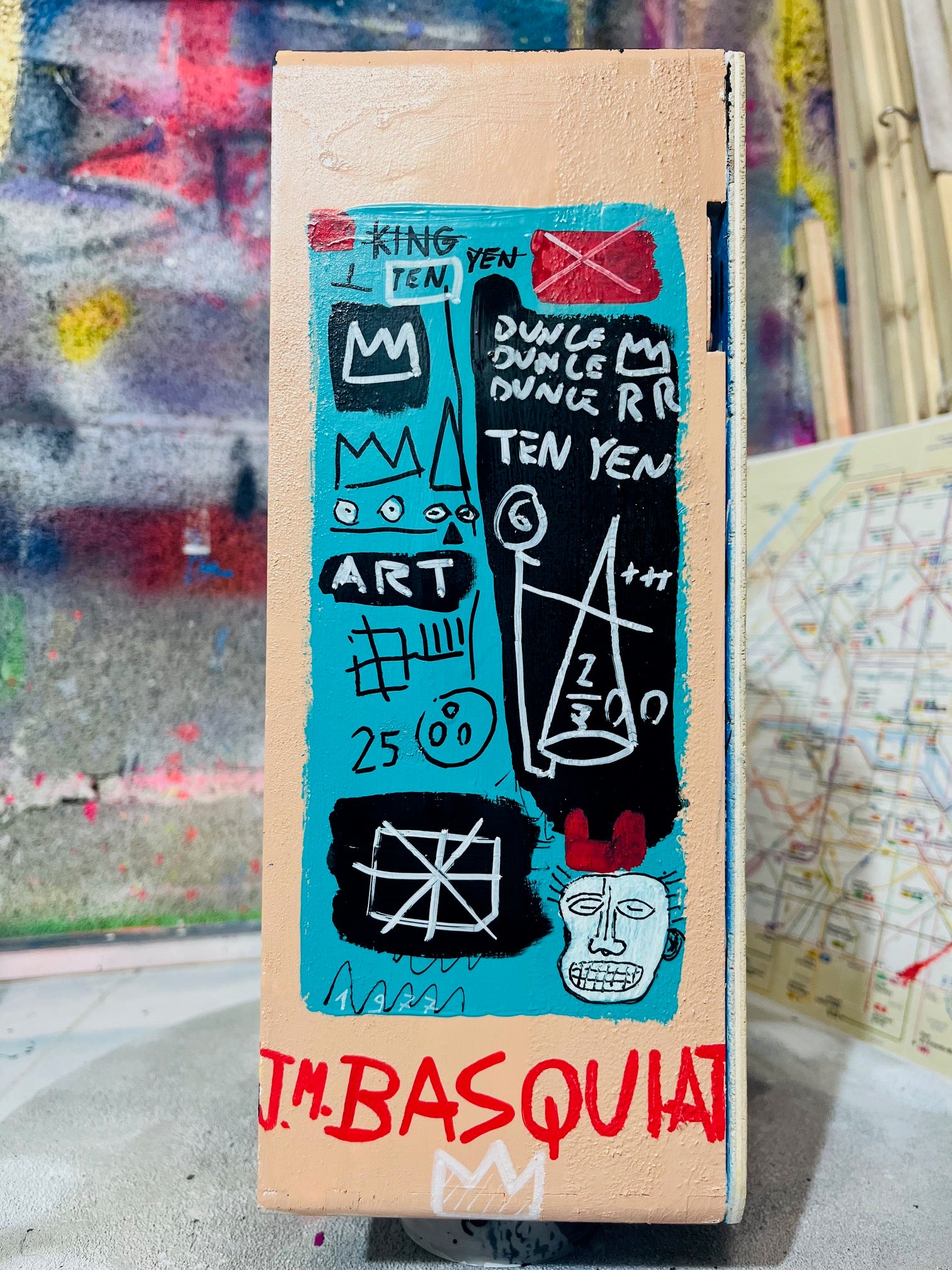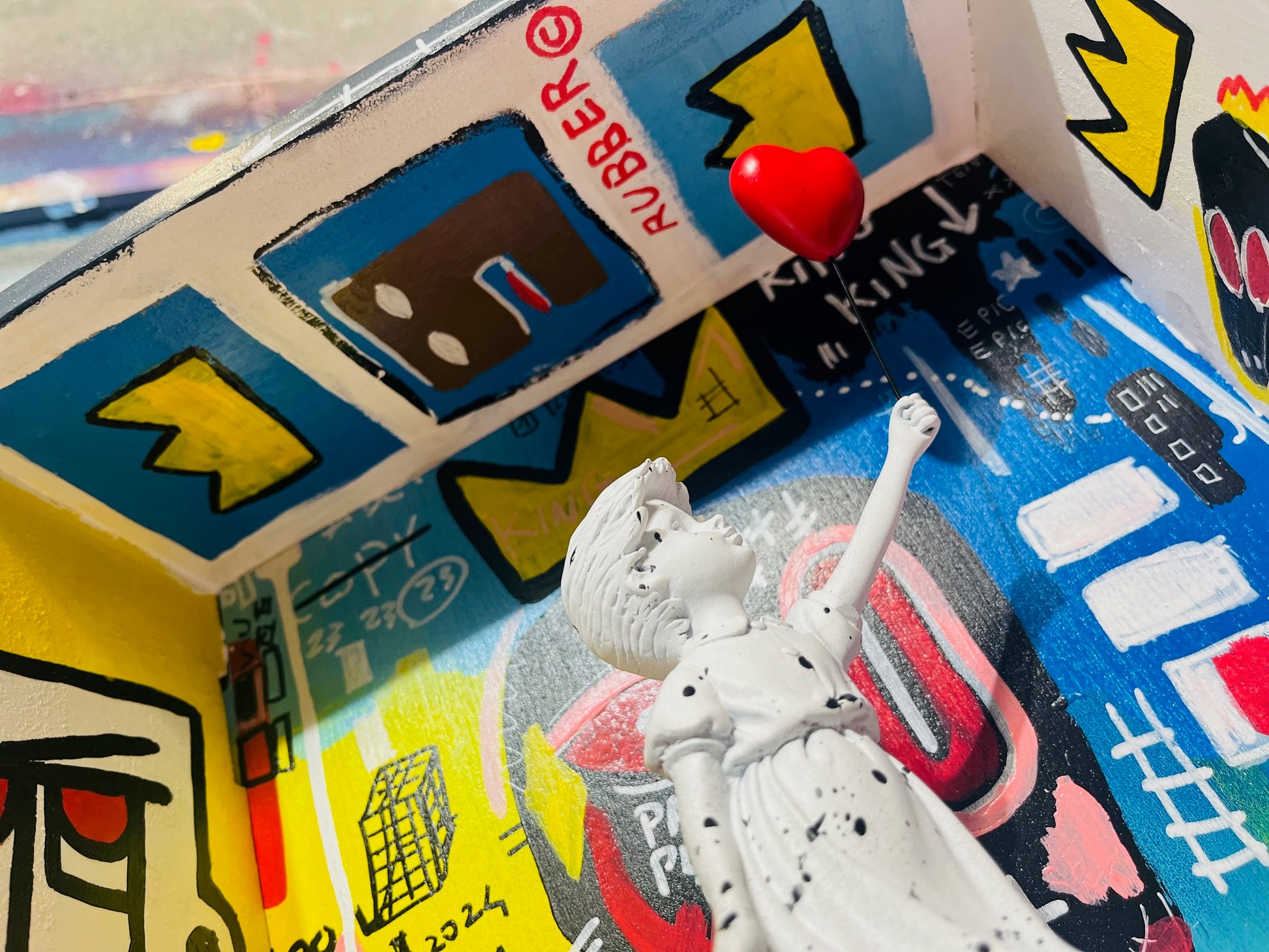 The artwork is created using a mix of materials such as a resin statue and wooden panels. Girl with Balloon is a reproduction of Banksy's famous artwork. The statue is installed on an wooden frame (29x29x11,5cm) and the background and the frame has been drawn and painted by hand in a mix of J.M. Basquiat artworks.