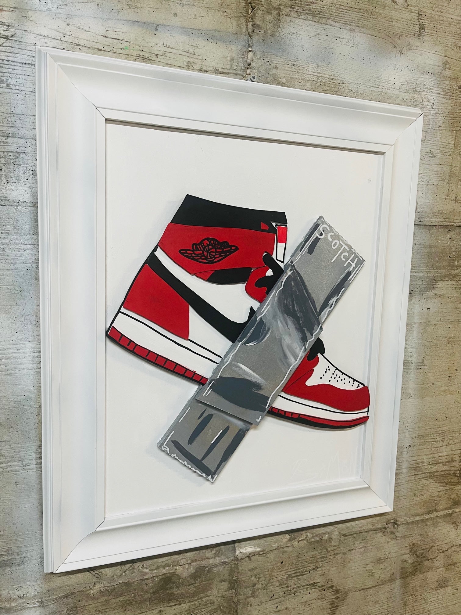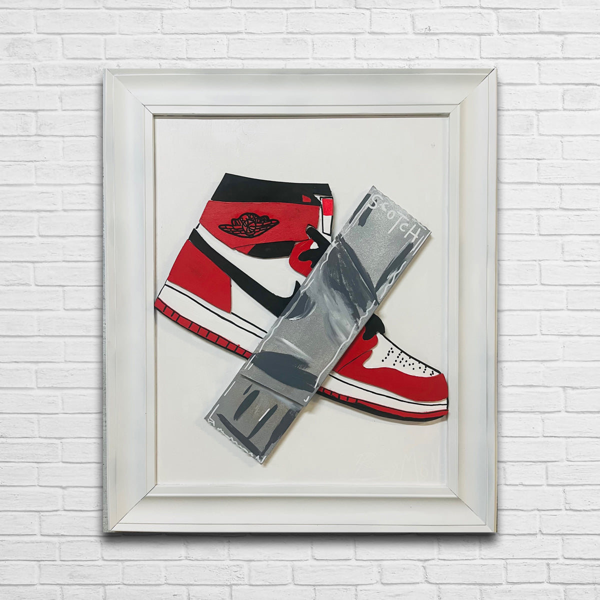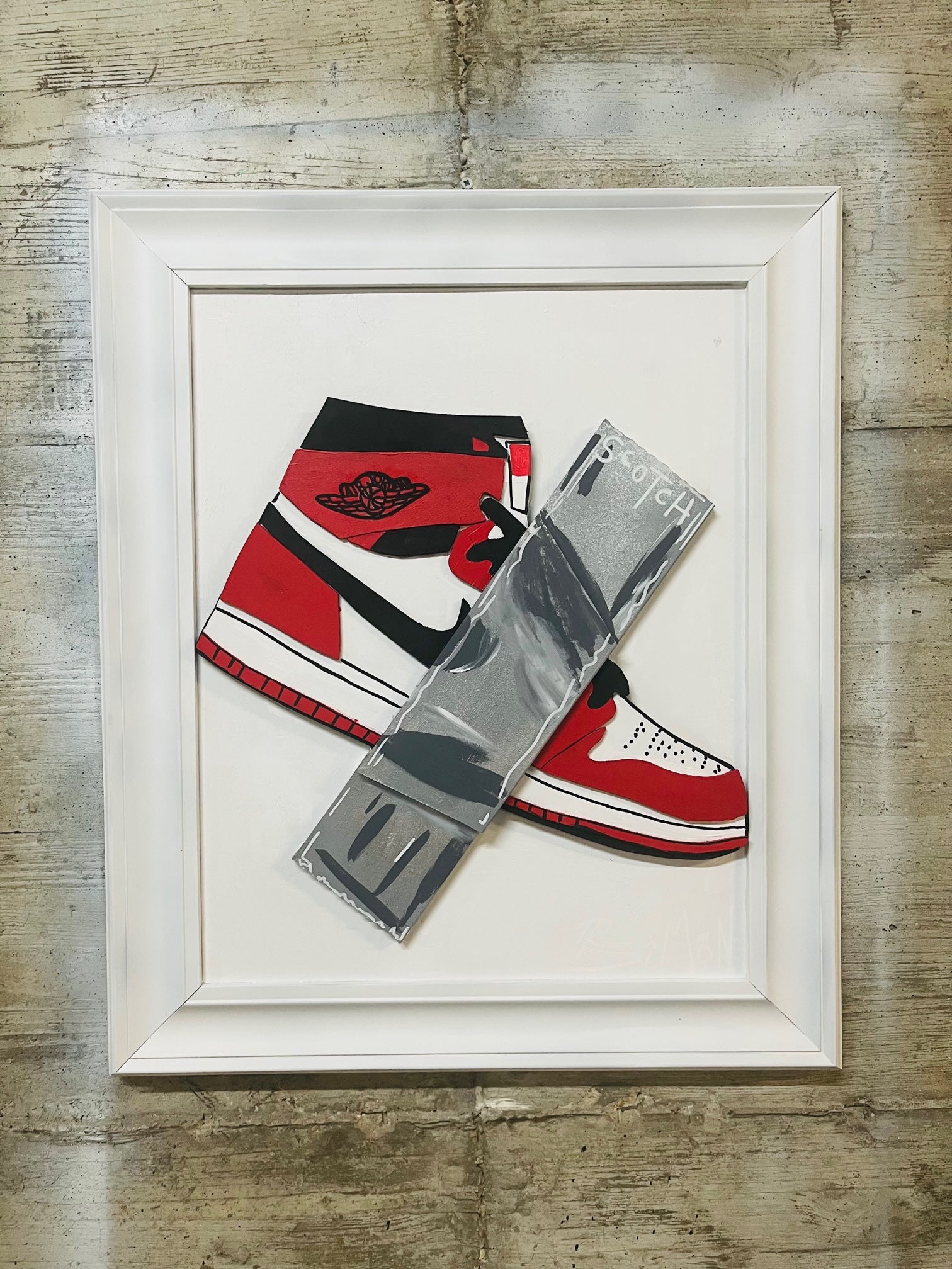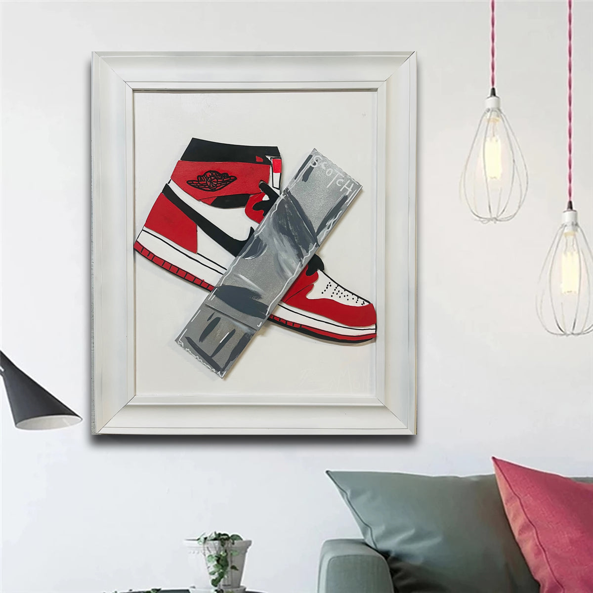 Best Sneakers VS Maurizio Cattelan is an artwork created by the Italian artist Simone De Rosa, wooden frame, the sneakers Nike Air Jordan 1 Chicago 1985 and Maurizio Cattelan scotched banana, drawn and carved by hand. Acrylic colors give light and vibrancy to the artwork.