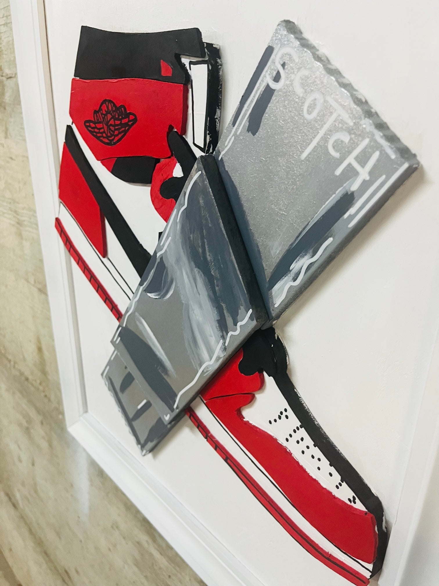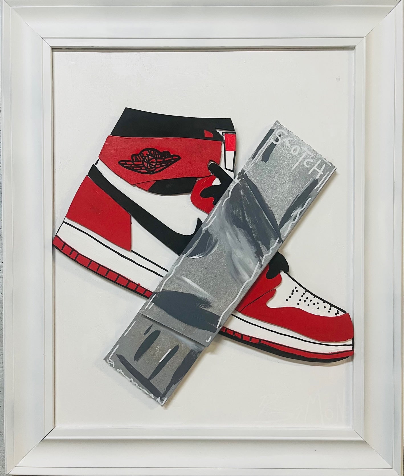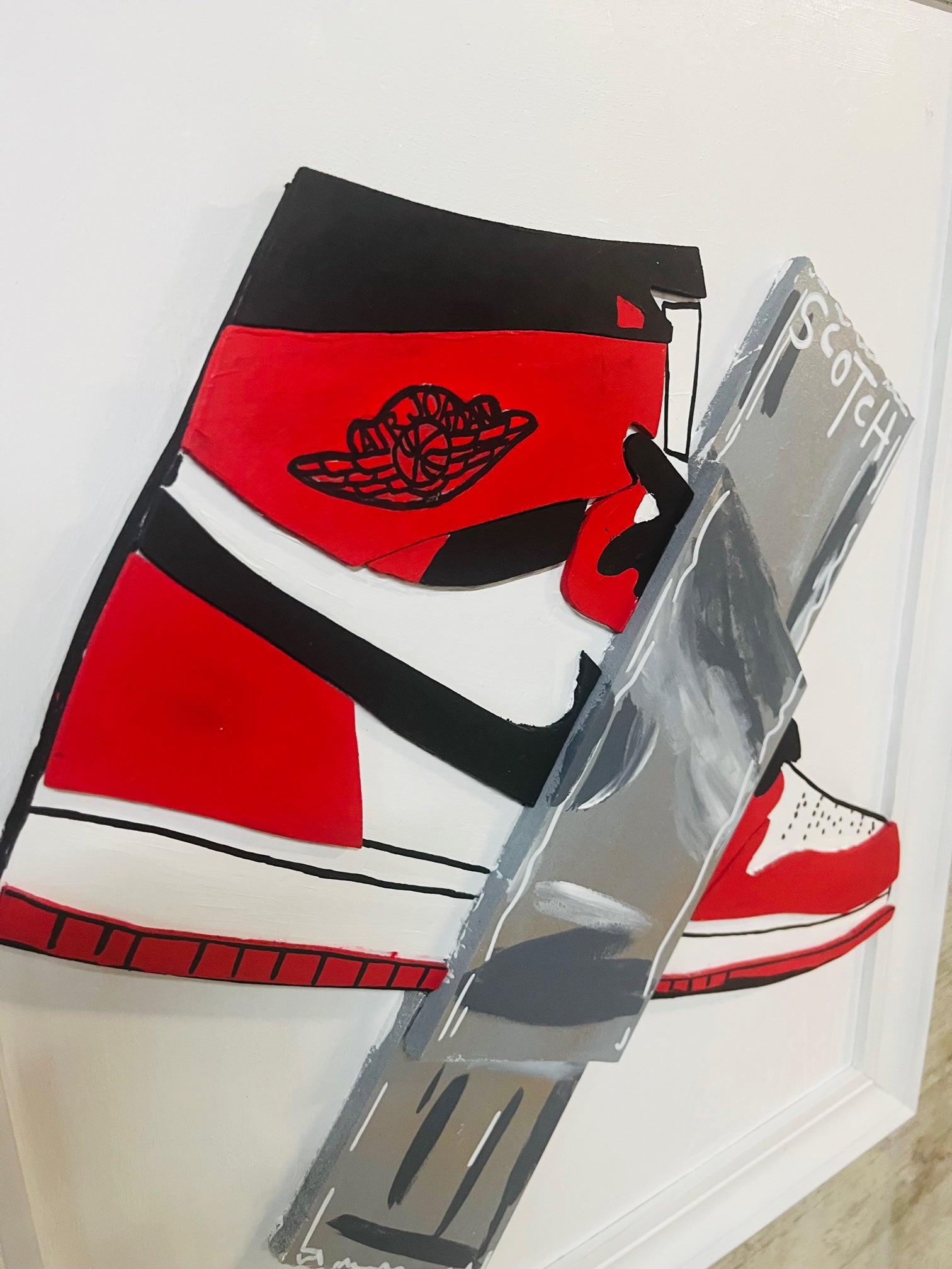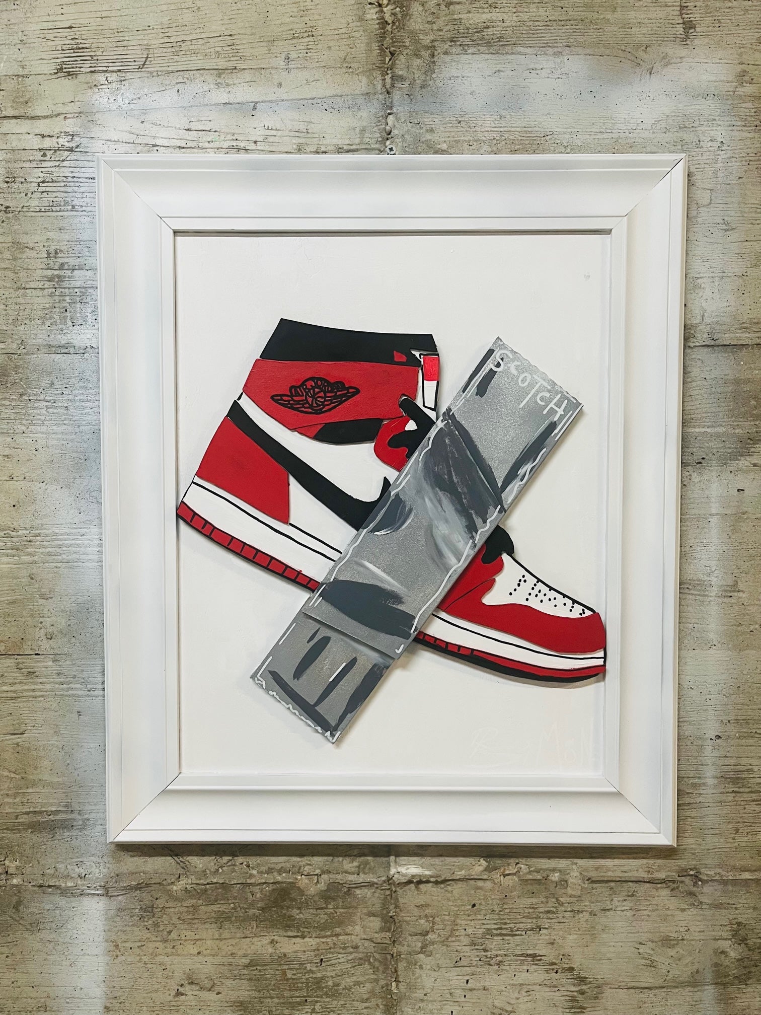 Best Sneakers VS Maurizio Cattelan is an artwork created by the Italian artist Simone De Rosa, wooden frame, the sneakers Nike Air Jordan 1 Chicago 1985 and Maurizio Cattelan scotched banana, drawn and carved by hand. Acrylic colors give light and vibrancy to the artwork.