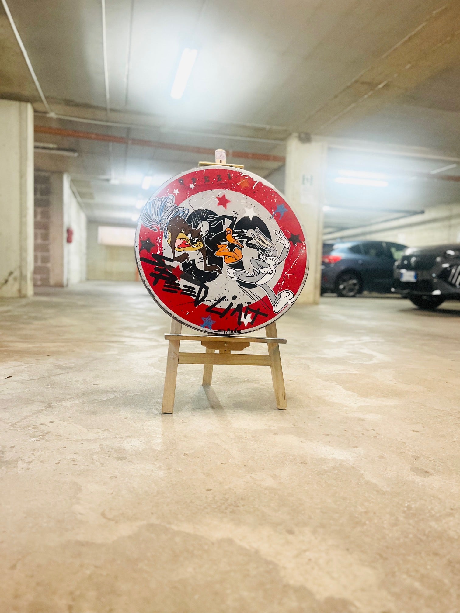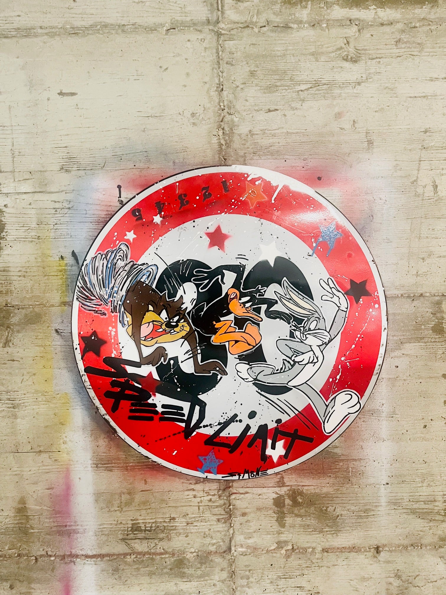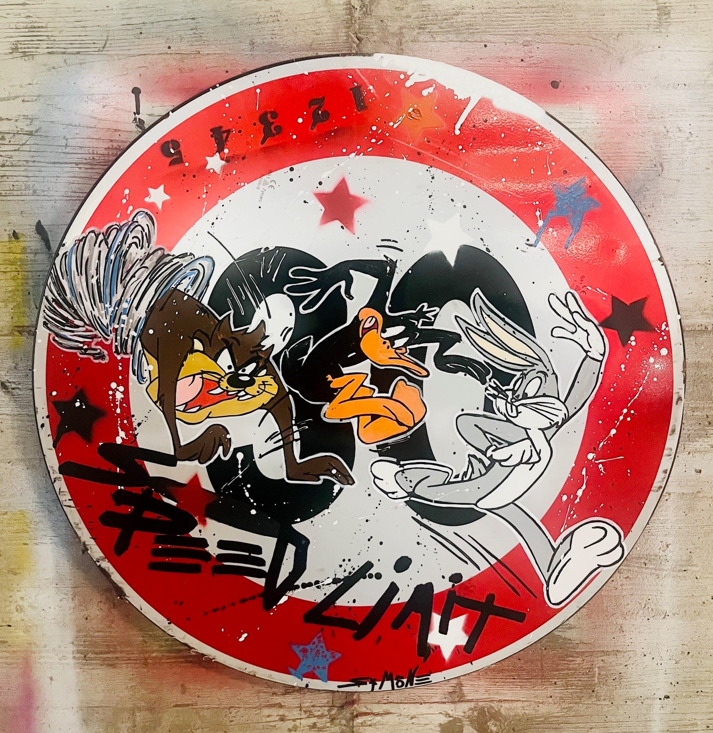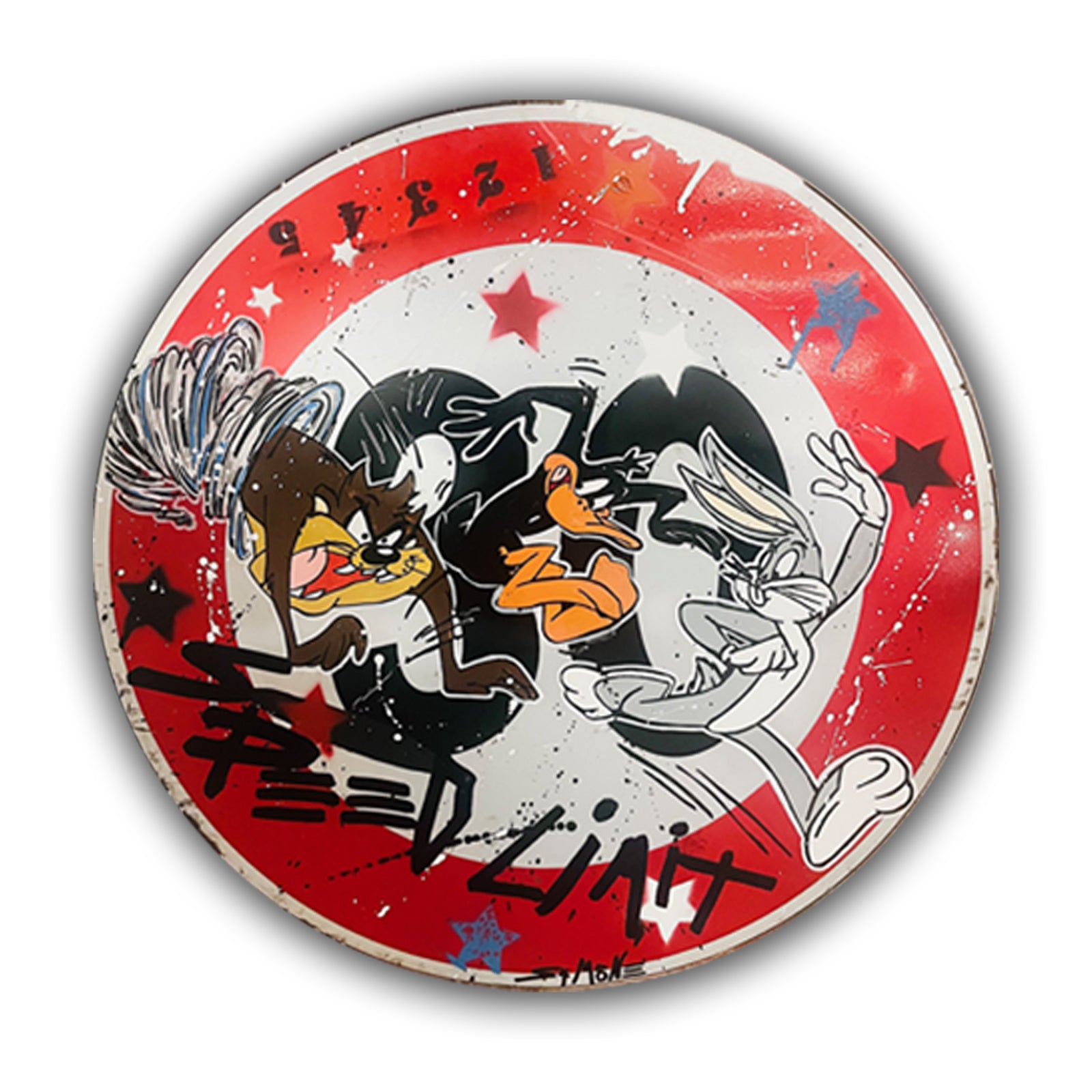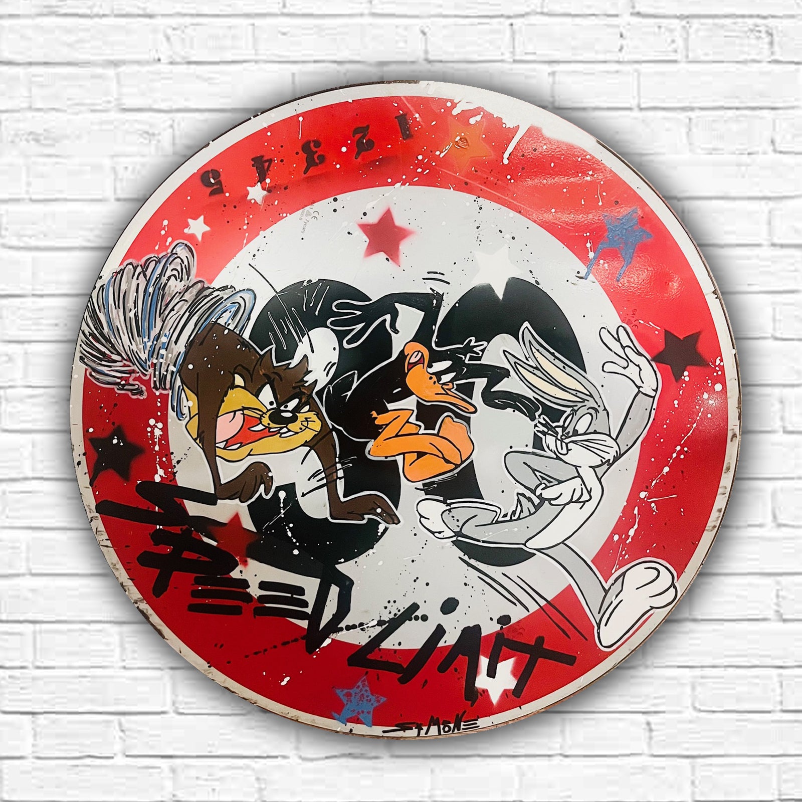 In this high-energy composition, Bugs Bunny, Daffy Duck, and Taz are caught in mid-action as they unmistakably break the 30 km/h limit, bringing chaotic movement and rebellious flair to the concept of urban regulation. The work cleverly fuses vintage signage, graffiti influences, and iconic Looney Tunes characters, resulting in a vivid visual narrative that speaks to freedom, speed, and childhood nostalgia with an edge.