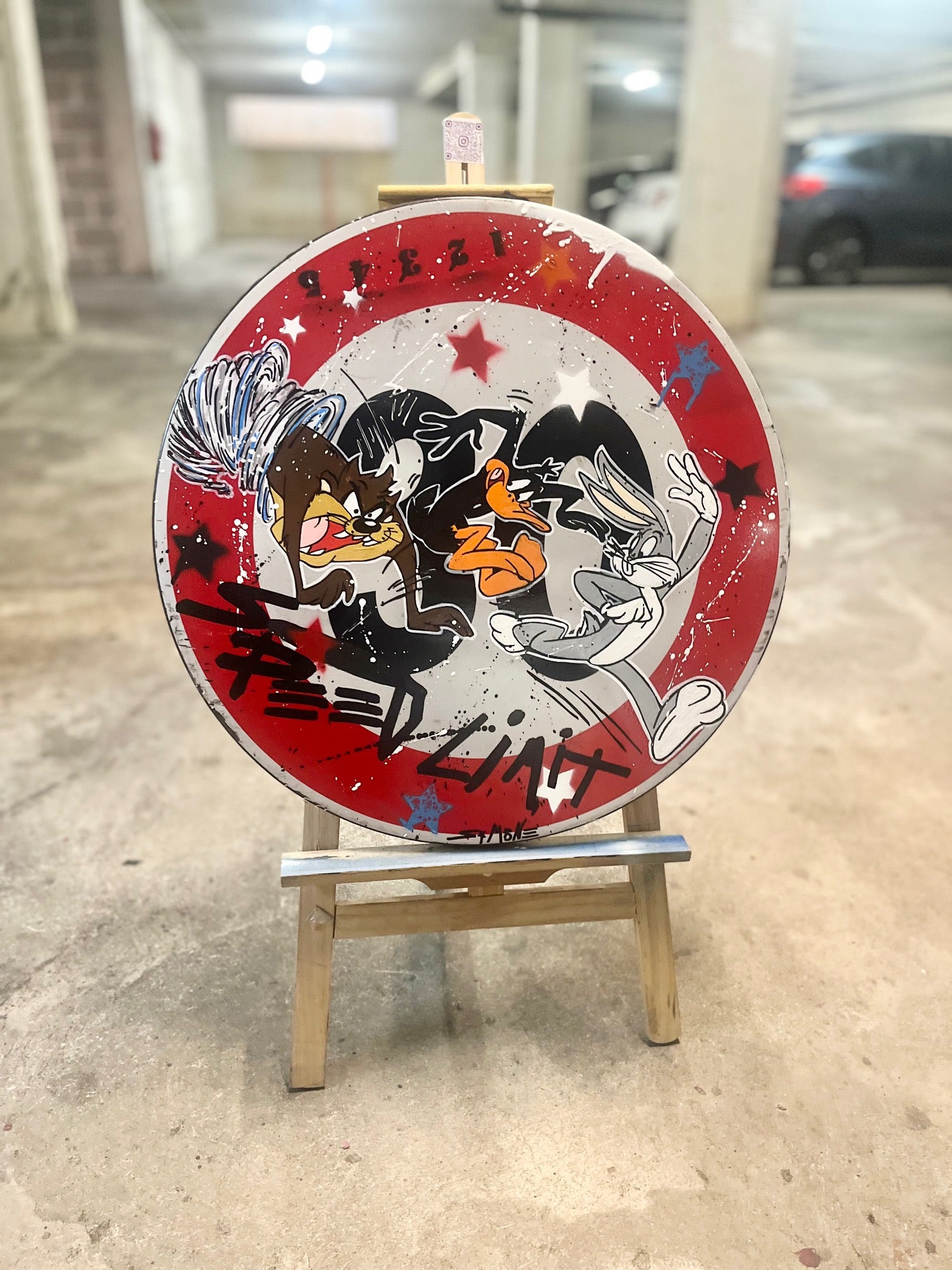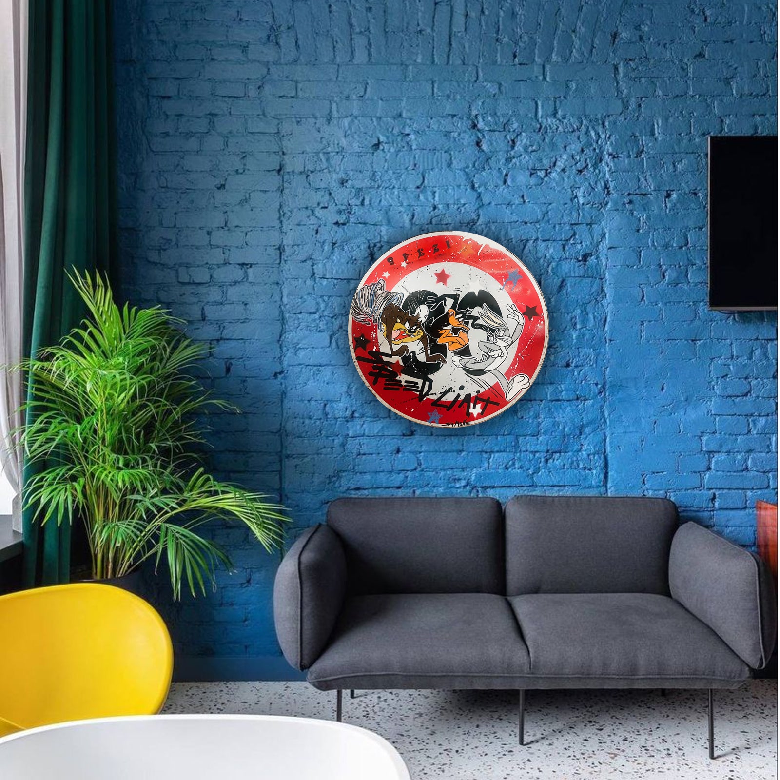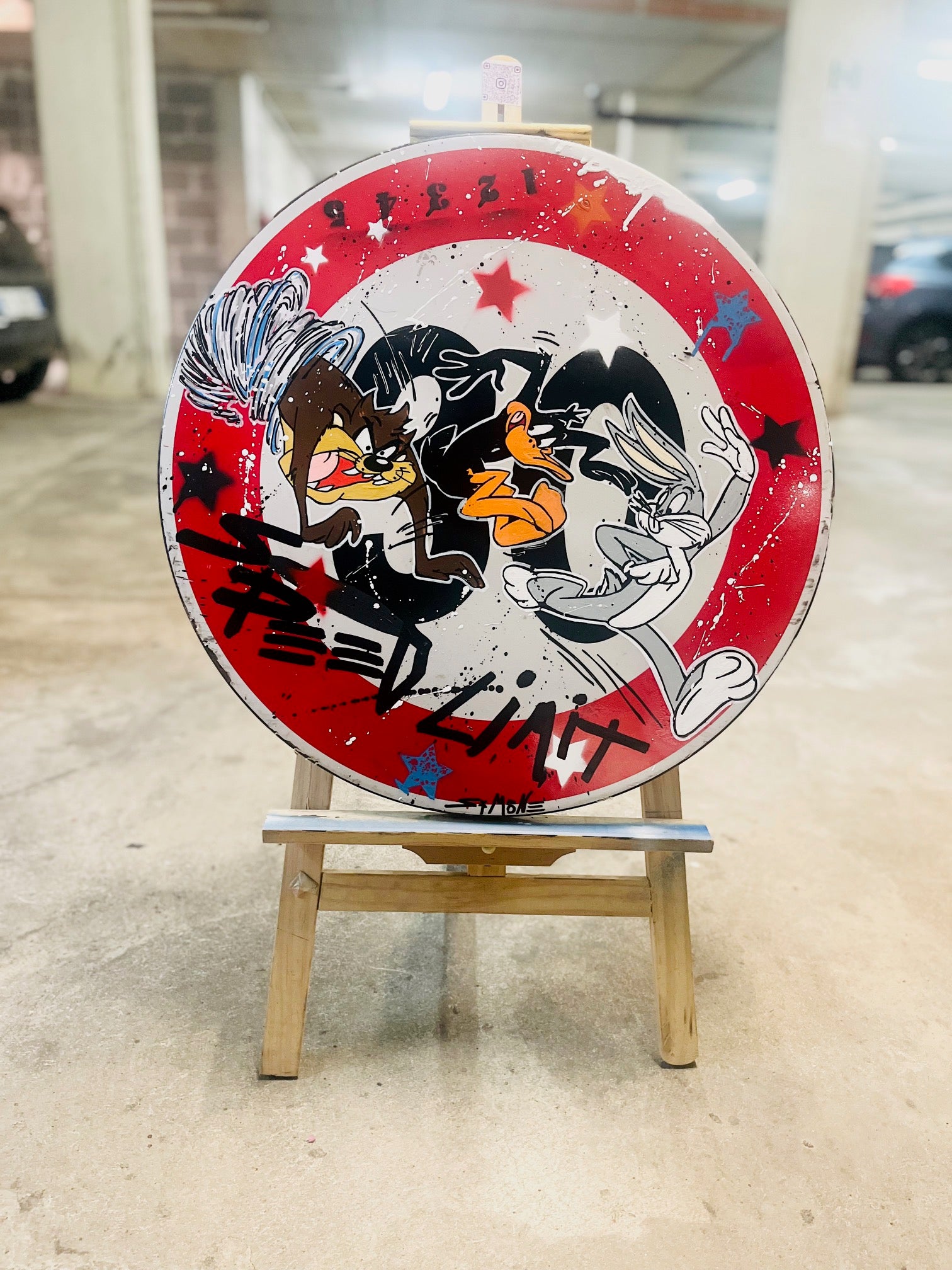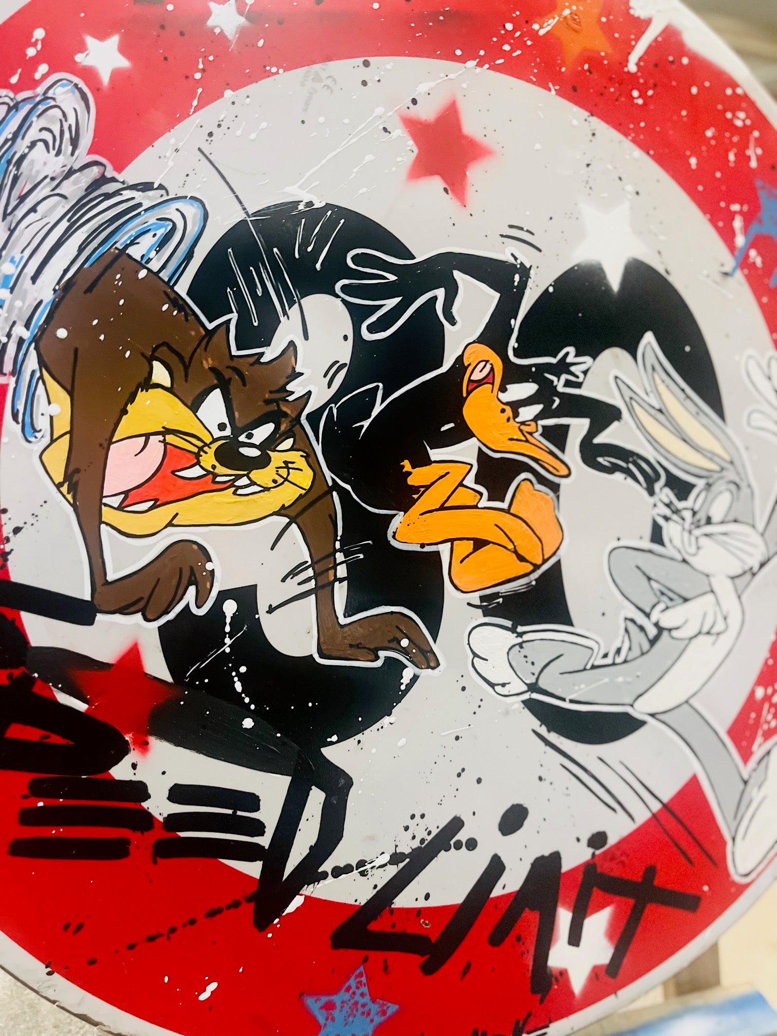 Pop Art, Looney Tunes Art, Street Art, Traffic Sign Art, Bugs Bunny Painting, Daffy Duck, Taz Devil, Urban Art, Simone De Rosa, Reclaimed Materials, Upcycled Art, Hand-Painted Metal Art, Italian Artist, Unique Wall Art, Contemporary Art, Collector Piece, Cartoon-Inspired Art, Modern Pop Culture Art