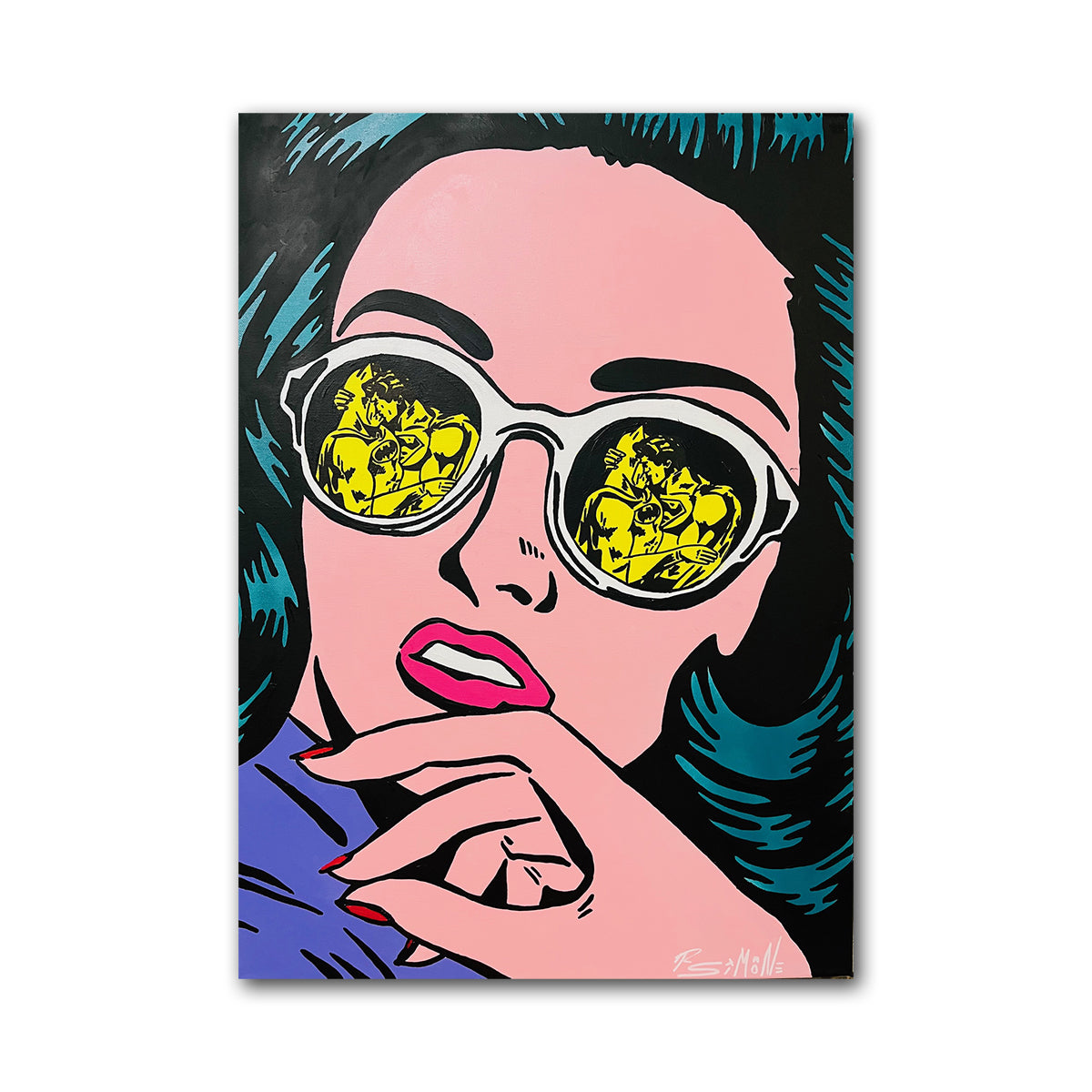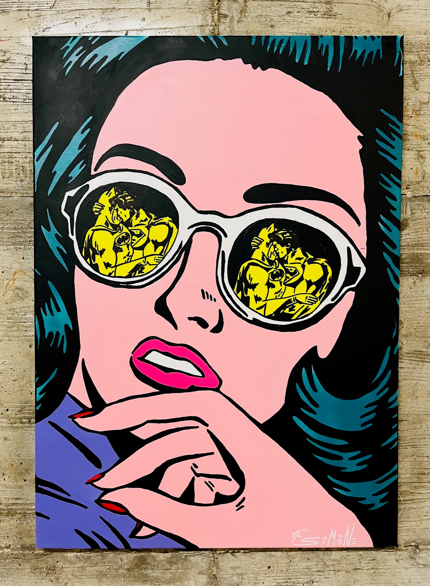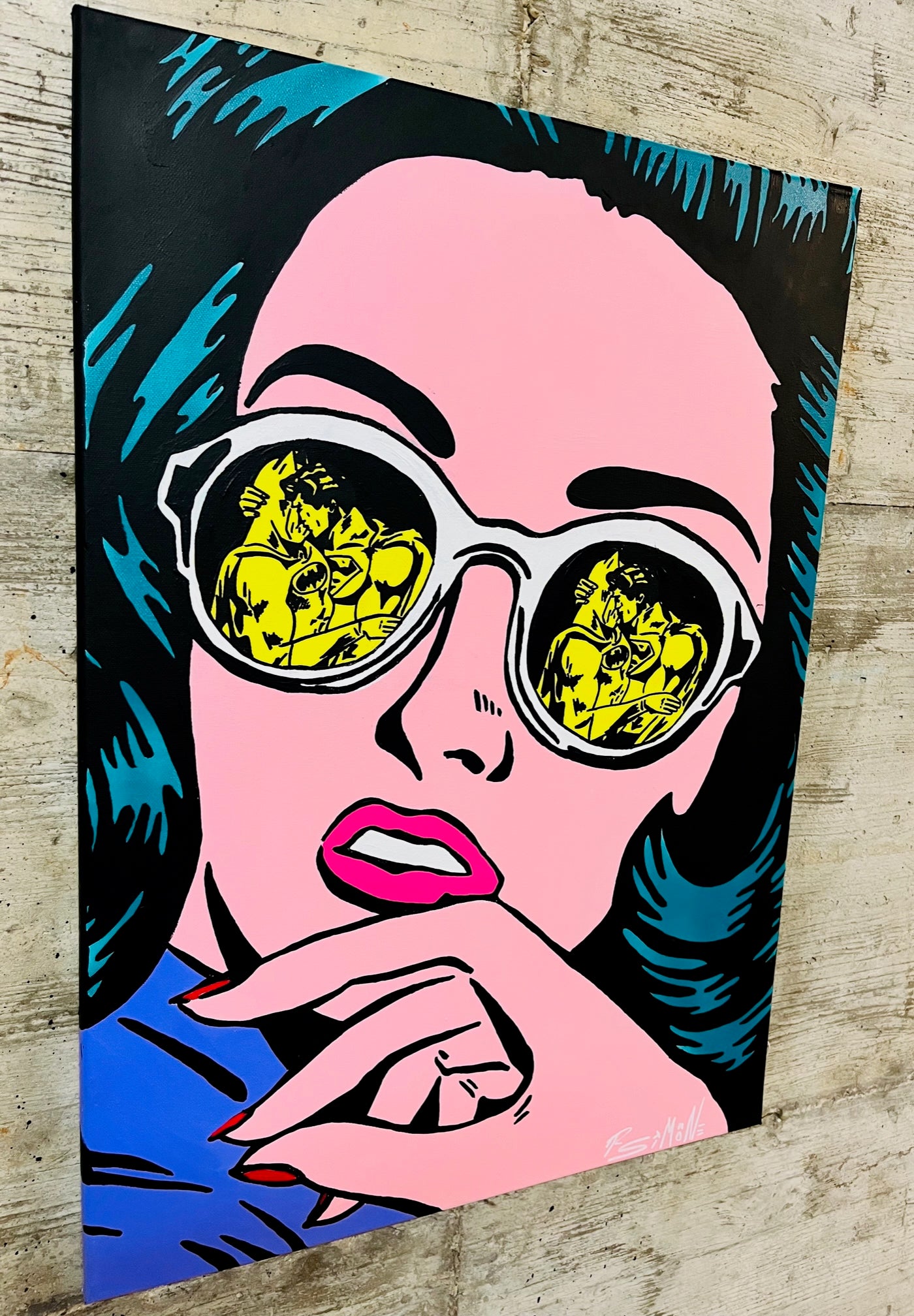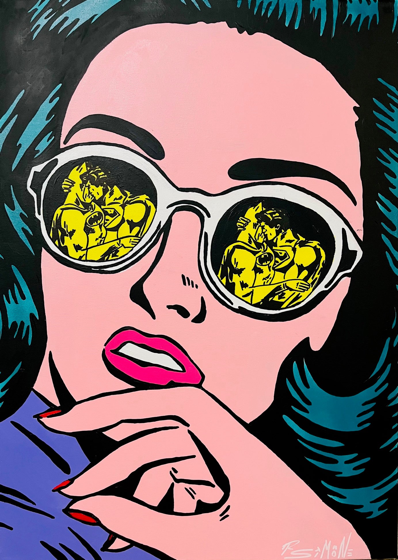 Kunstwerk des italienischen Künstlers, mit Acrylfarben bemalt und durch eine transparente Schicht geschützt, die dem Werk Glanz und Spektakel verleiht. In der Arbeit wird eine schöne Frau dargestellt, die verblüfft ist, eine reale Situation zwischen Superman und Batman zu sehen.