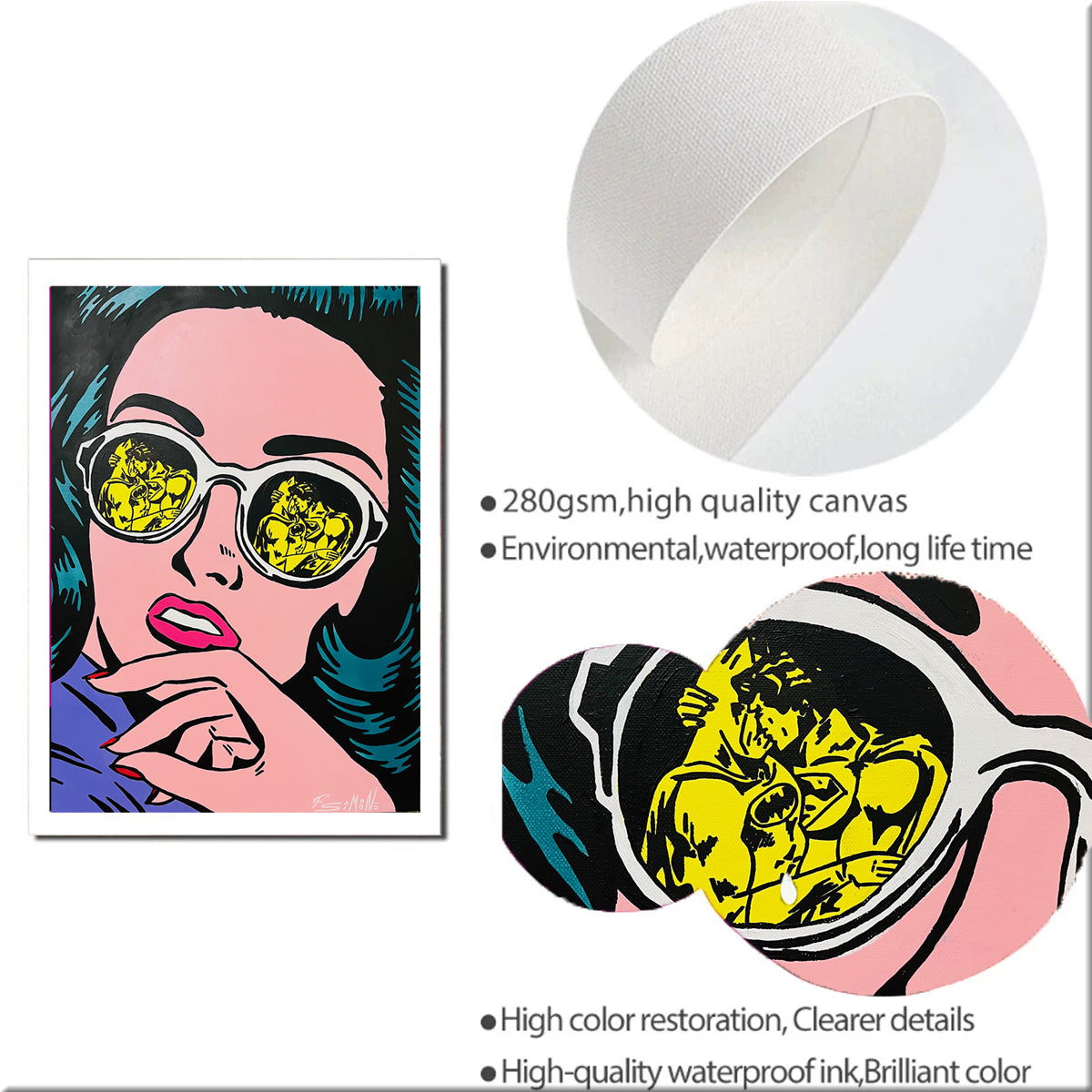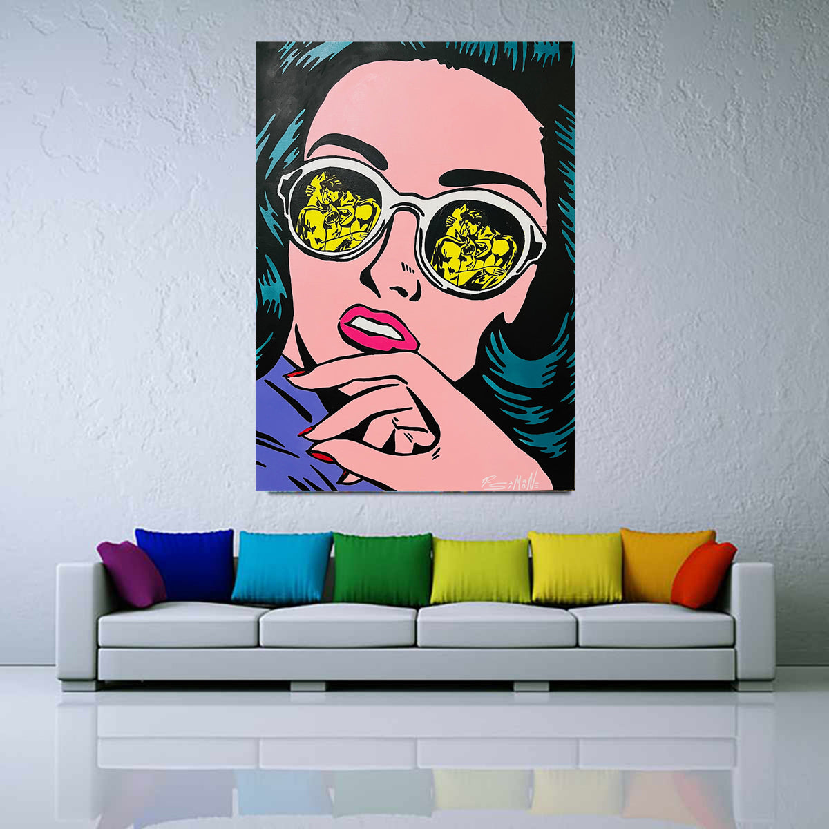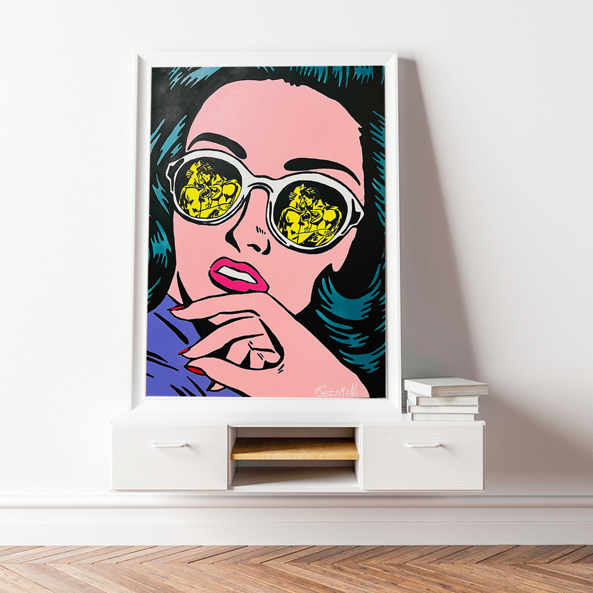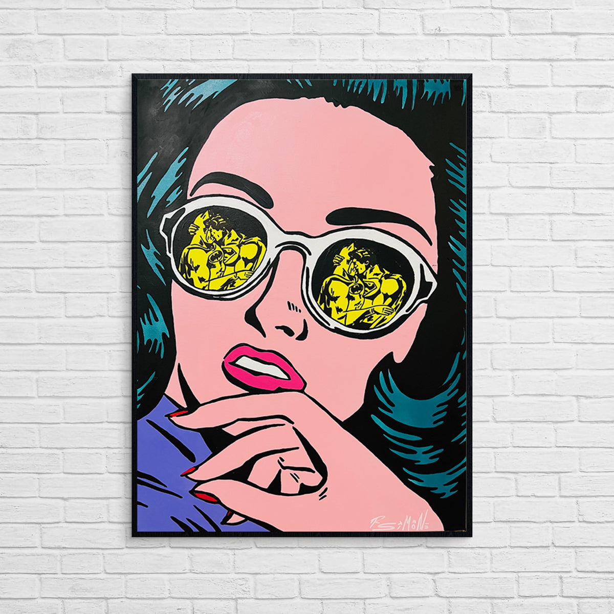 Kunstwerk des italienischen Künstlers, mit Acrylfarben bemalt und durch eine transparente Schicht geschützt, die dem Werk Glanz und Spektakel verleiht. In der Arbeit wird eine schöne Frau dargestellt, die verblüfft ist, eine reale Situation zwischen Superman und Batman zu sehen.