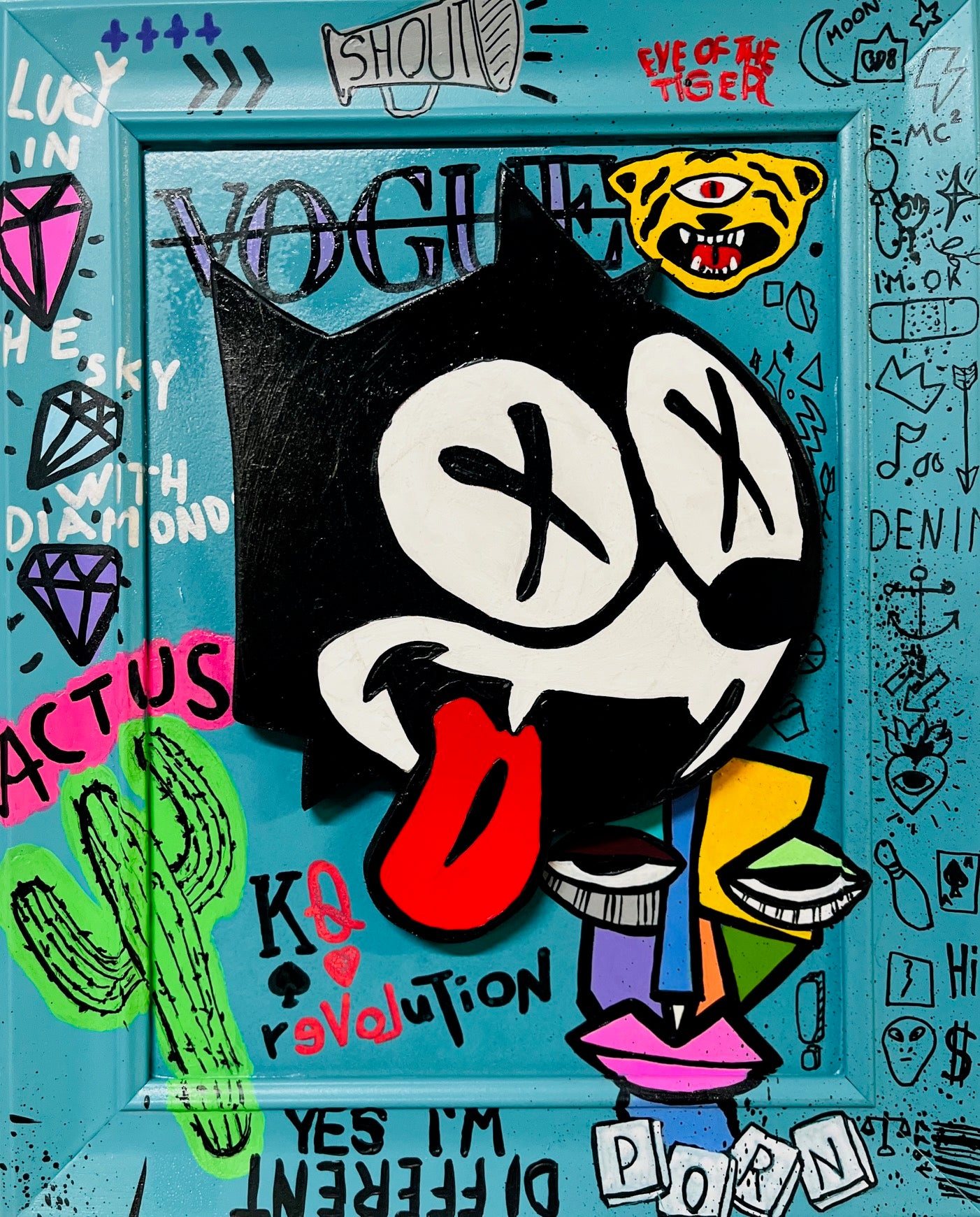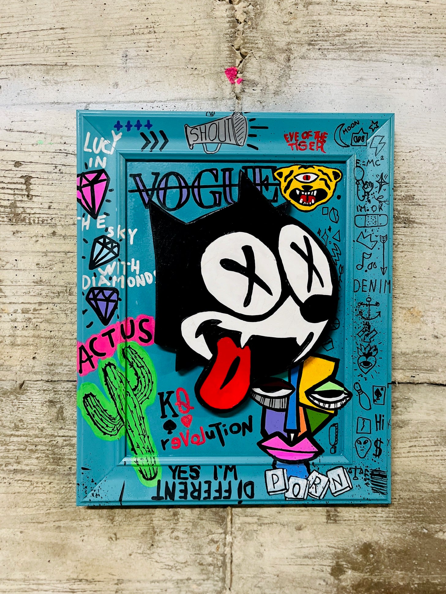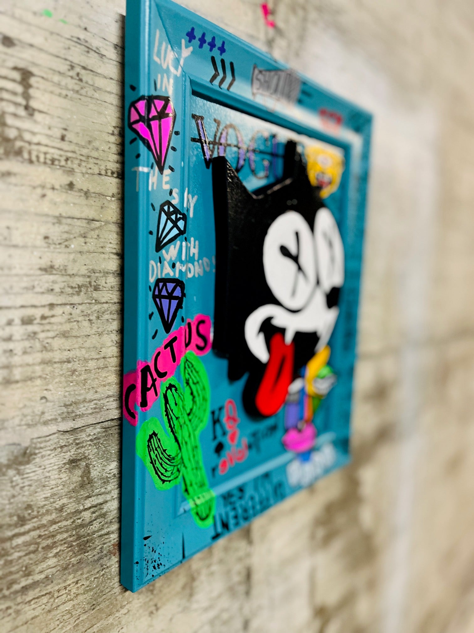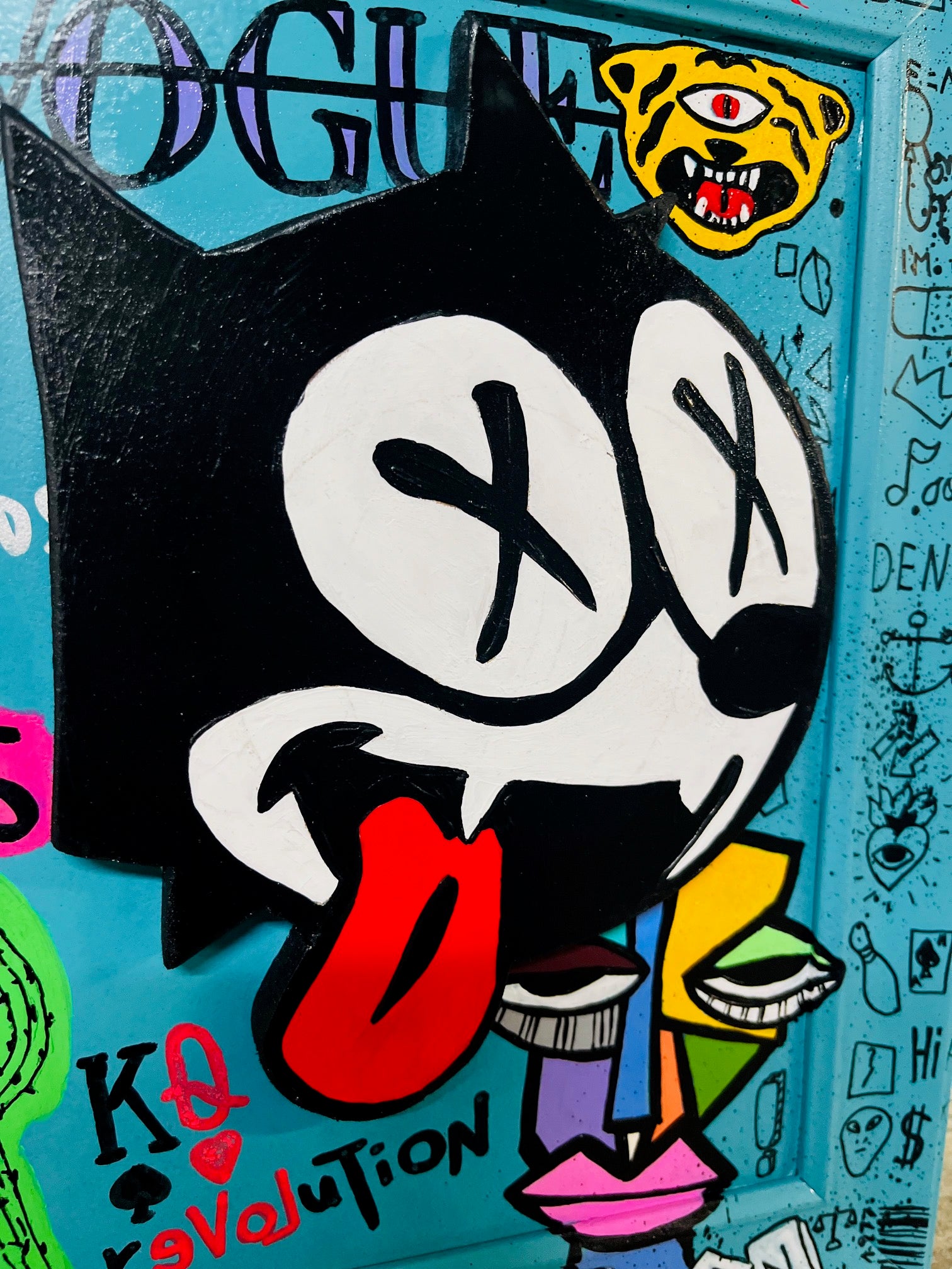 Crazy Felix is a artwork created by the Italian artist Simone De Rosa, wooden frame, felix the cat in a crazy street version, drawn and carved by hand. Acrylic colors give light and vibrancy to the artwork."Each part of has been drawn, carved and colored by hand."