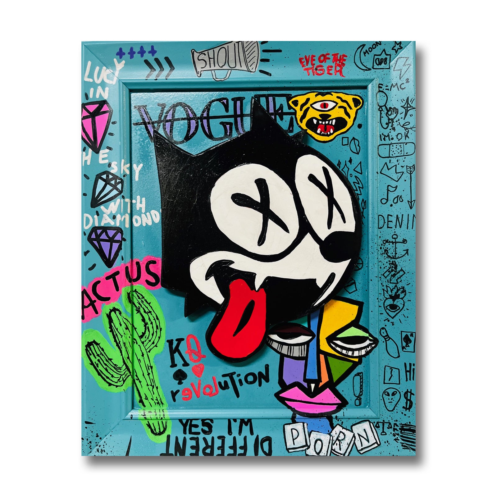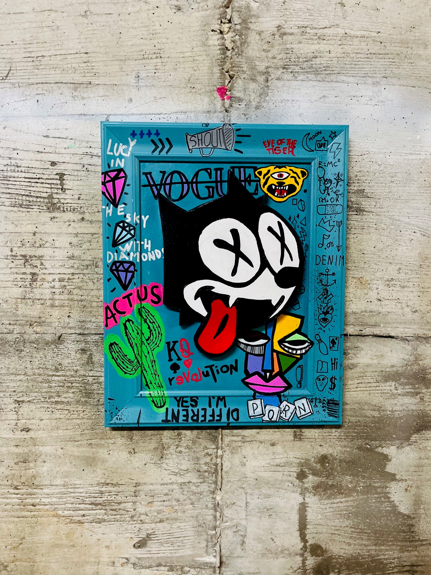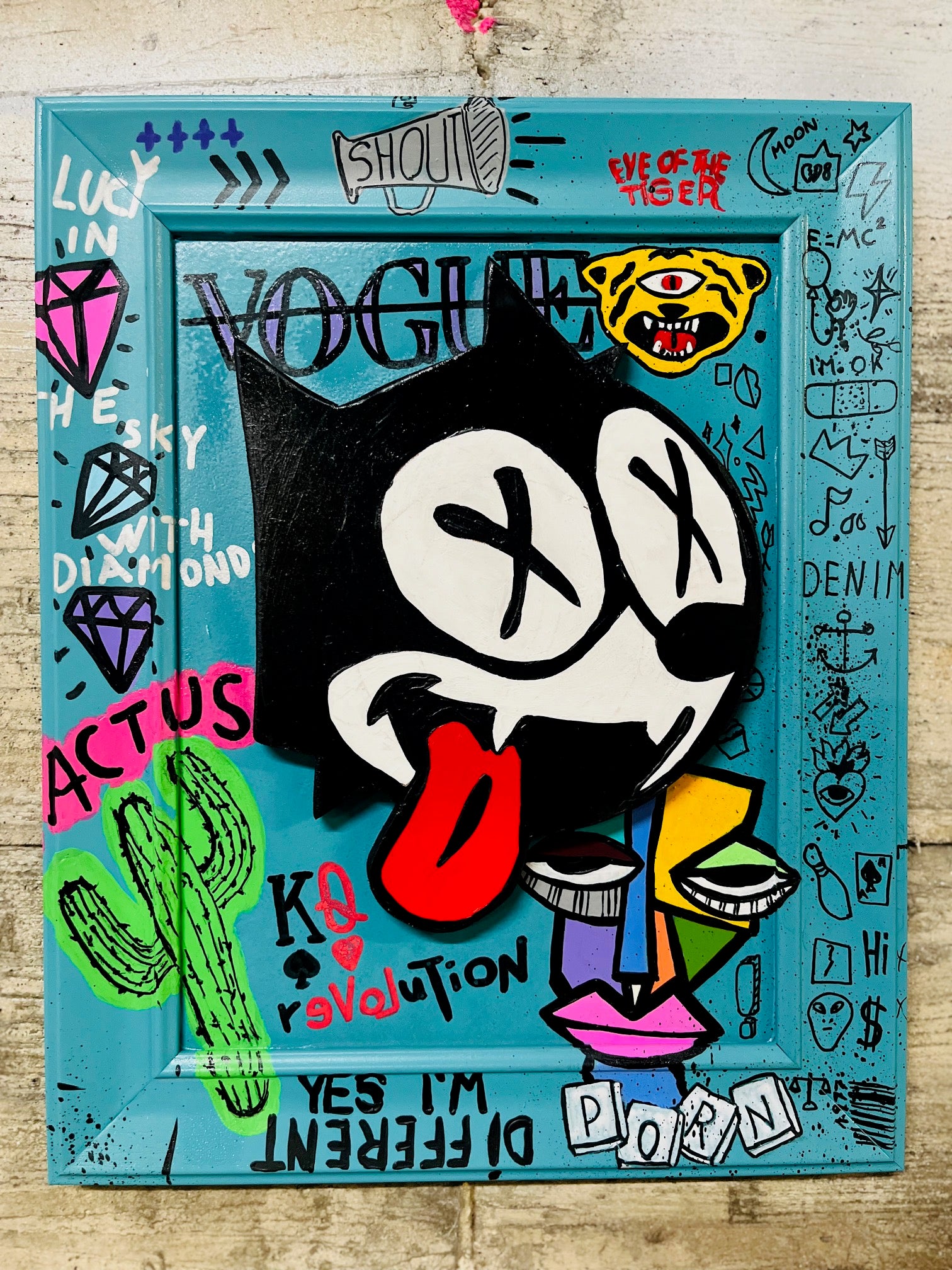 Crazy Felix is a artwork created by the Italian artist Simone De Rosa, wooden frame, felix the cat in a crazy street version, drawn and carved by hand. Acrylic colors give light and vibrancy to the artwork."Each part of has been drawn, carved and colored by hand."