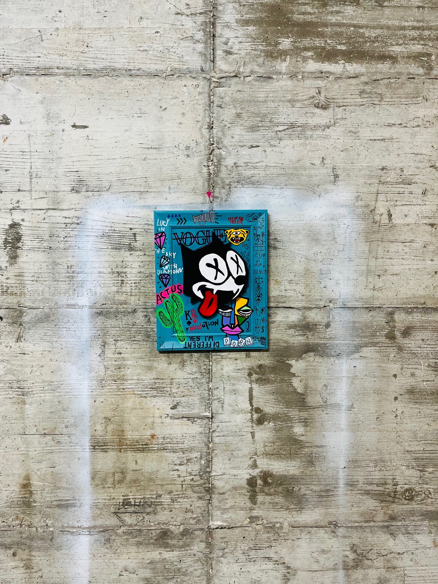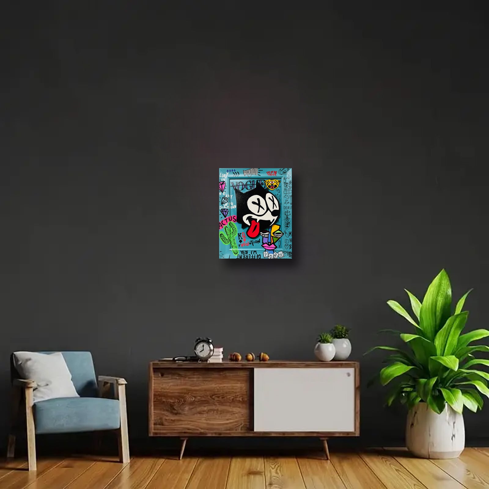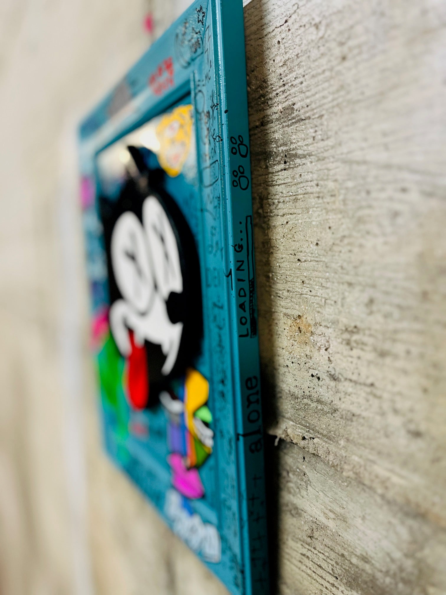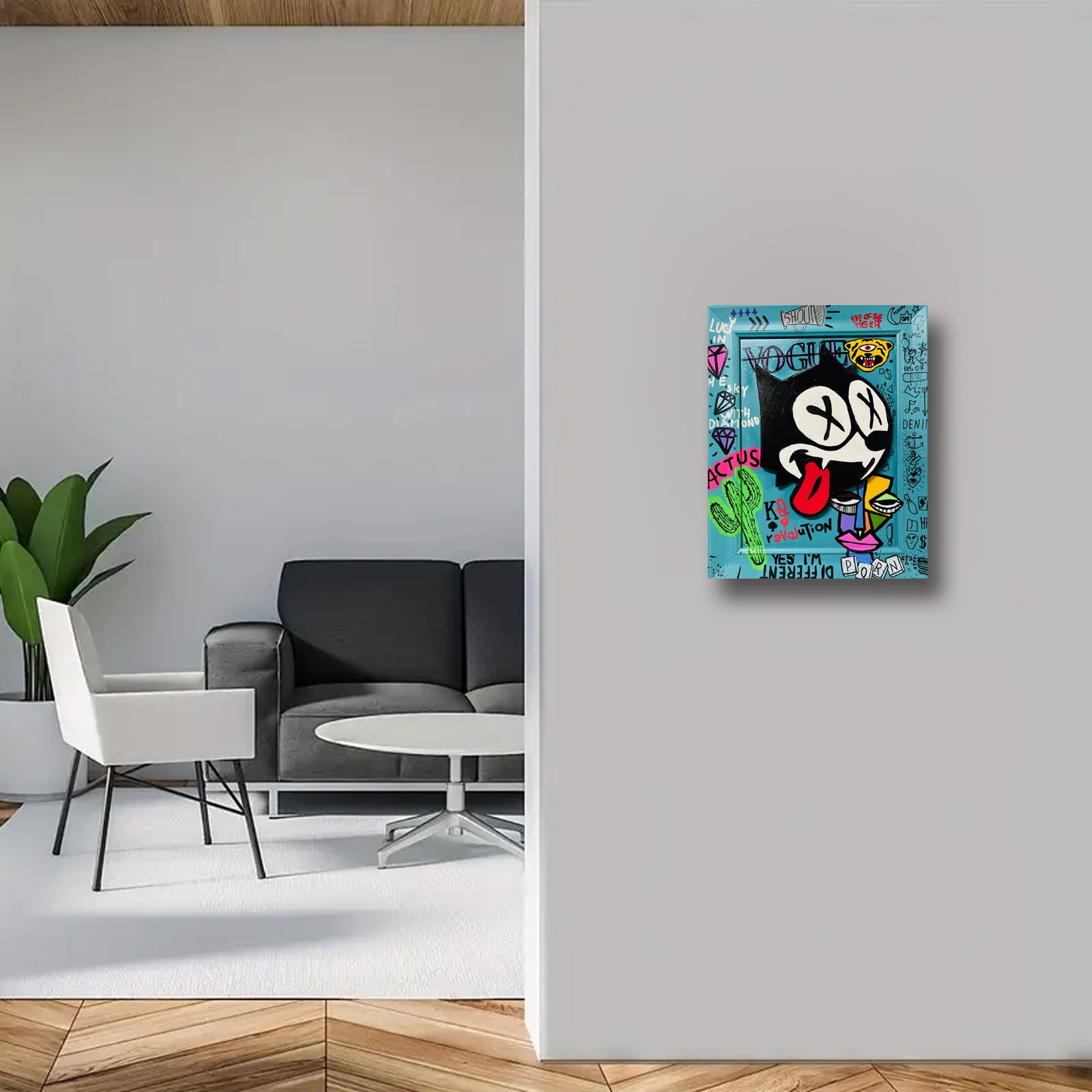Crazy Felix is a artwork created by the Italian artist Simone De Rosa, wooden frame, felix the cat in a crazy street version, drawn and carved by hand. Acrylic colors give light and vibrancy to the artwork."Each part of has been drawn, carved and colored by hand."