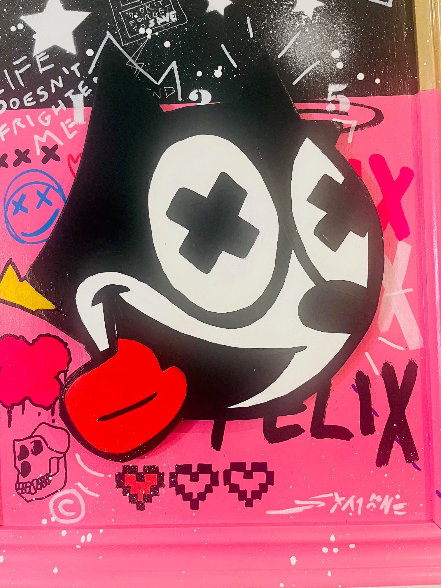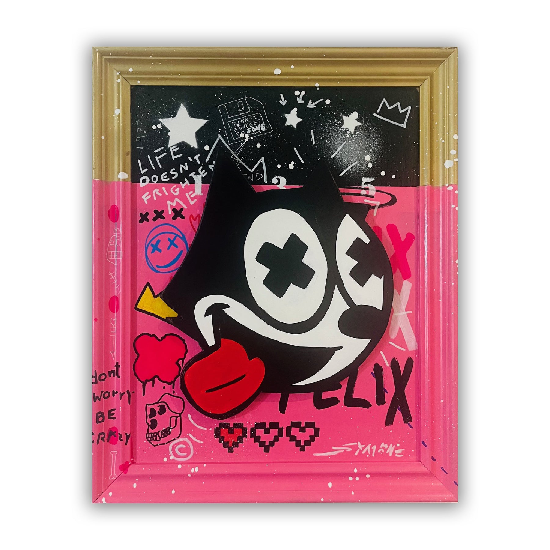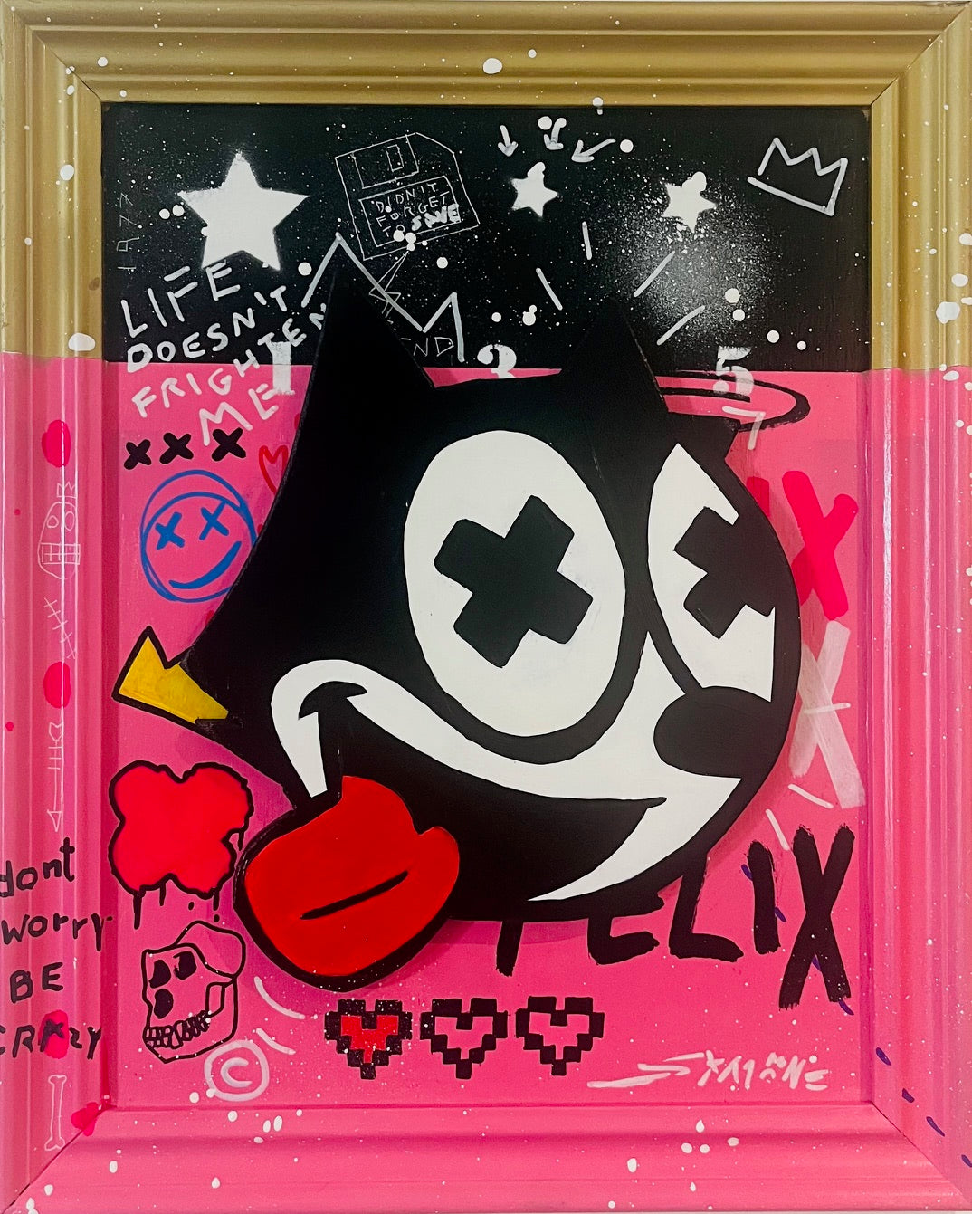 De Rosa’s interpretation of Felix the Cat is both nostalgic and provocative: the iconic cartoon figure is recast with cross-eyed irreverence, a lolling tongue, and bold graphic symbols scattered across the canvas. The split-tone background — blending raw street energy with digital-age motifs — amplifies the sense of rebellious joy and emotional tension.