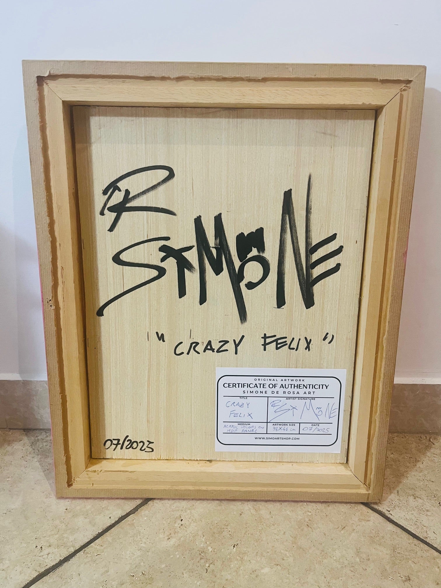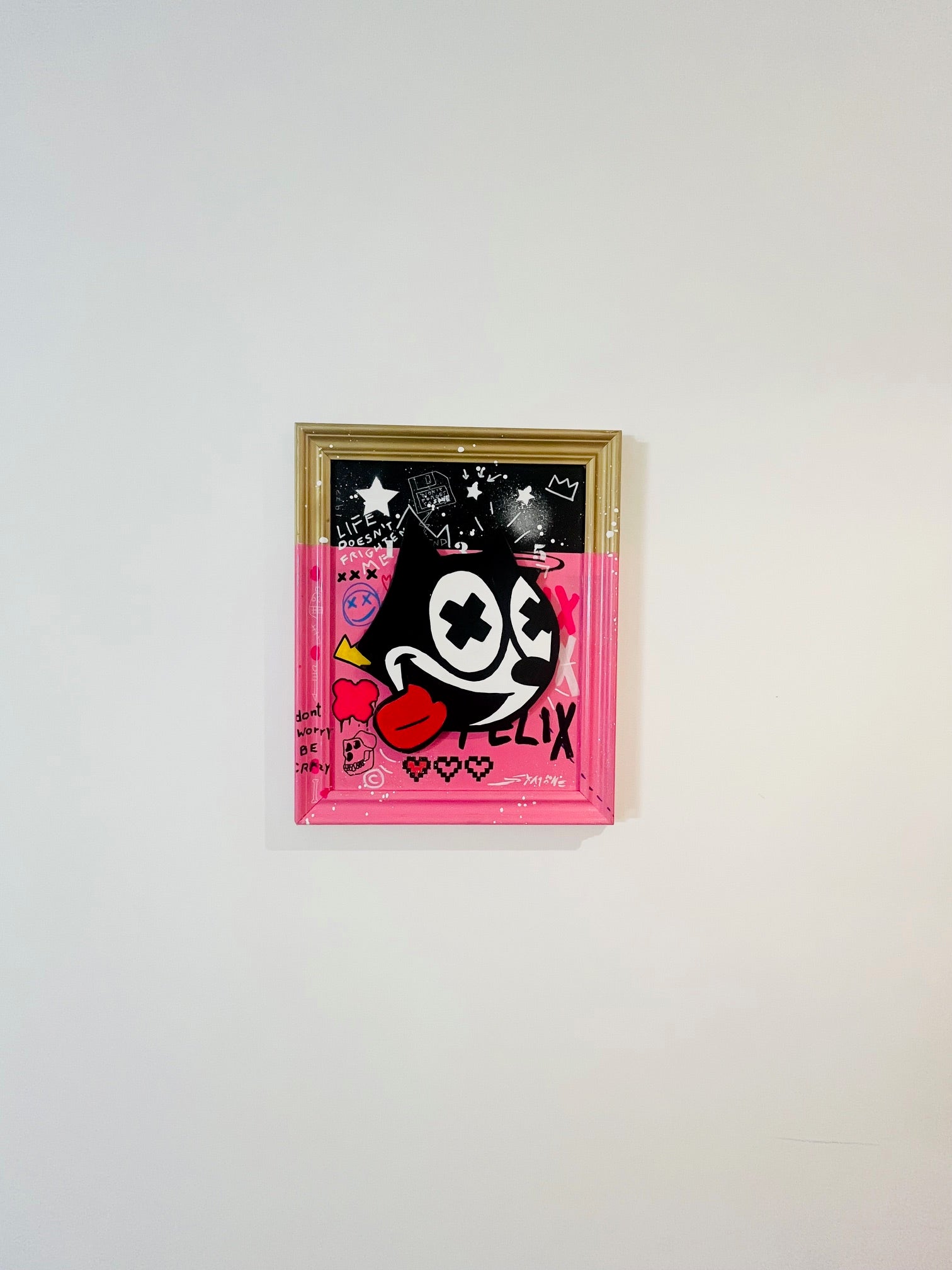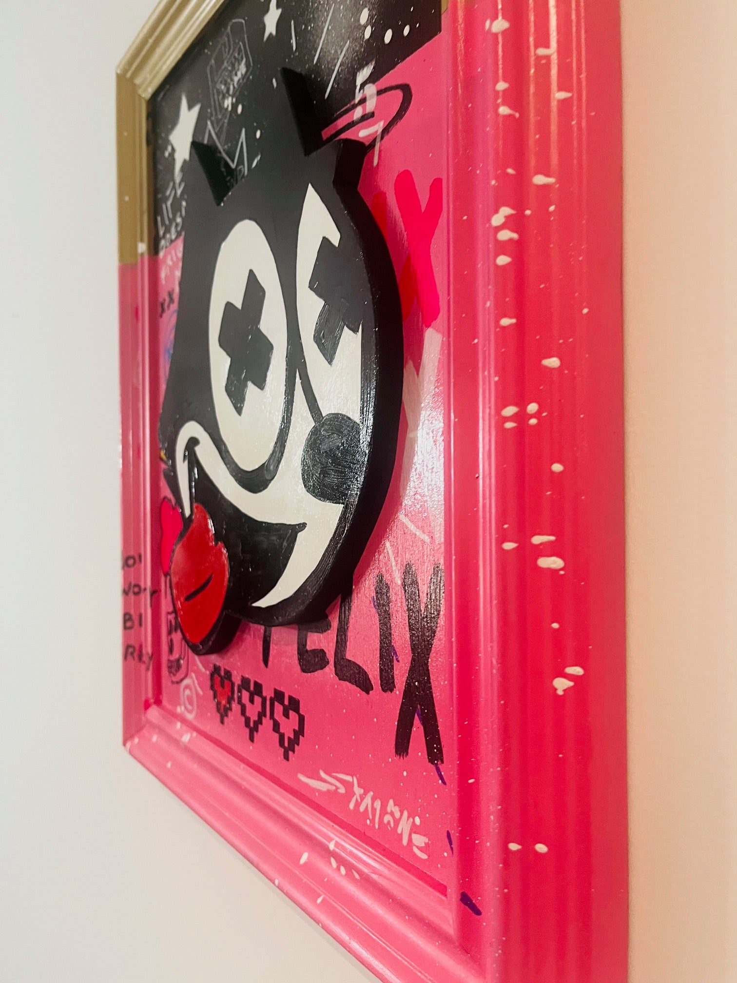 Crazy Felix by Simone De Rosa is a striking example of neo-pop expression — a vibrant, mixed-media artwork that redefines a beloved cultural icon through the lens of urban art. Hand-cut from MDF and finished with dynamic layers of acrylic and spray paint, the piece balances playful chaos with meticulous craftsmanship.