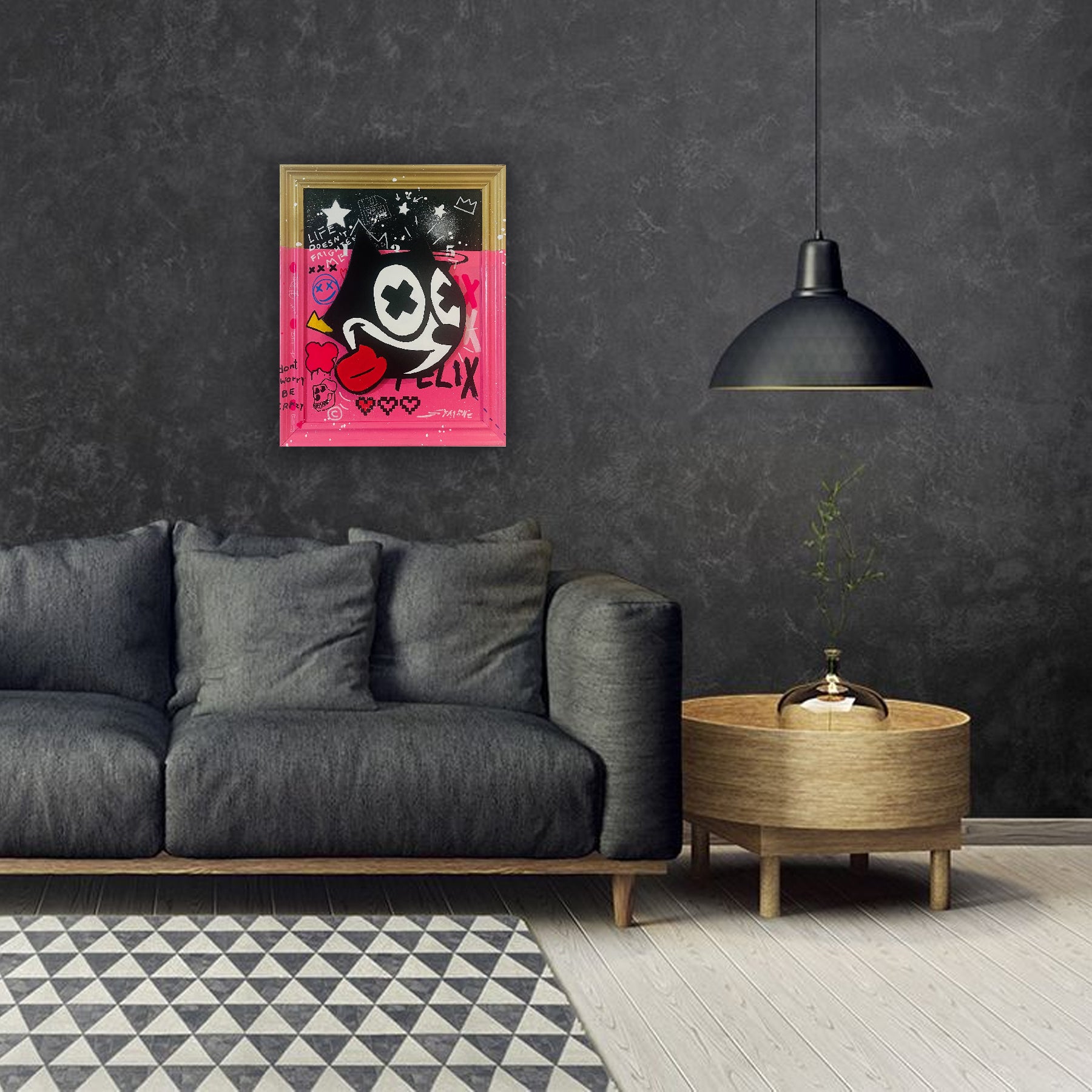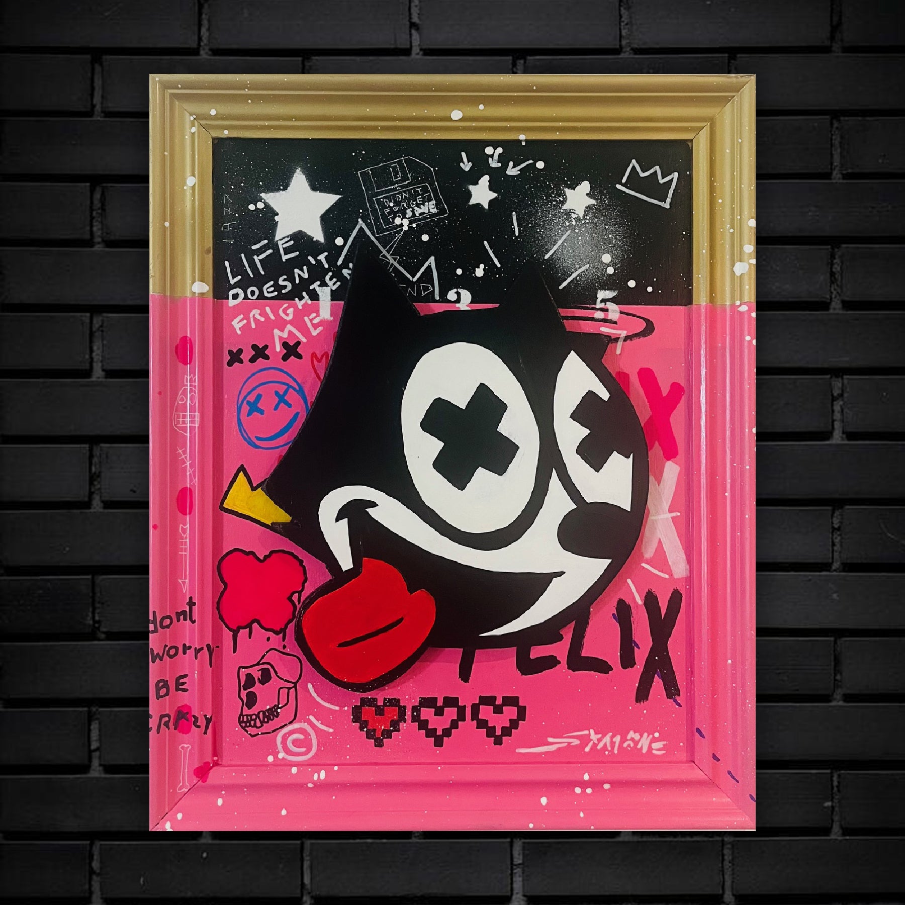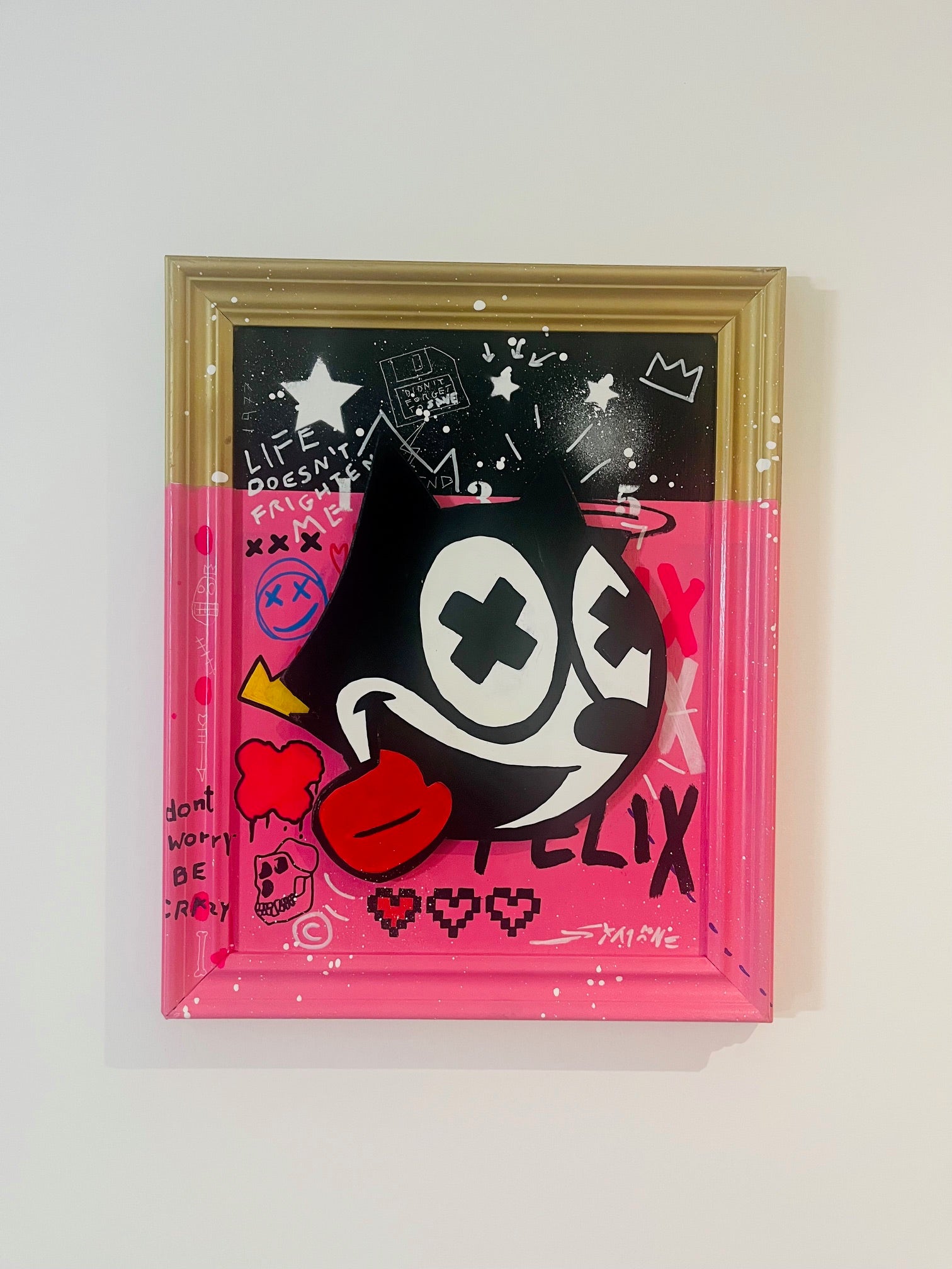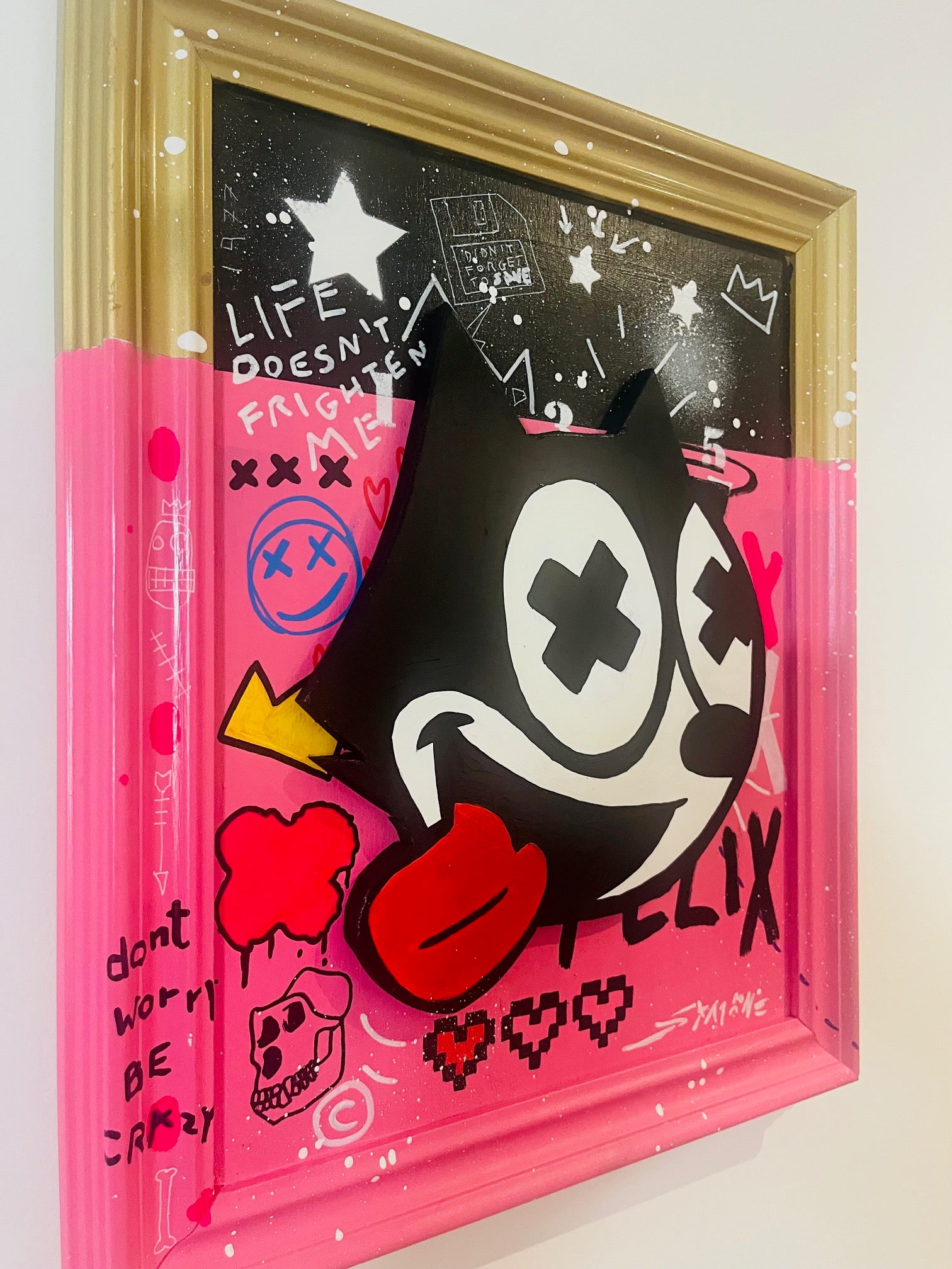Crazy Felix by Simone De Rosa is a striking example of neo-pop expression — a vibrant, mixed-media artwork that redefines a beloved cultural icon through the lens of urban art. Hand-cut from MDF and finished with dynamic layers of acrylic and spray paint, the piece balances playful chaos with meticulous craftsmanship.