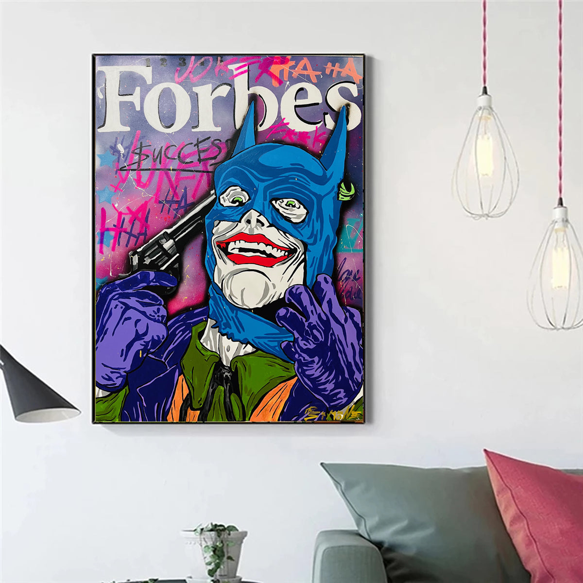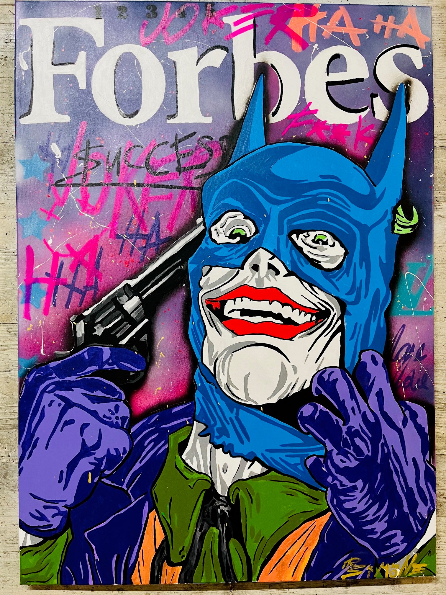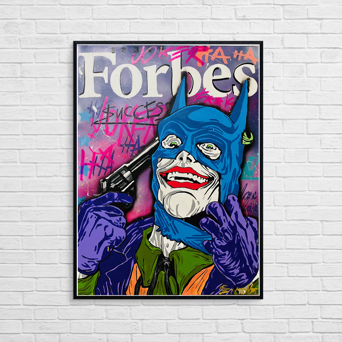 First work of 2024 - drawn and hand painted by Italian artist Simone De Rosa. In this artwork the artist represents Joker in one of the many acts of madness while he points the gun to his head while wearing a Batman mask. Forbes magazine is the only one to put all this madness on the front page. The background is pure street style