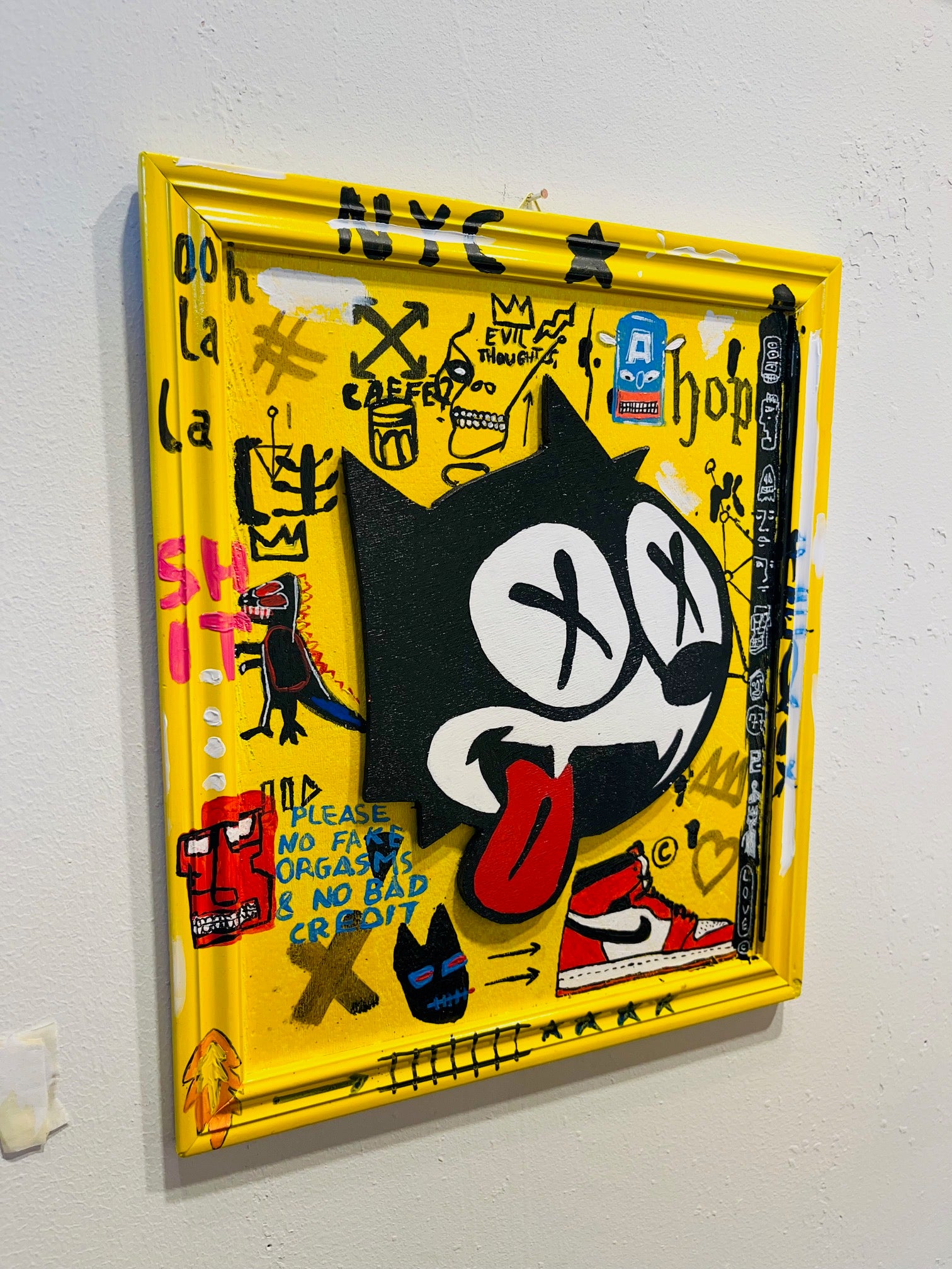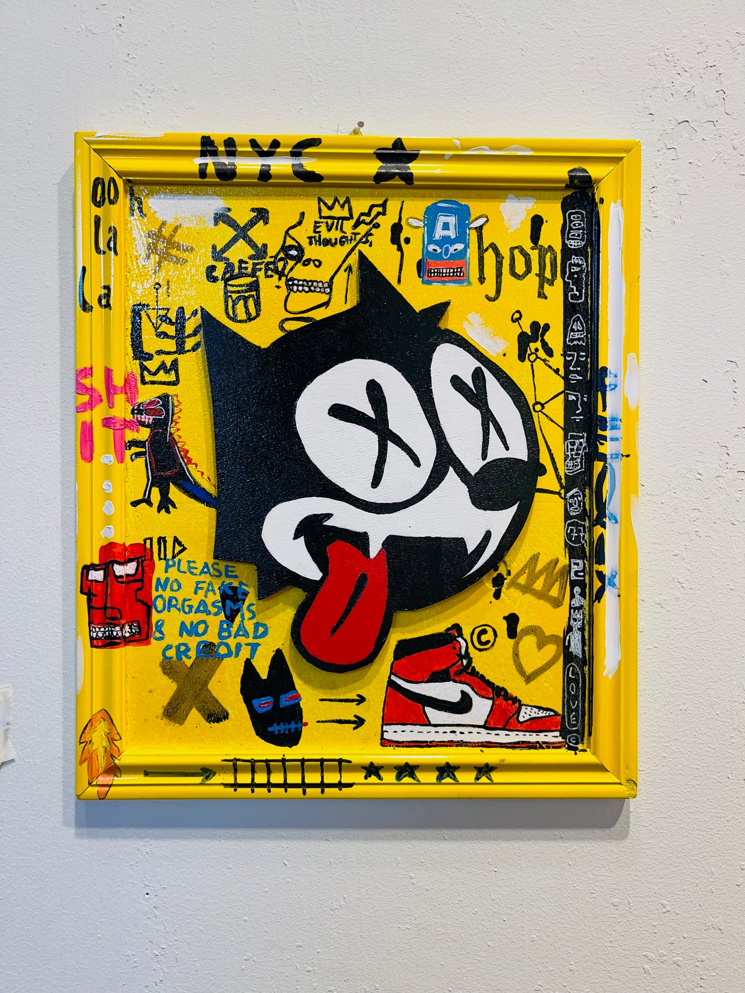 Felix the cat graffiti is a artwork created by the Italian artist Simone De Rosa, wooden frame, felix the cat street version, drawn and carved by hand. Acrylic colors give light and vibrancy to the artwork.