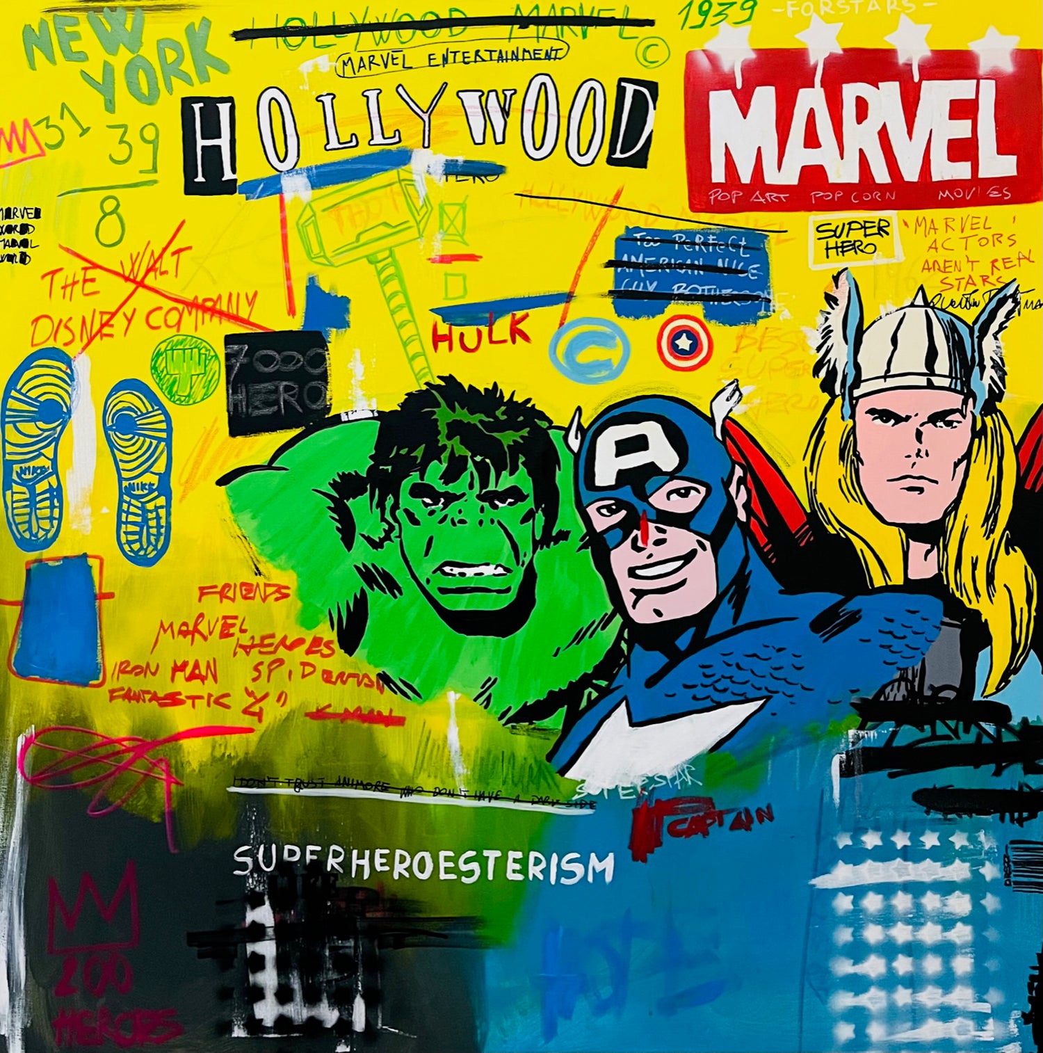 Dieses Gemälde ist eine Neuinterpretation des Kunstwerks der Hollywood Africans in einer Marvel-Welt mit Acrylfarben, Sprays, Filzstiften und Wachsfarben, alles im perfekten Basquiat-Stil.