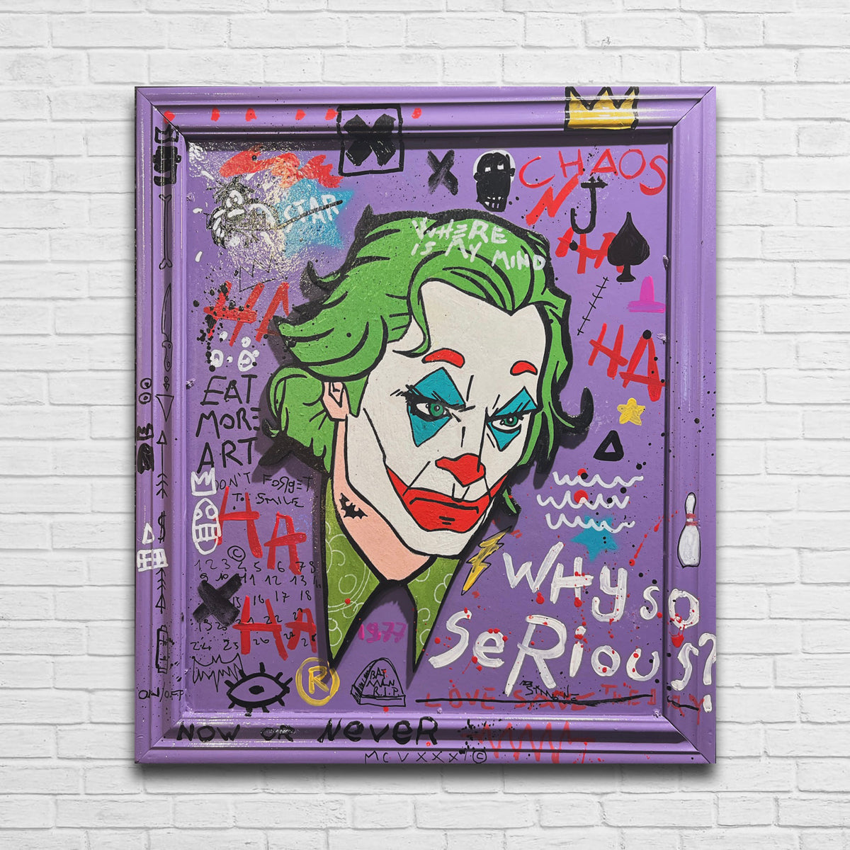 Joker in the purple is a artwork created by the Italian artist Simone De Rosa, wooden frame ispired to Joker, drawn and carved by hand. Acrylic colors give light and vibrancy to the artwork."Each part of the Joker has been drawn, carved and colored by hand."