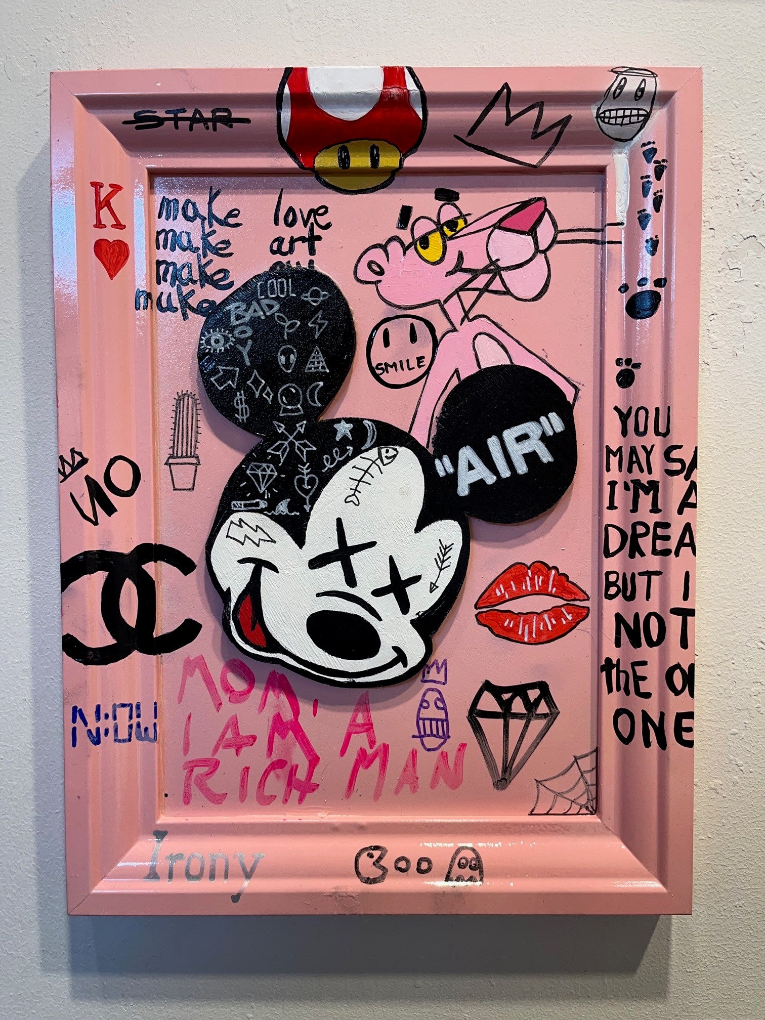 Street Monkey is a artwork created by the Italian artist Simone De Rosa, wooden frame, the Mickey Mouse street version, drawn and carved by hand. Acrylic colors give light and vibrancy to the artwork.