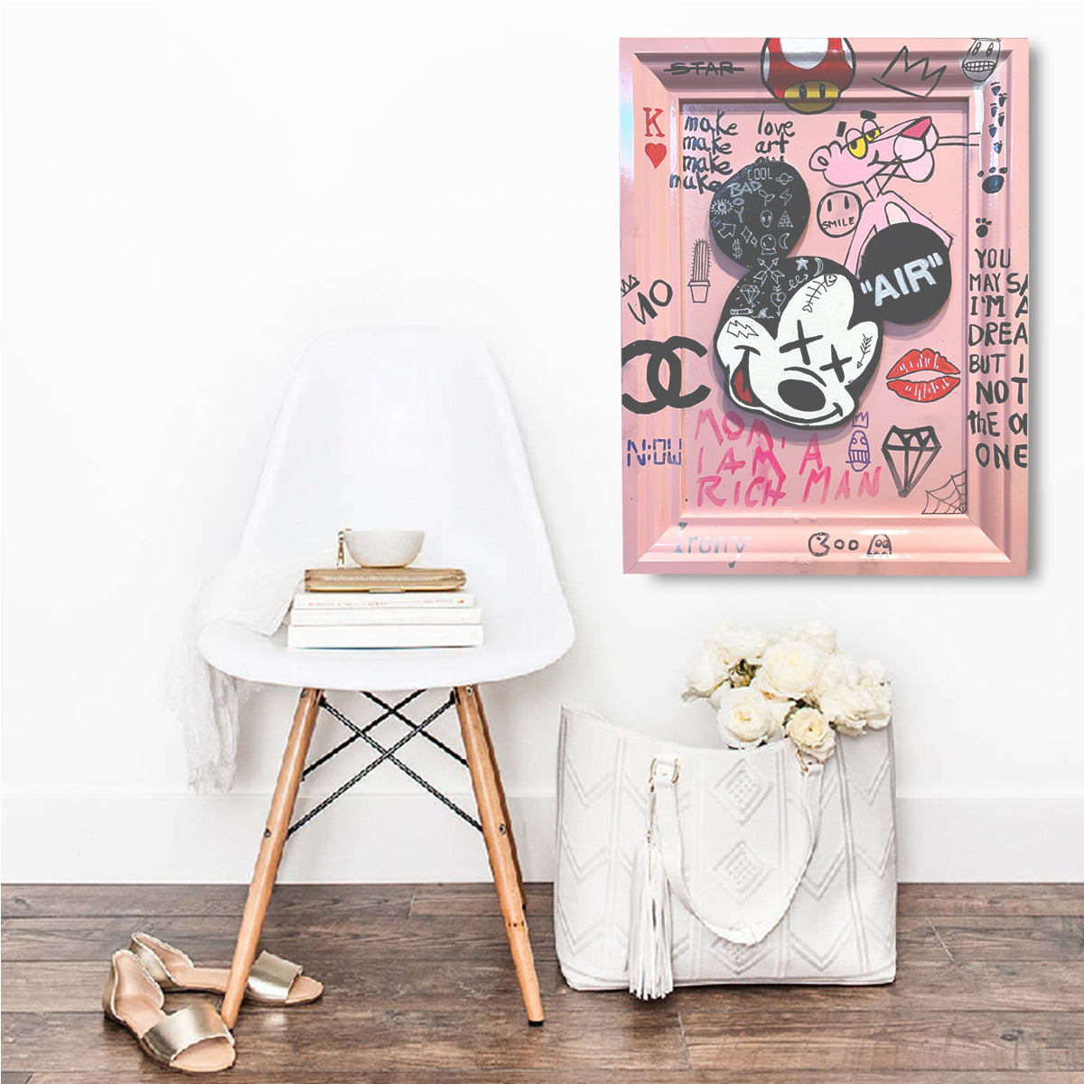 In the background is a white with a graffiti mix, a little tribute topink panther, chanel and more.