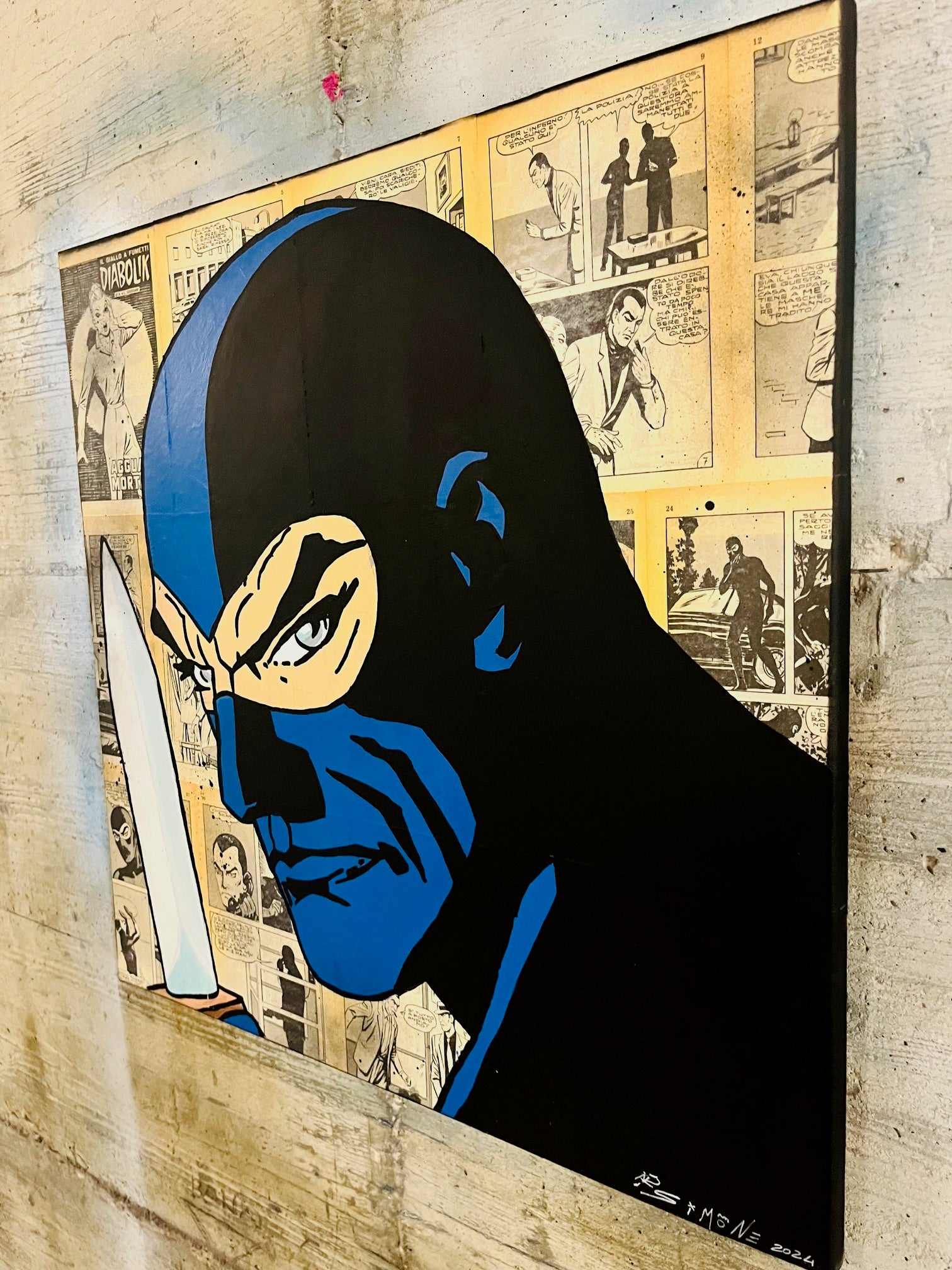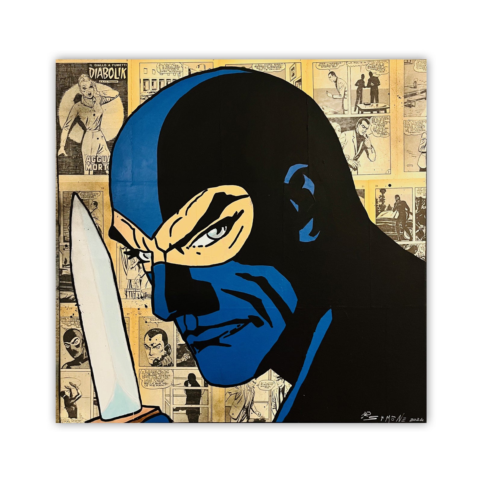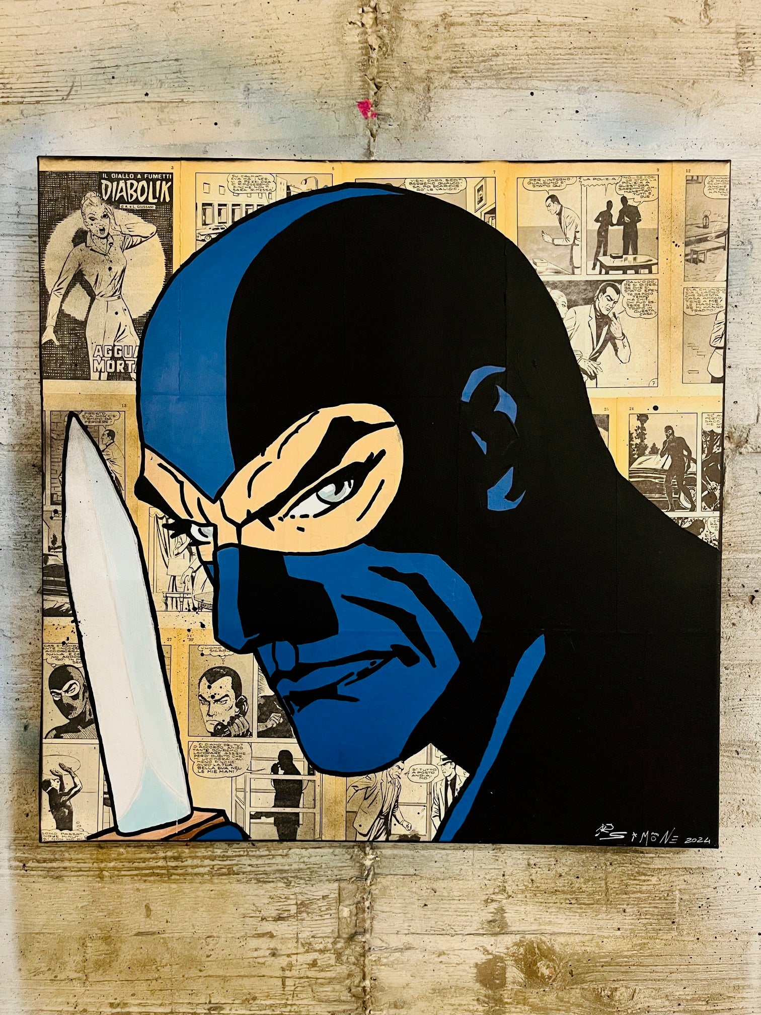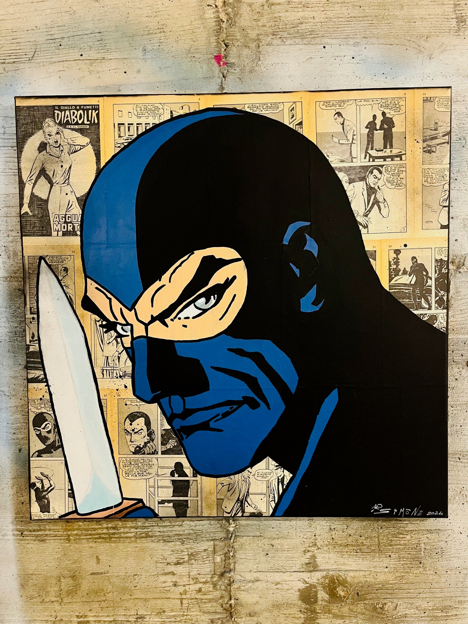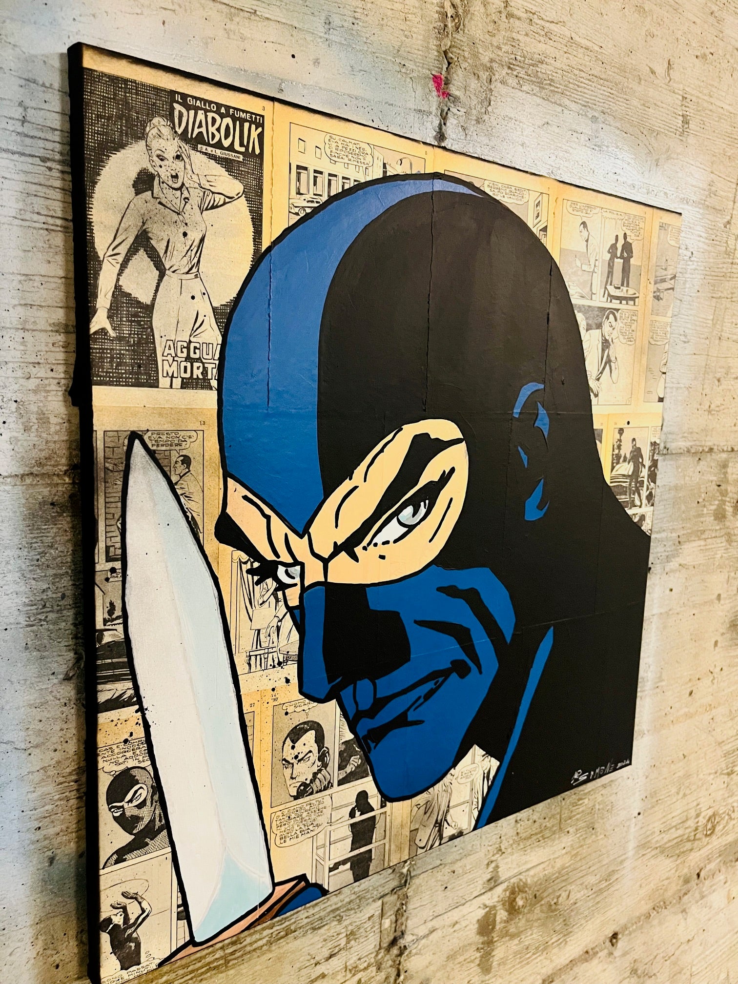The Artwork it's painted by the artist with acrylic colors, spray paints and protective paint to preserve the work of art. Bacckground is created by playng comics pages collage. The theme used by the artist refers to famous Diabolik - The King of Terror ready for a new adventure.