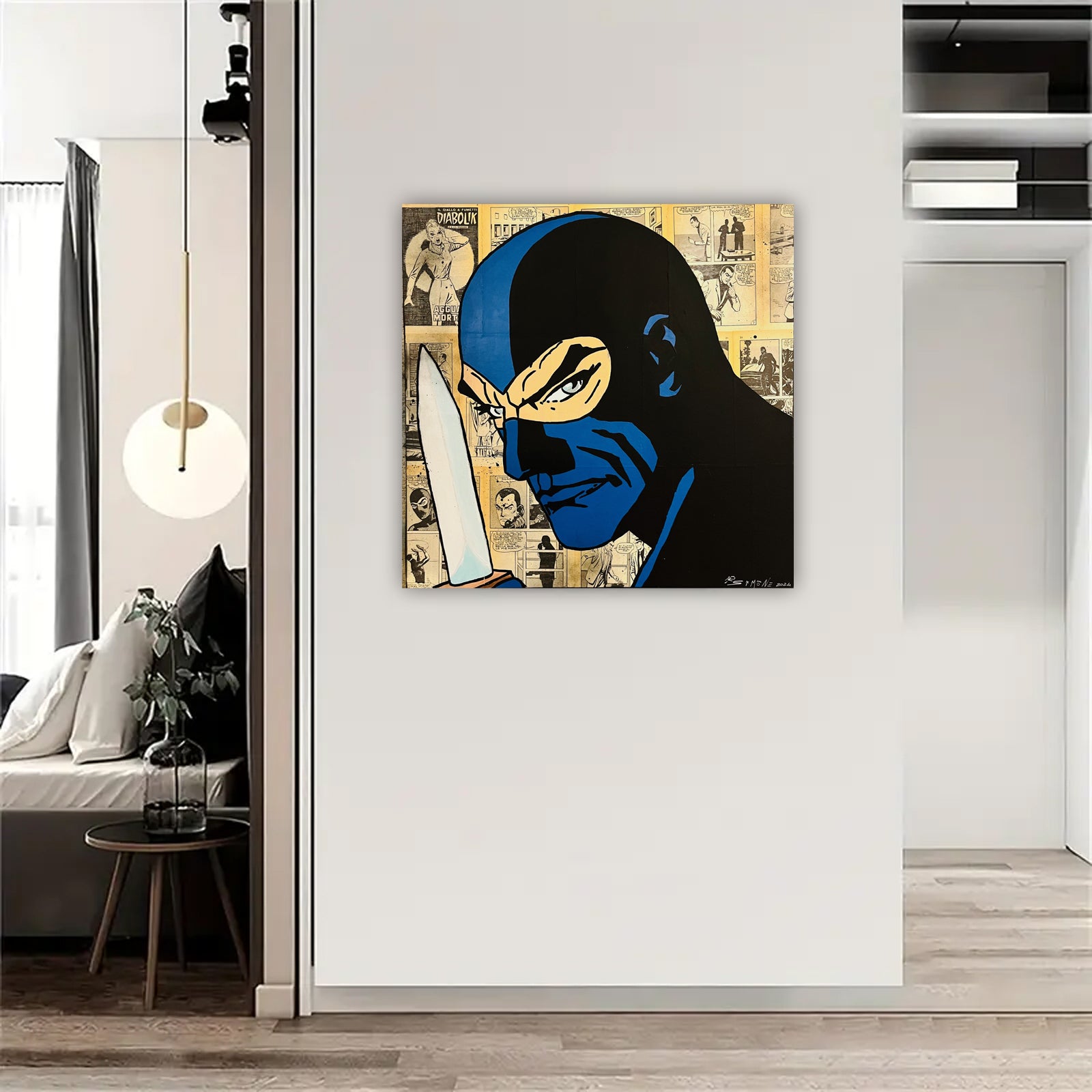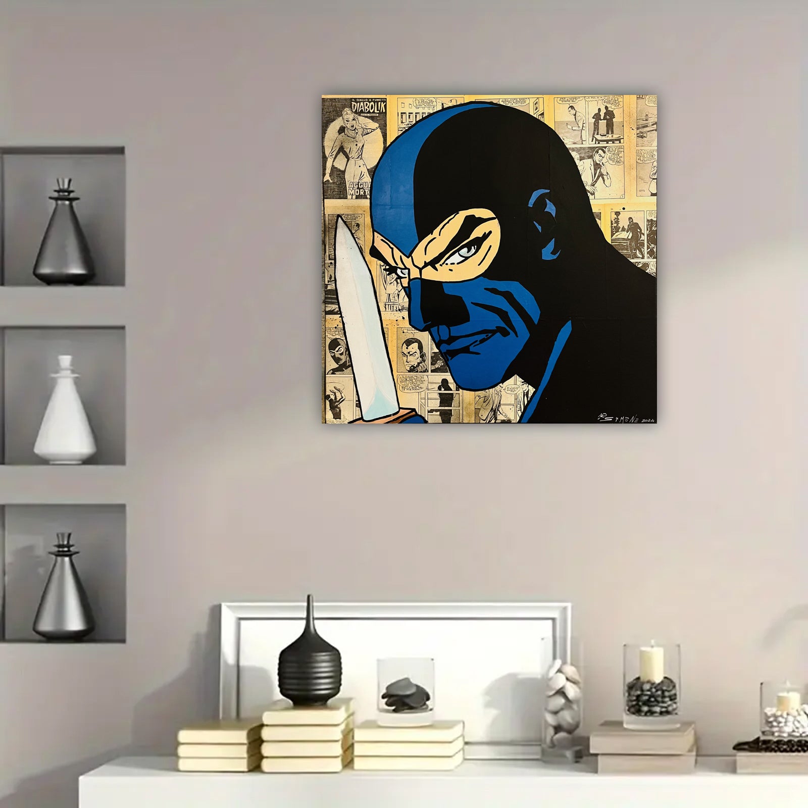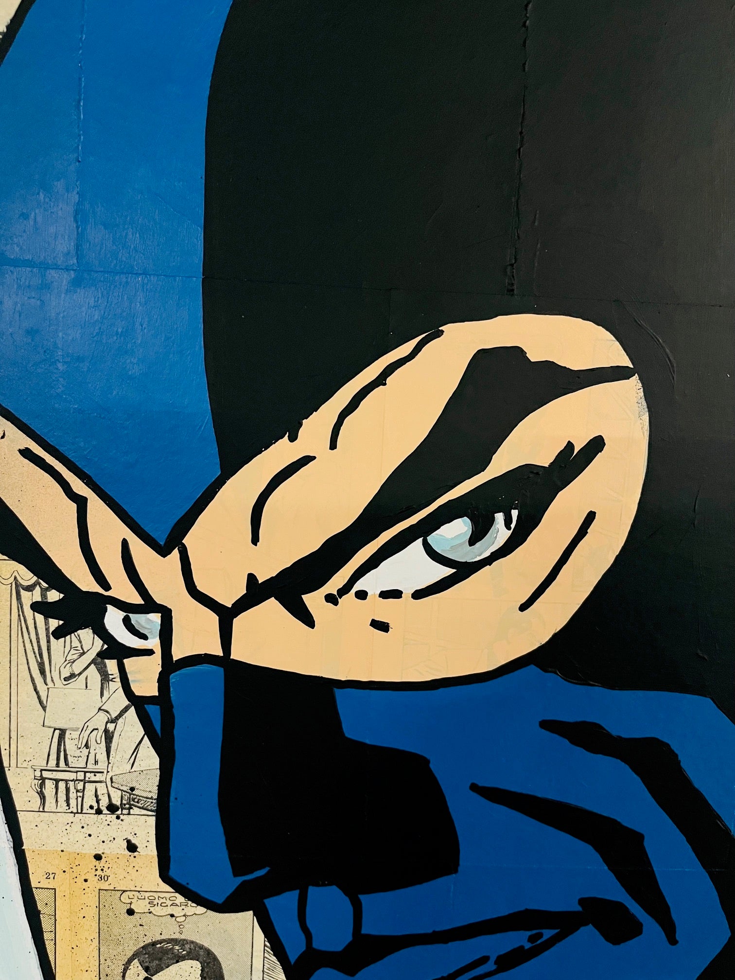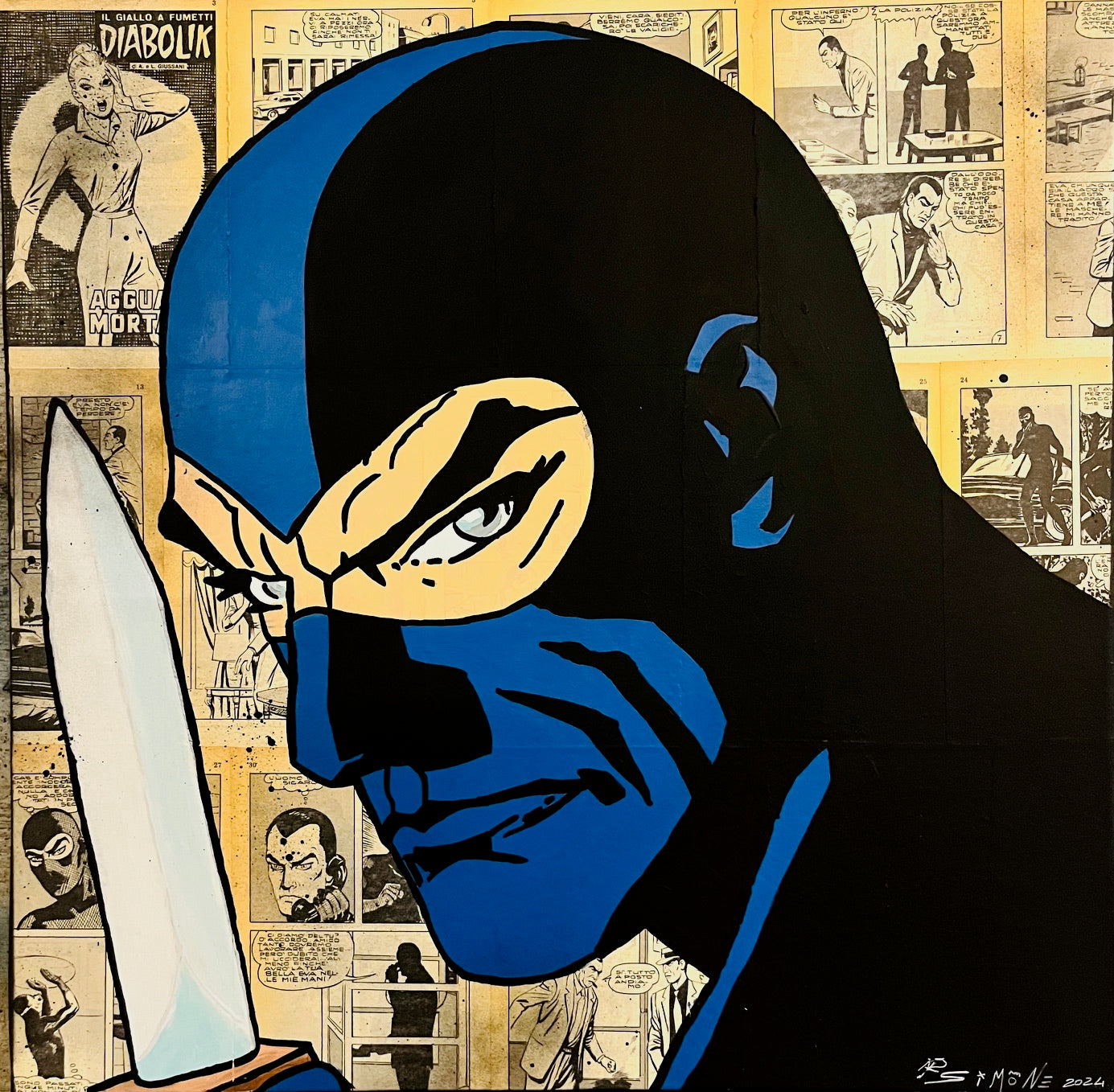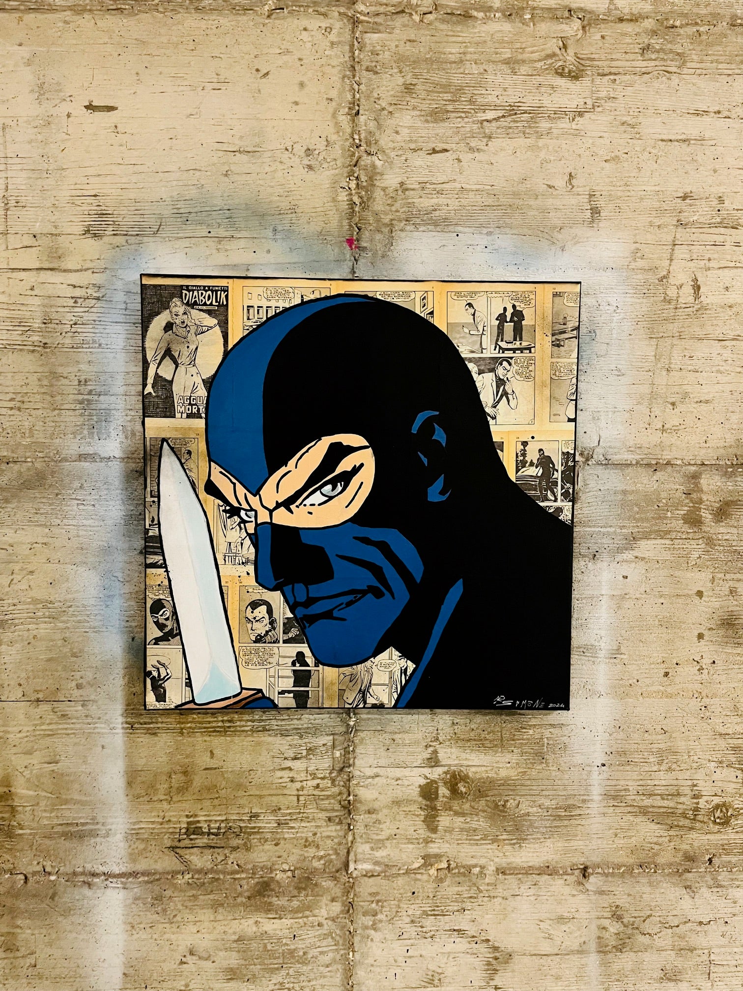 The Artwork it's painted by the artist with acrylic colors, spray paints and protective paint to preserve the work of art. Bacckground is created by playng comics pages collage. The theme used by the artist refers to famous Diabolik - The King of Terror ready for a new adventure.