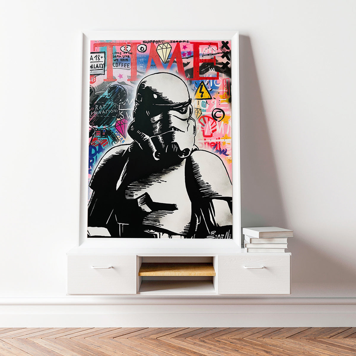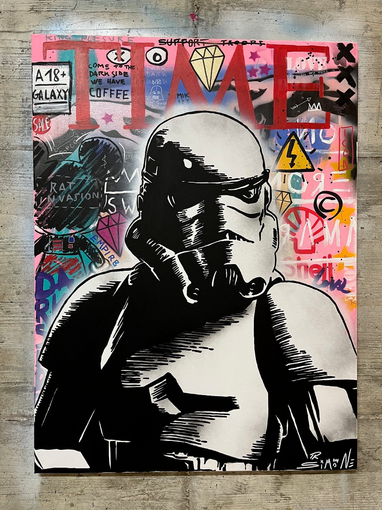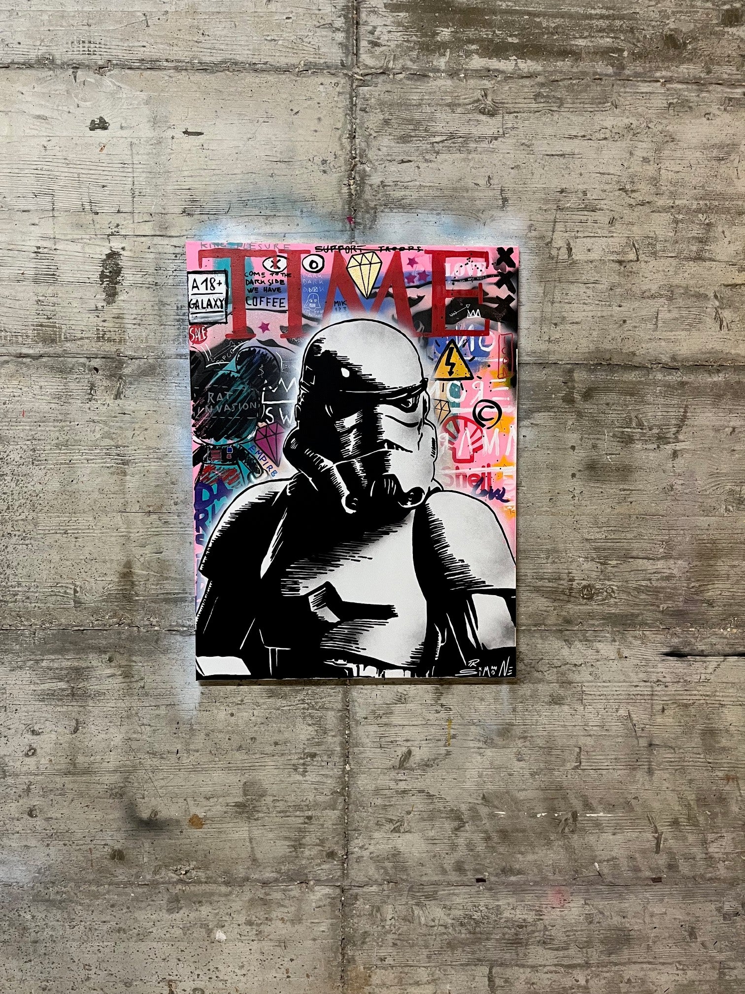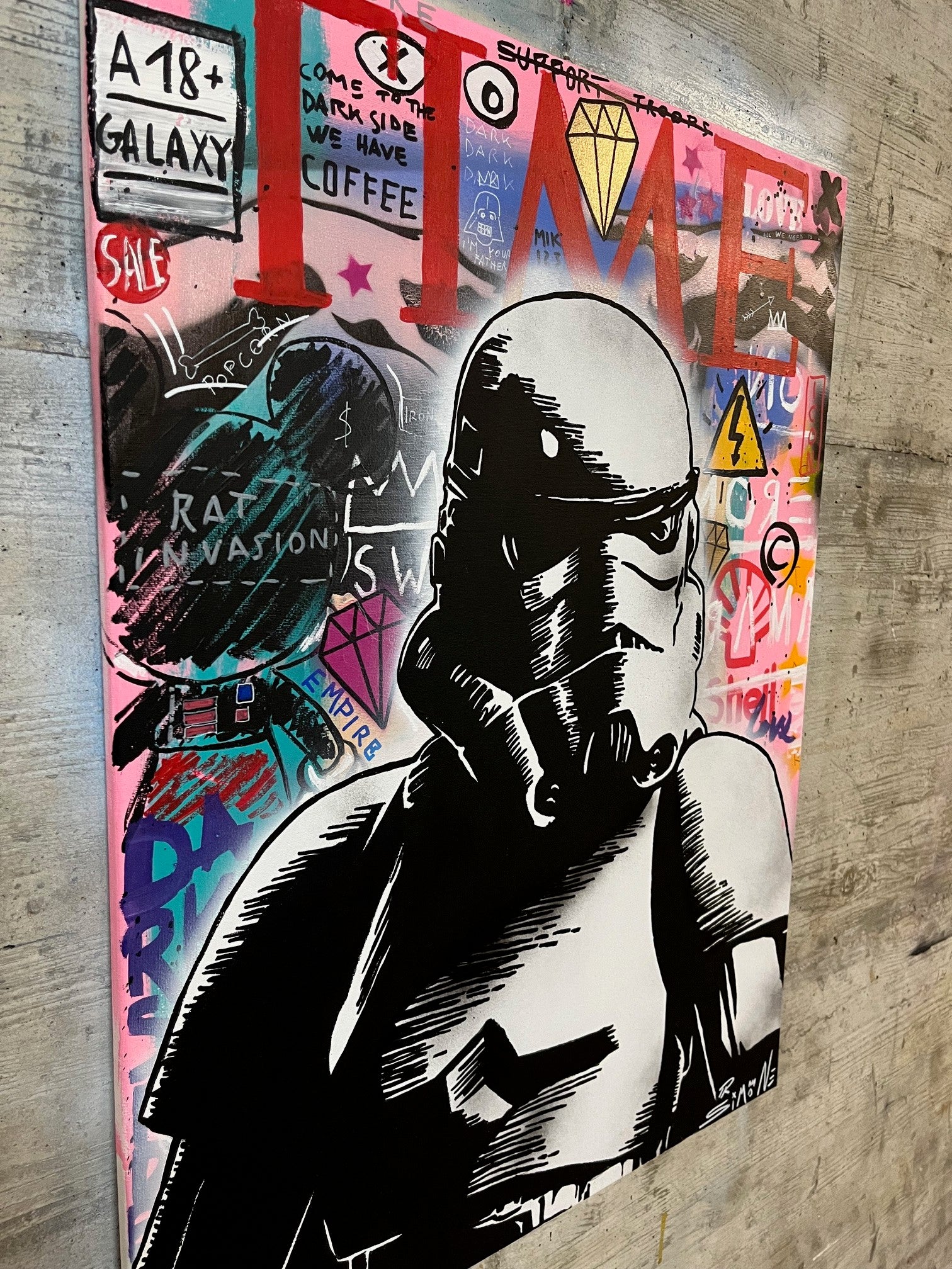 Made by the Italian artist Simone De Rosa, the soldiers of the imperial troops featured in the star wars saga, live in a Urban Background, in a set of colors and well-known pop and street art references. On the painting we can find a Mickey Mouse, the TIMES magazine logo, and much more.