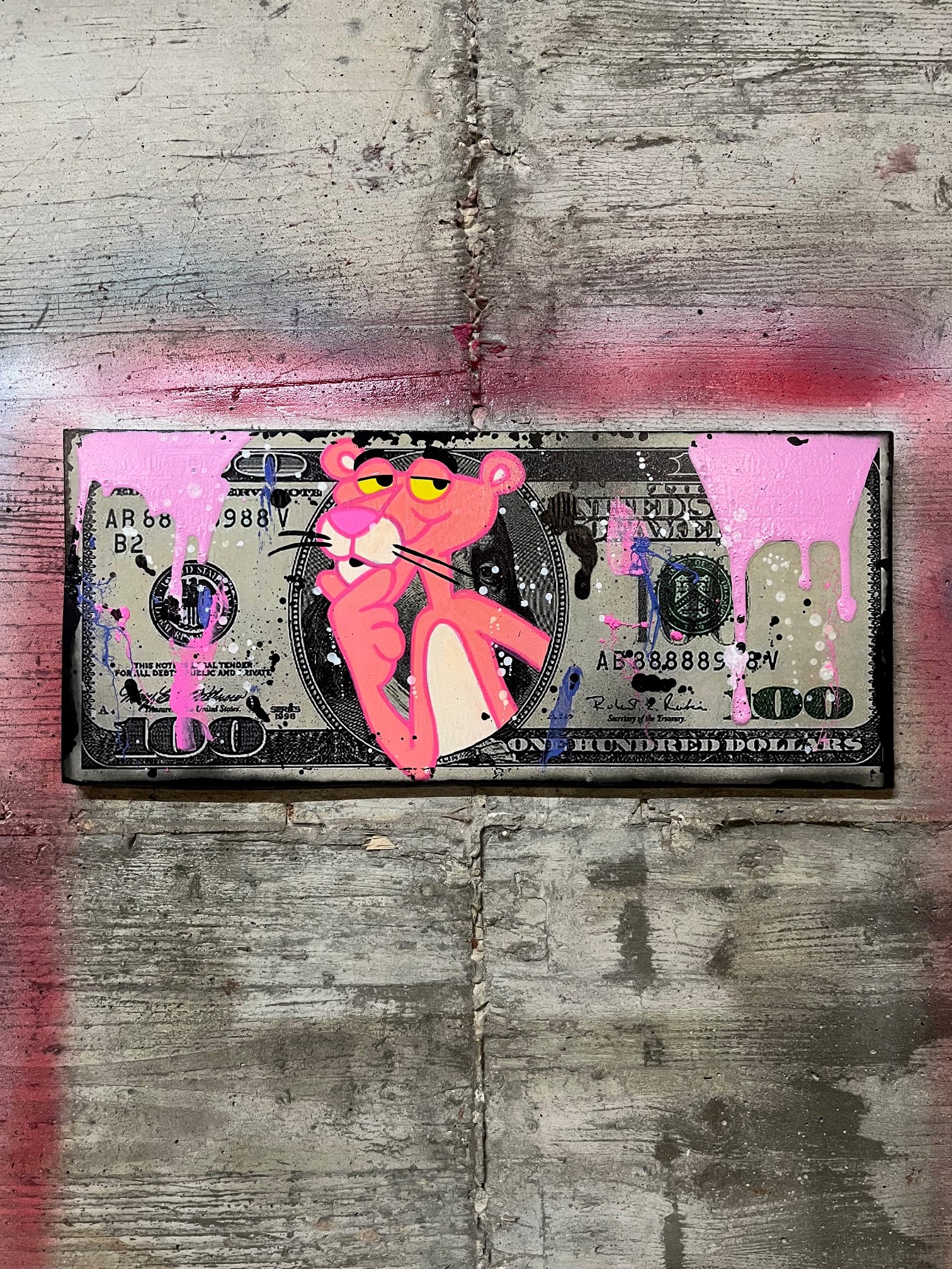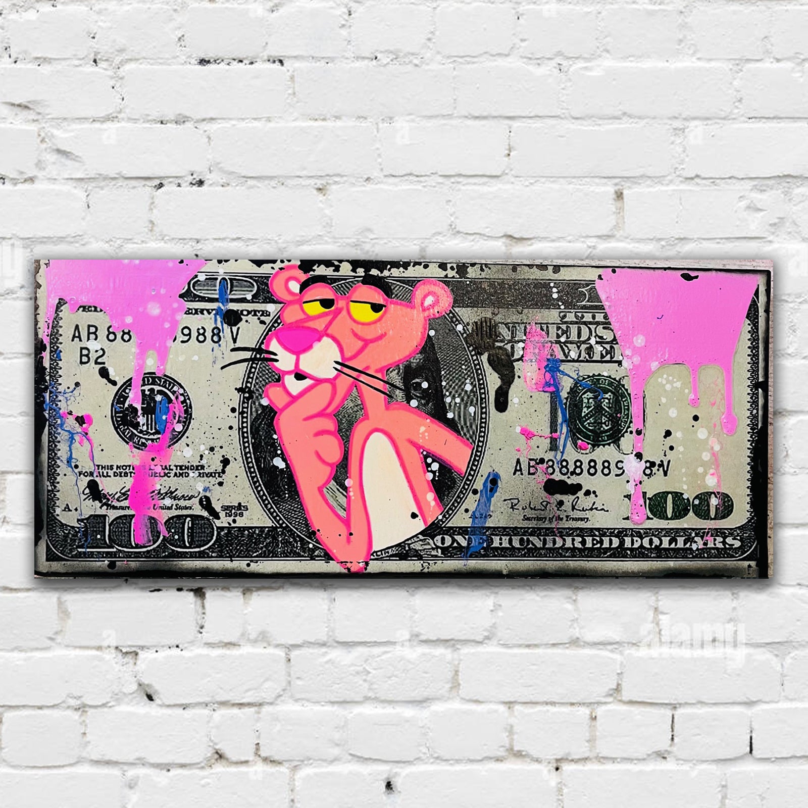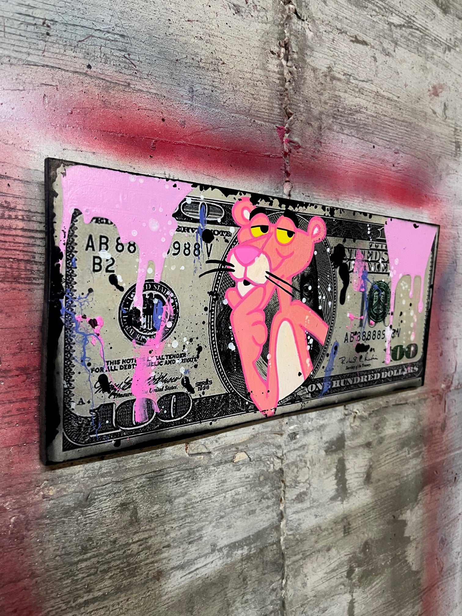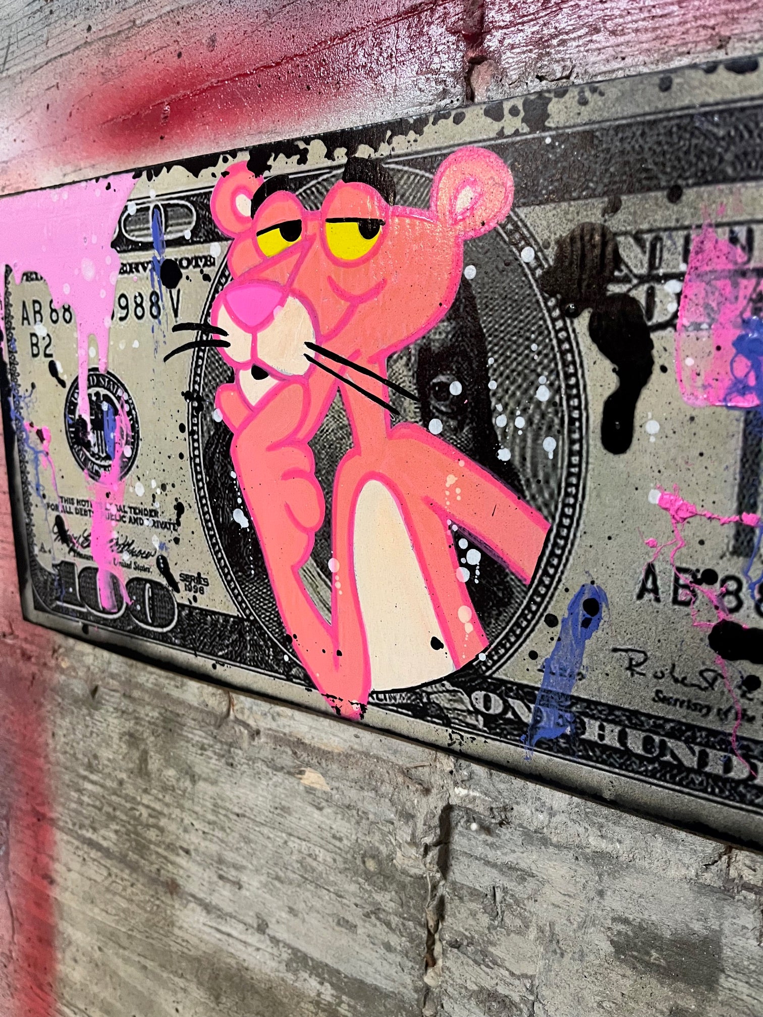 "100 Dollar collection Pink Panther" is not just a visual representation of an iconic character, but a critical interpretation of the relationship between the symbol of wealth and the entertainment world, expressed through the language typical of street art.