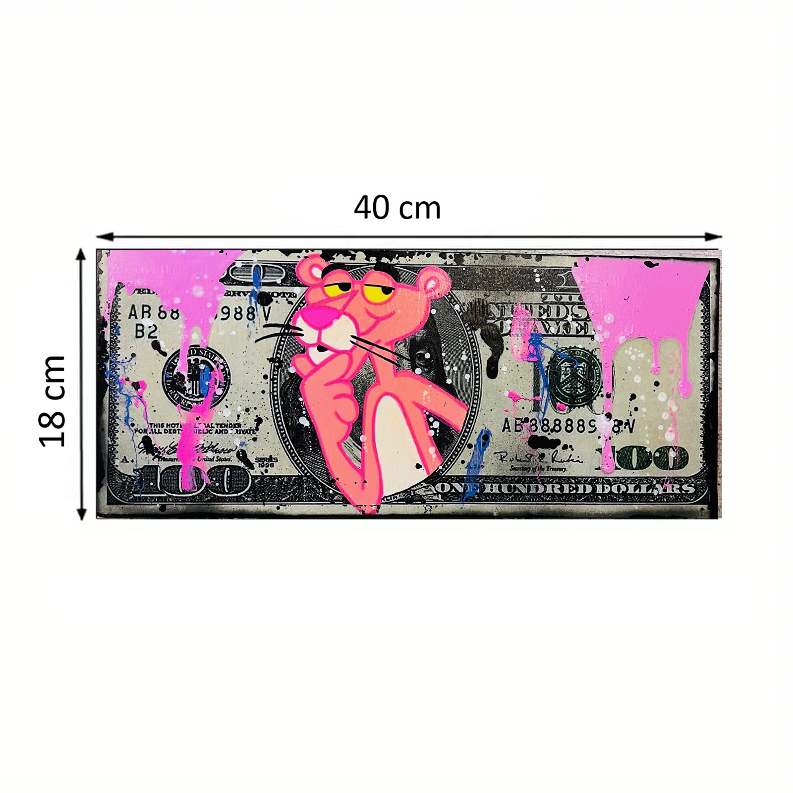 The main subject, the Pink Panther, is drawn with vibrant and bold tones using acrylic colors that highlight its figure. The collage element, which incorporates 100-dollar bills, creates a connection between the animated character and the concepts of wealth and consumerism—recurring themes in contemporary society. The contrast between the fluid drawing of the Pink Panther and the rigid material of the bills creates a visual dialogue that prompts reflection on the culture of money.