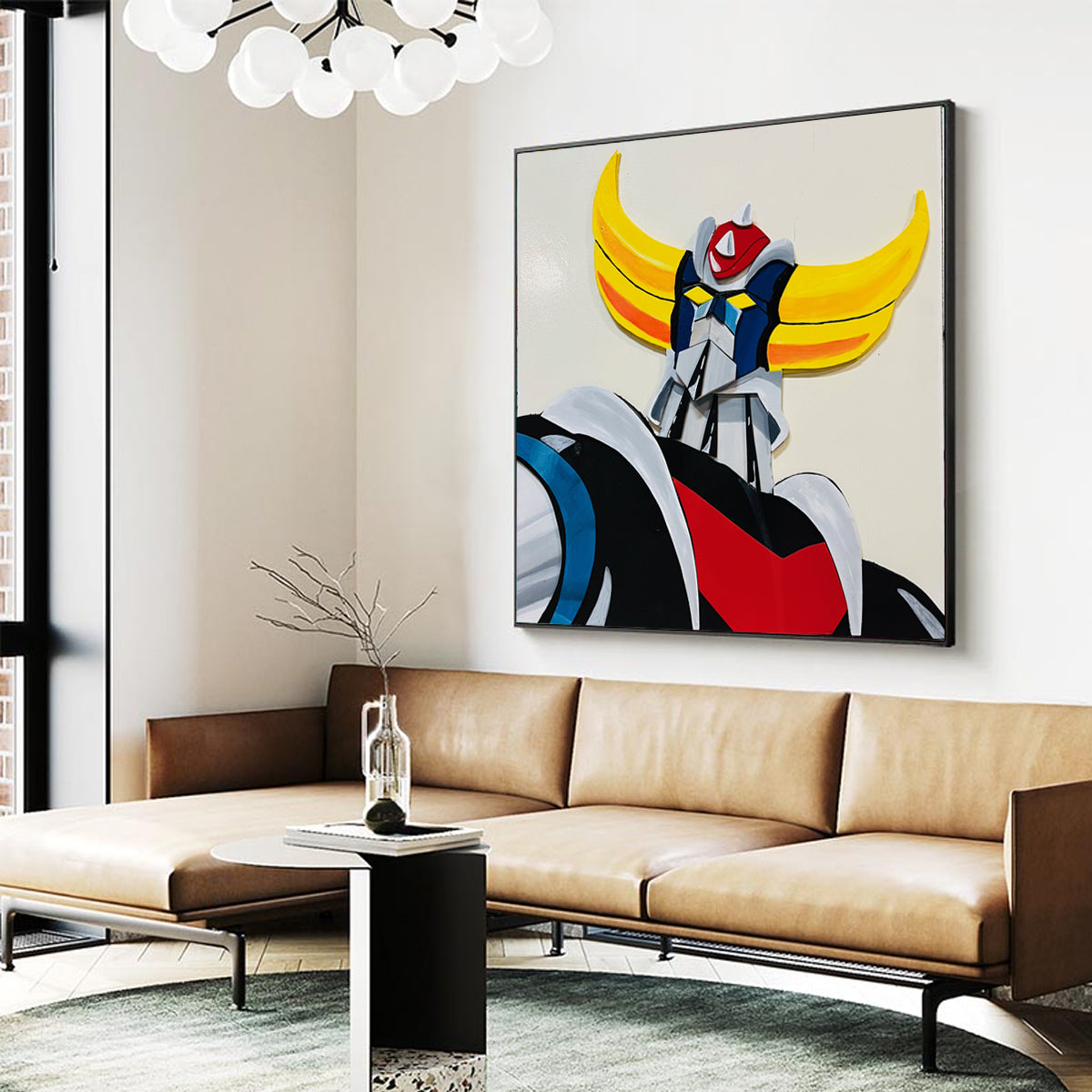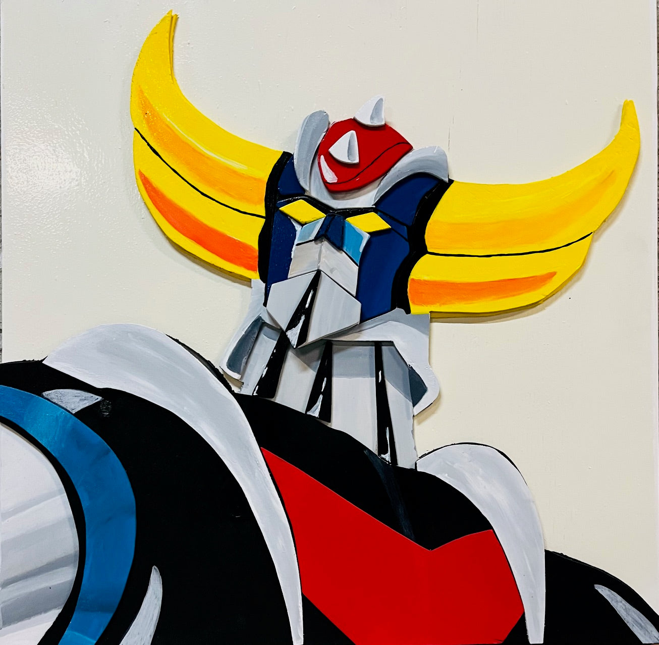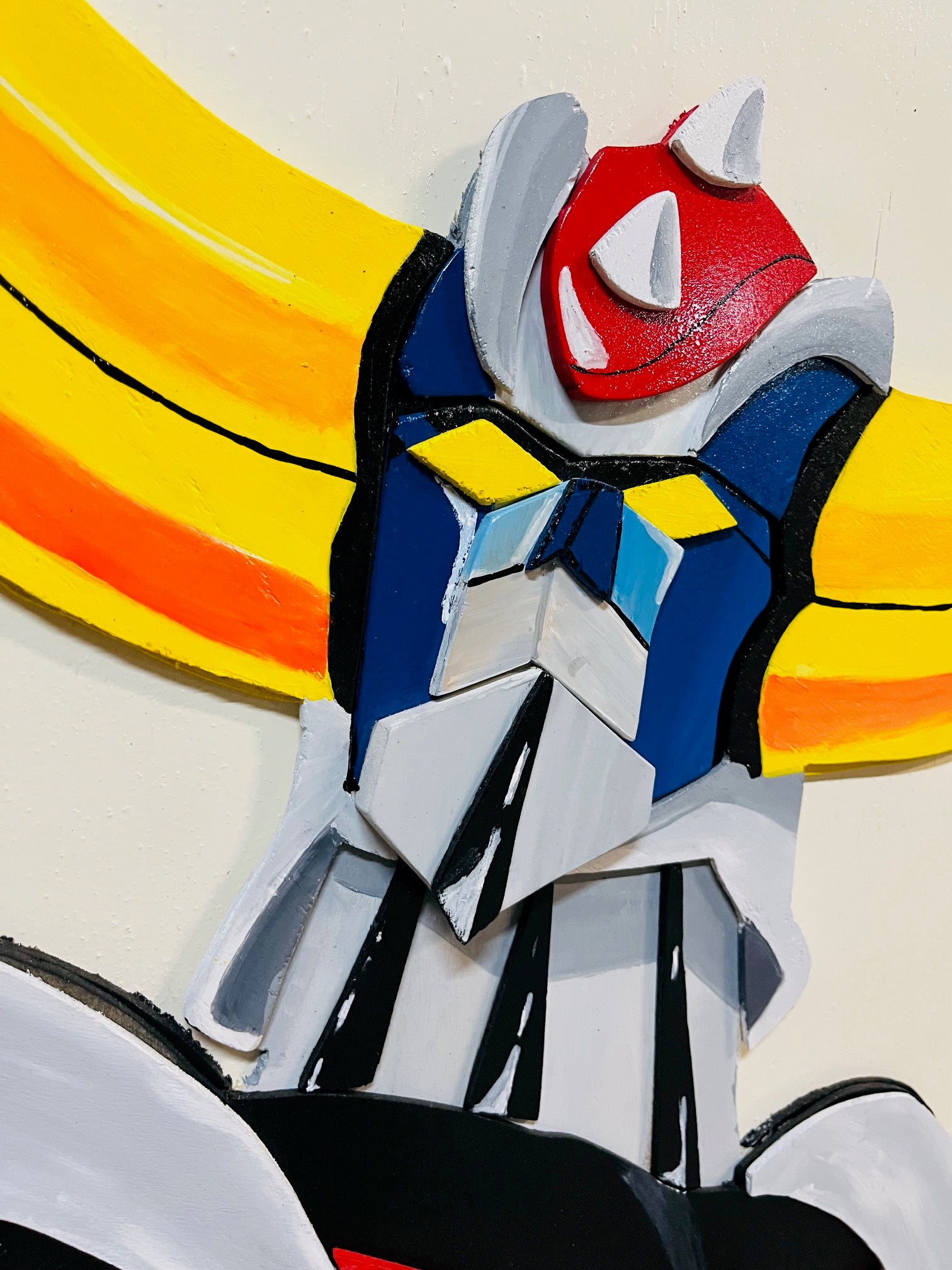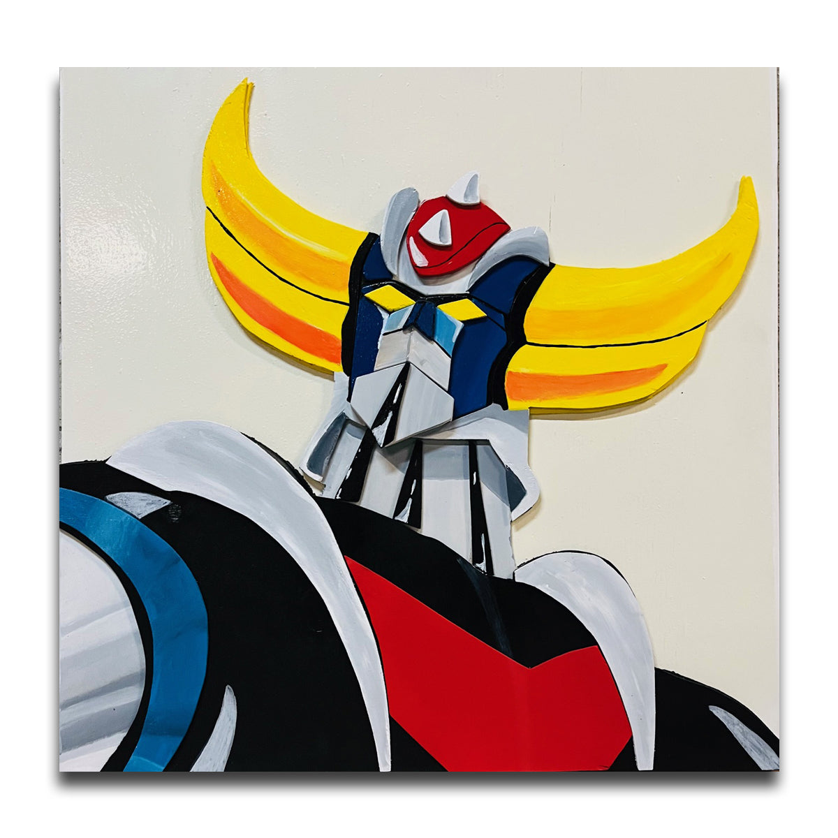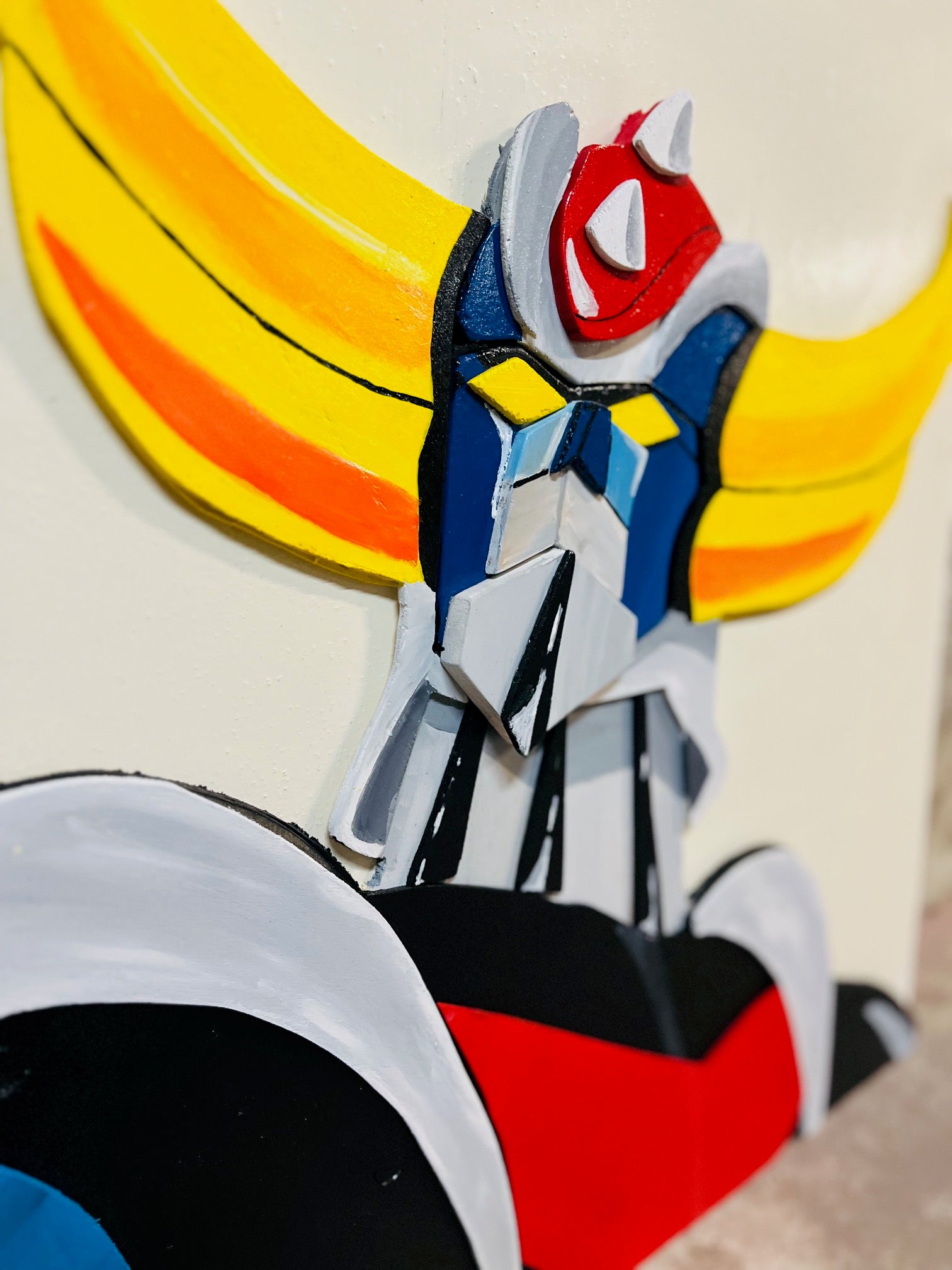 Goldrake 01 is an artwork created by the Italian artist Simone De Rosa, wooden frame, the anime robot goldrake, drawn and carved by hand. Acrylic colors give light and vibrancy to the artwork.