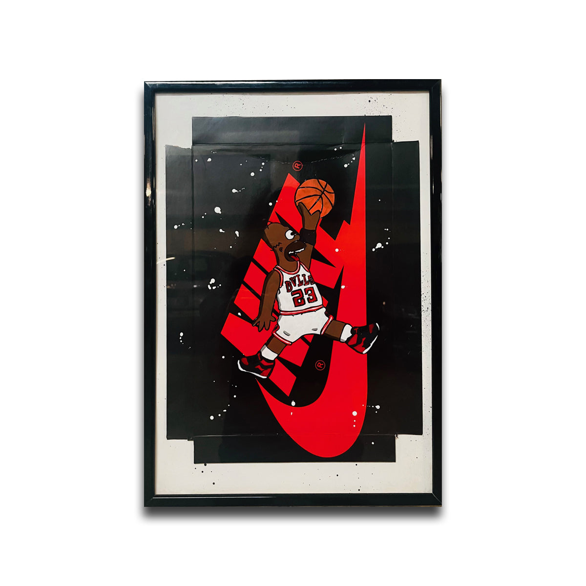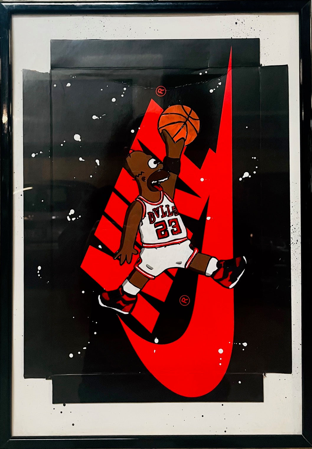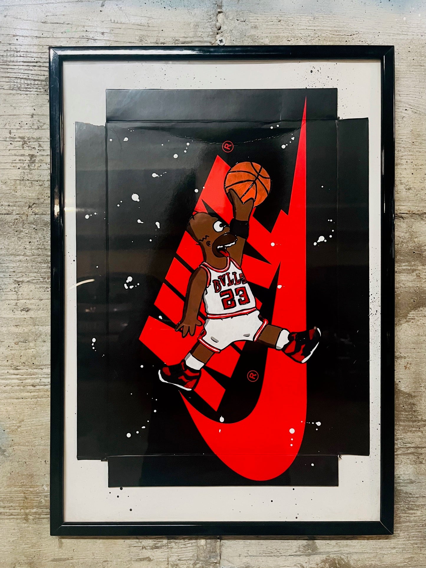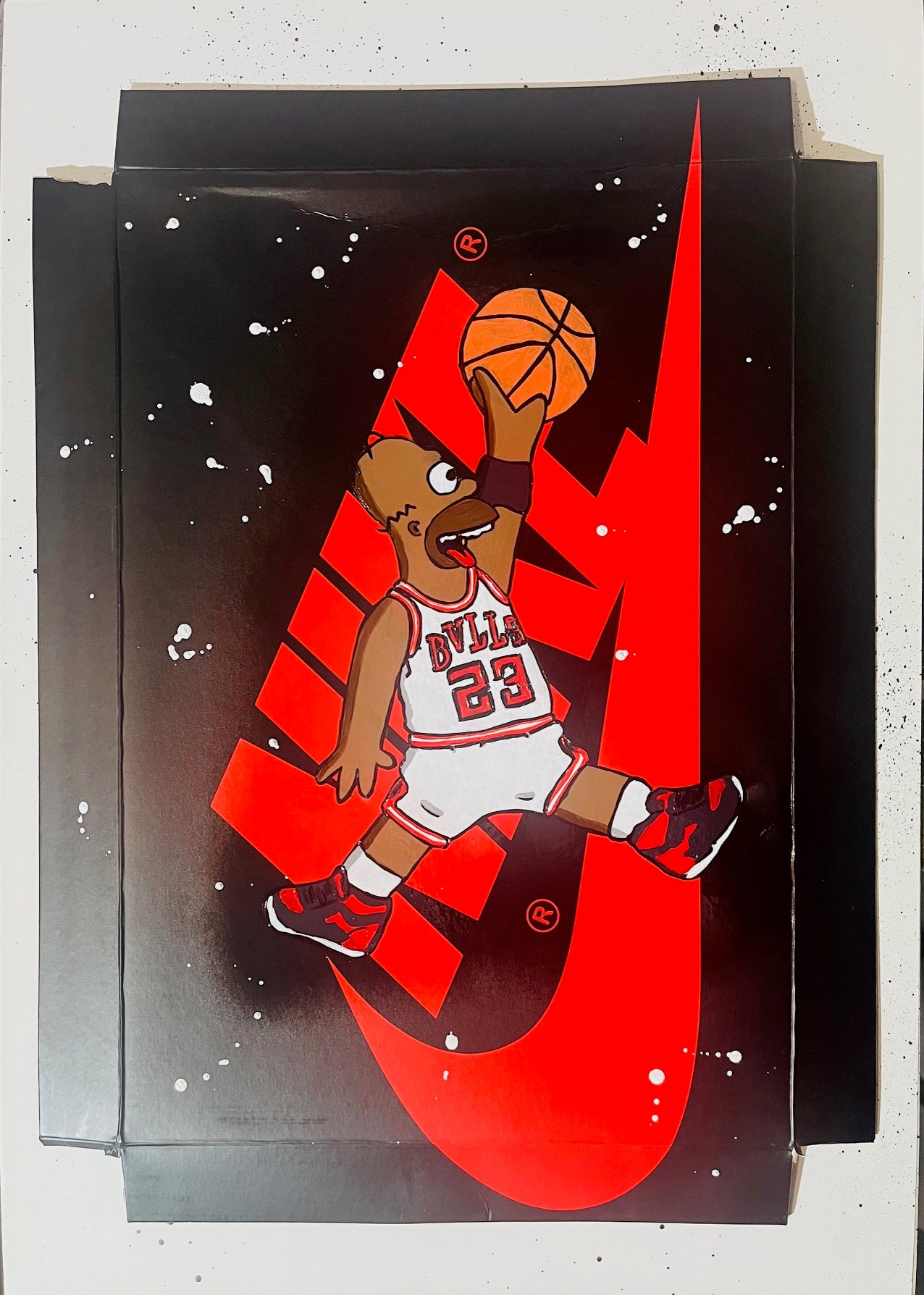 The artwork is painted by the artist with acrylic colors, spray paints and protective paint to preserve the work of art. The artwork it's painted on a original Nike Air Jordan 1 low box. The theme used by the artist refers to a Homer Simpson luke like Michael Jordan in a famous JORDAN LOGO - Homer The King of Basketball wears a Chicago Bullswhite jersey.