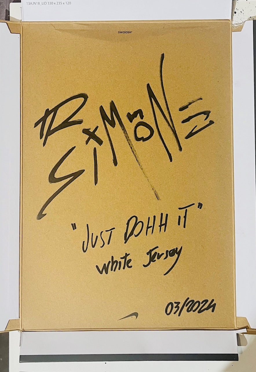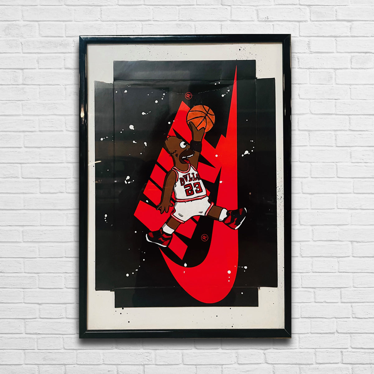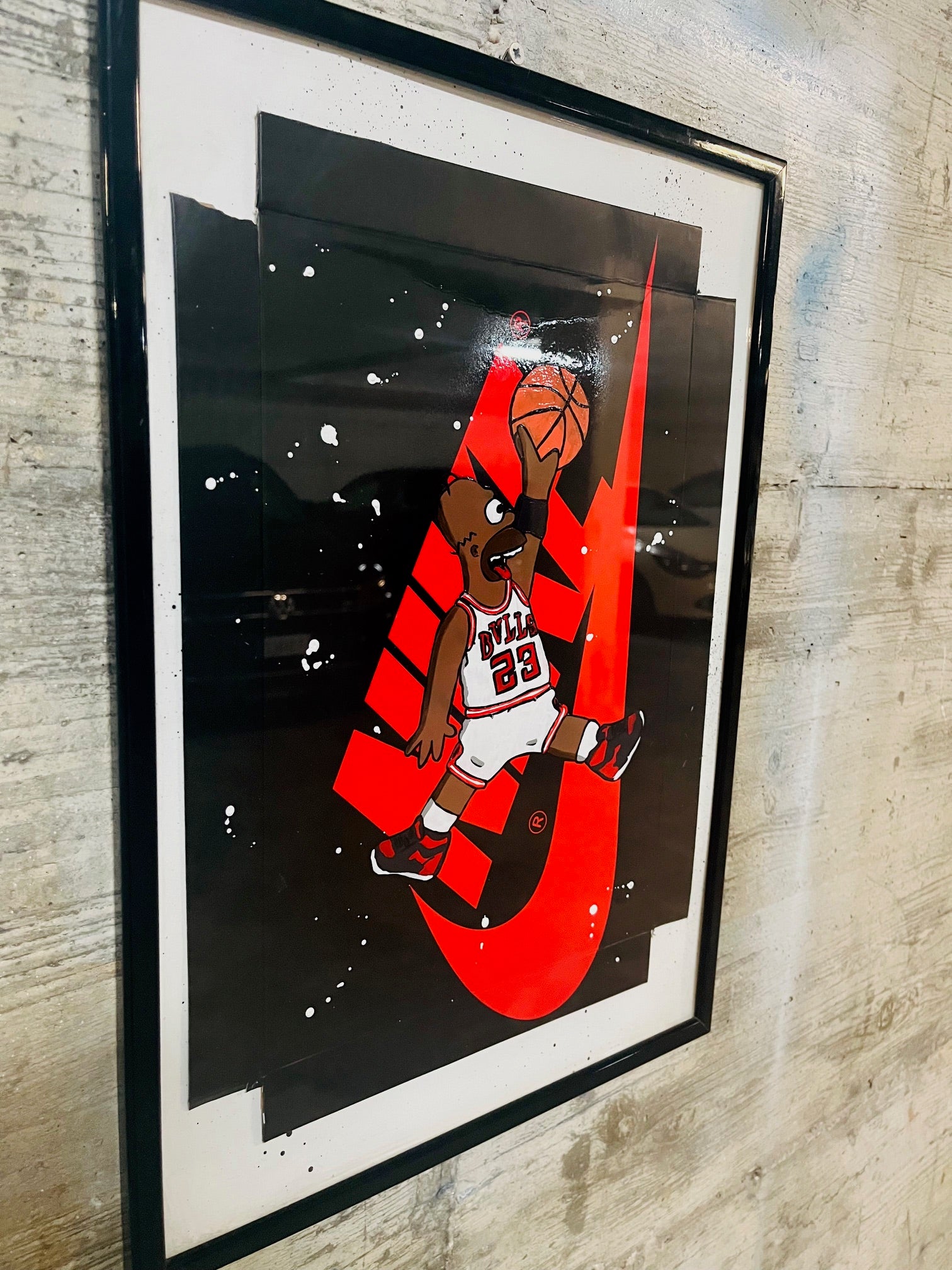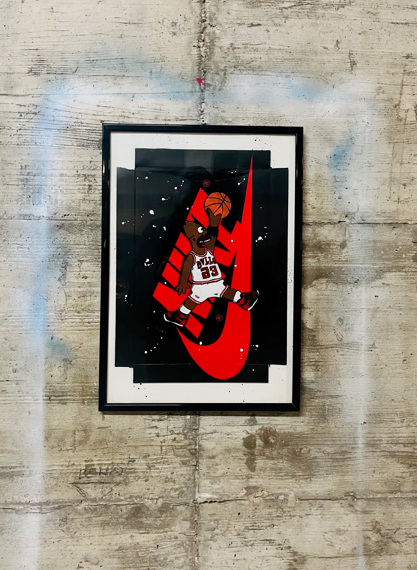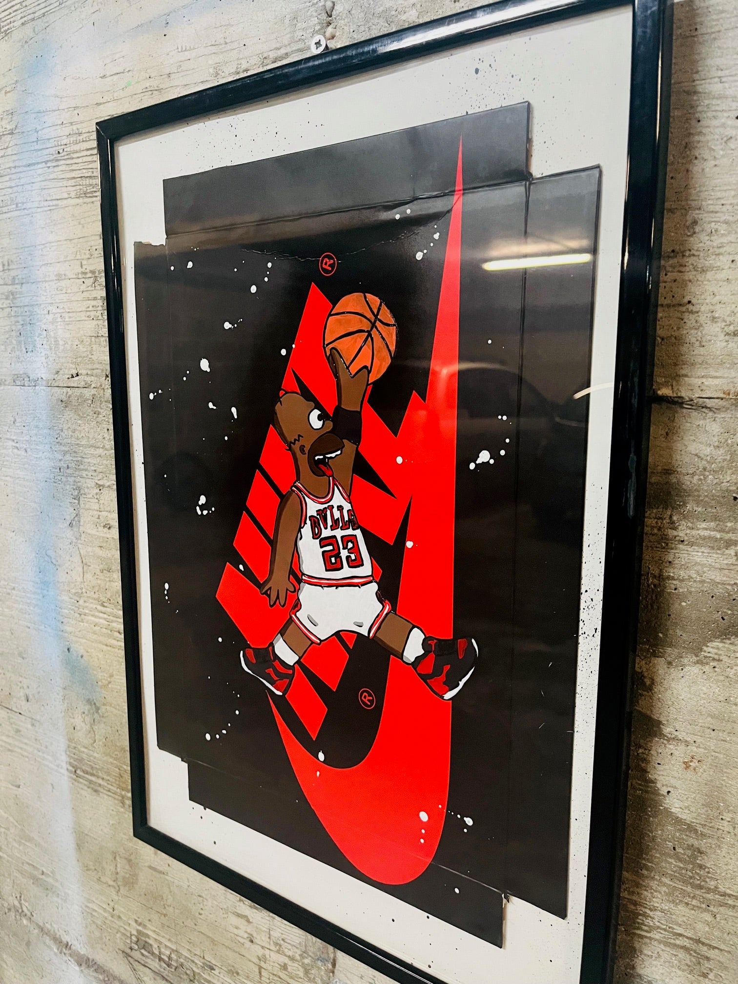 The artwork is painted by the artist with acrylic colors, spray paints and protective paint to preserve the work of art. The artwork it's painted on a original Nike Air Jordan 1 low box. The theme used by the artist refers to a Homer Simpson luke like Michael Jordan in a famous JORDAN LOGO - Homer The King of Basketball wears a Chicago Bullswhite jersey.