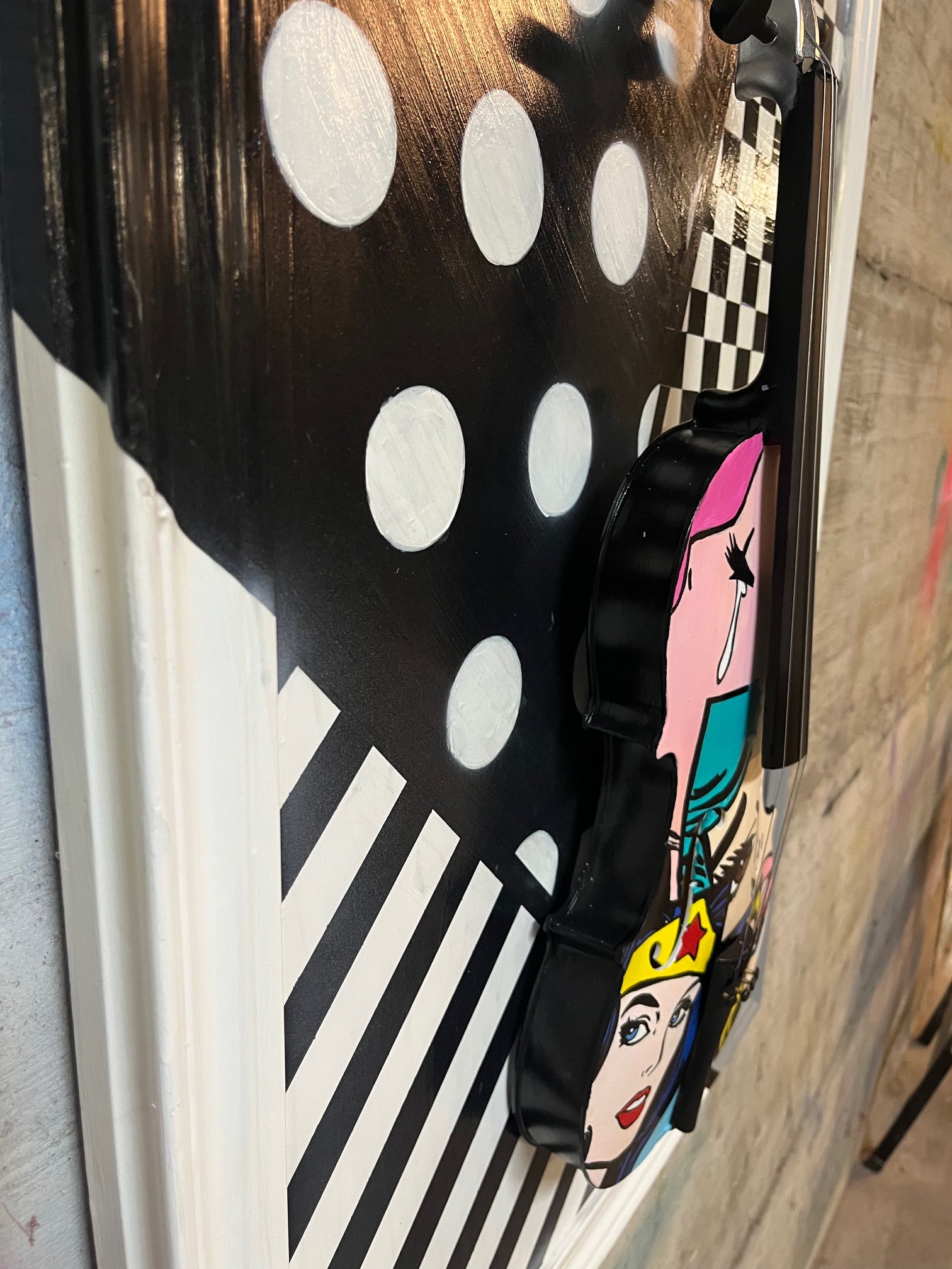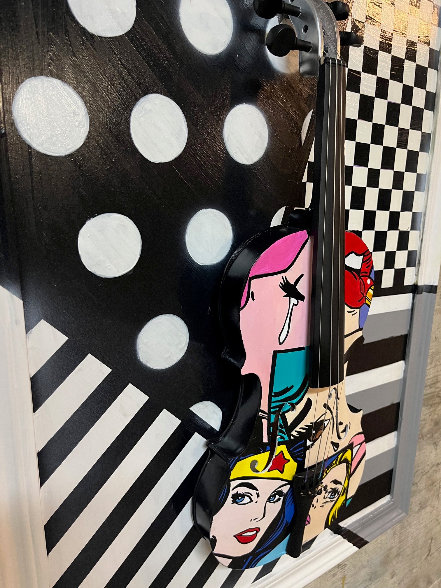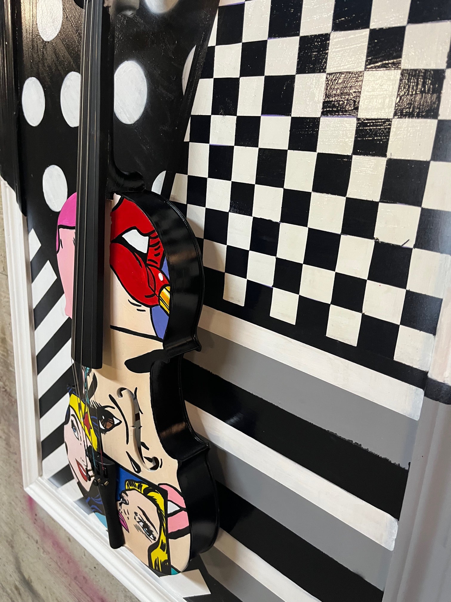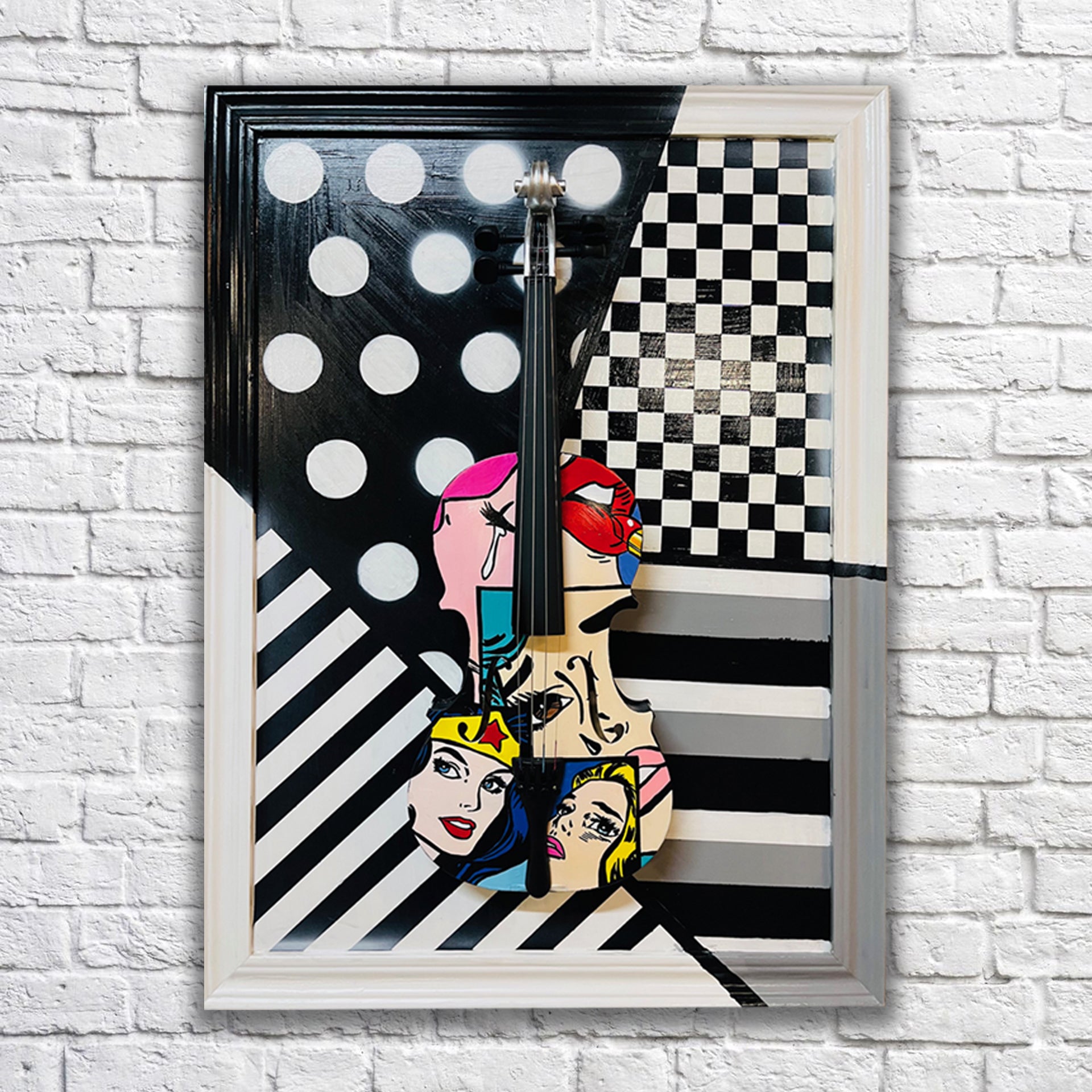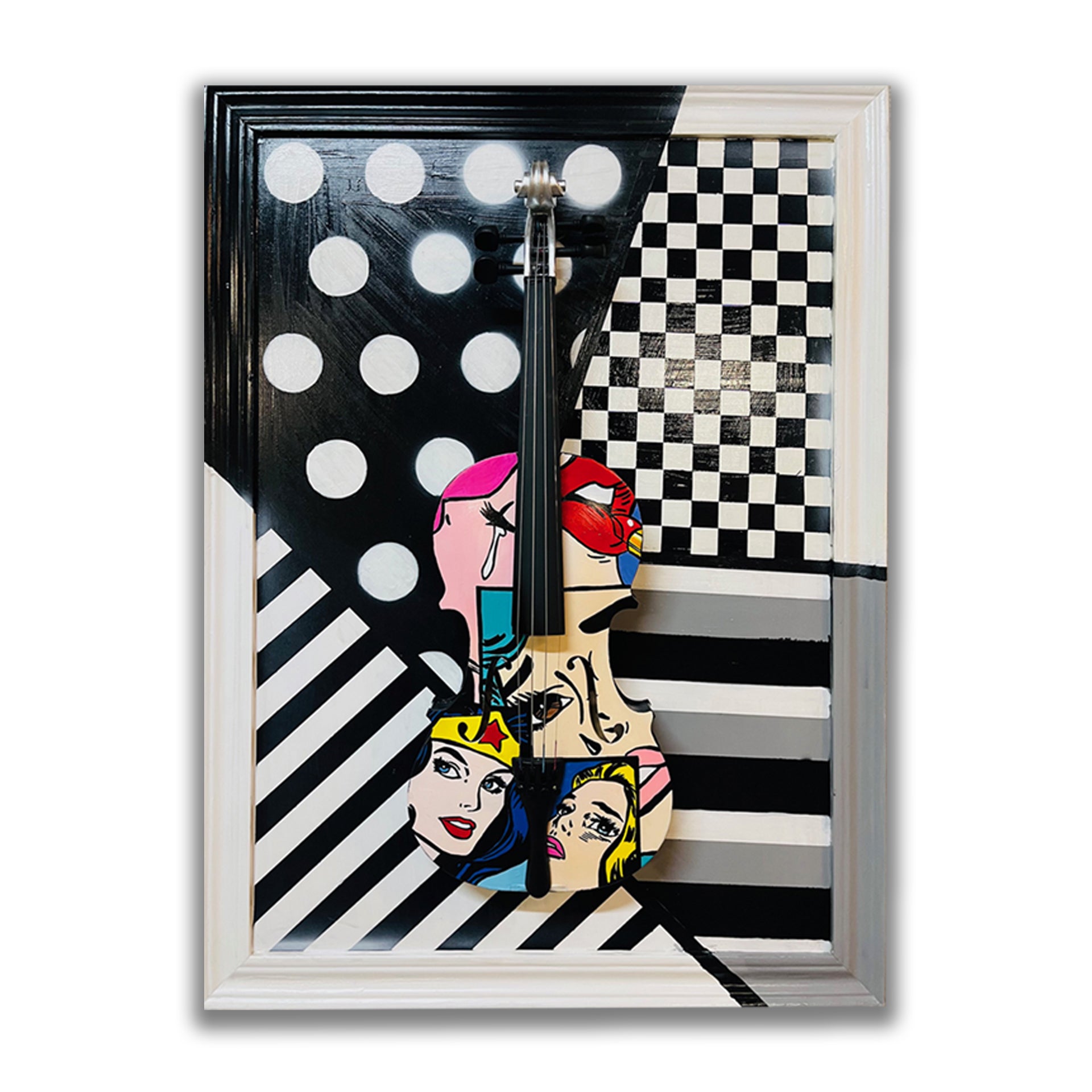 In Symphony of Pop, Simone De Rosa transforms a traditional violin into a vibrant intersection of fine art, pop culture, and musical heritage. The genuine string instrument, boldly repurposed as canvas, becomes an emblem of the artist's daring creativity. Layered against a striking backdrop of black-and-white polka dots, checkers, and dynamic stripes, the violin itself is adorned with vivid pop art portraits—evocative of Roy Lichtenstein’s graphic intensity and the bold femininity of comic heroines.