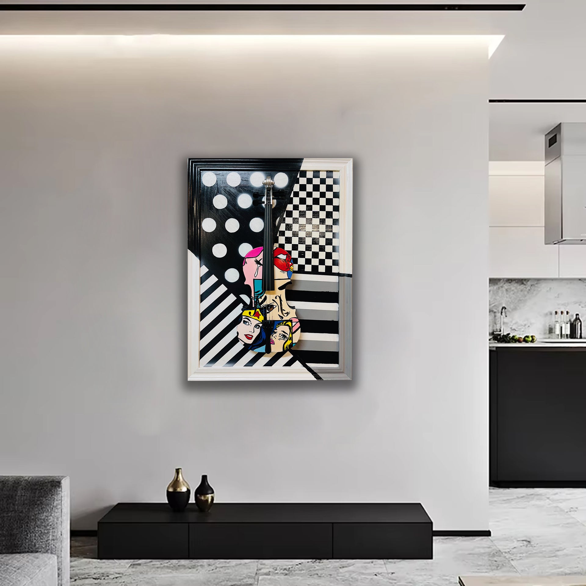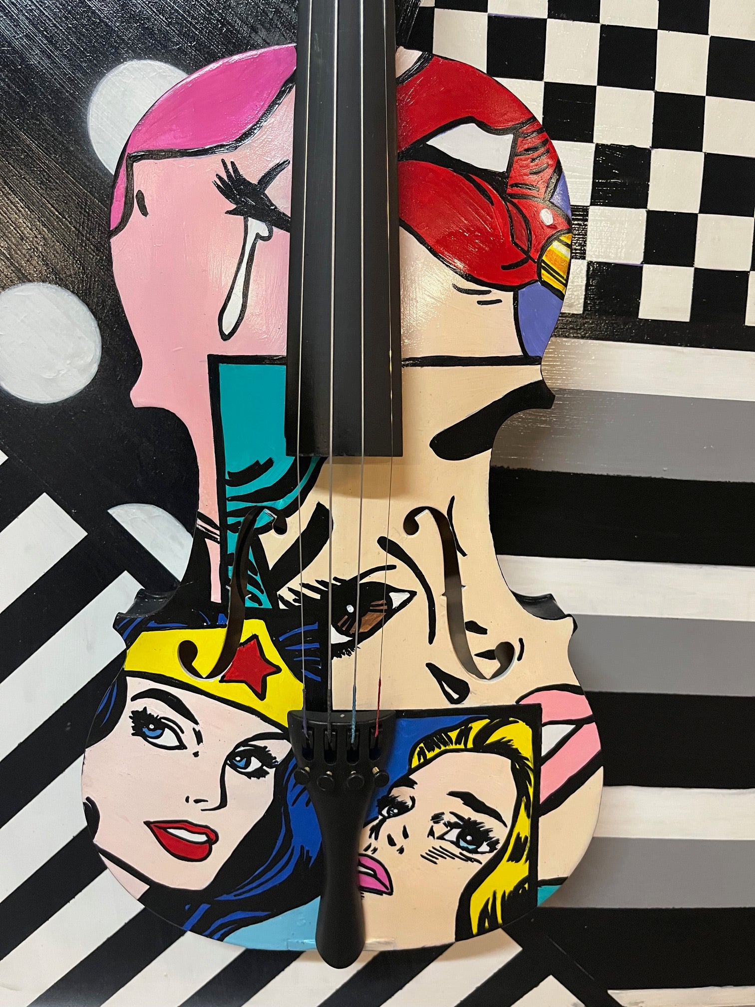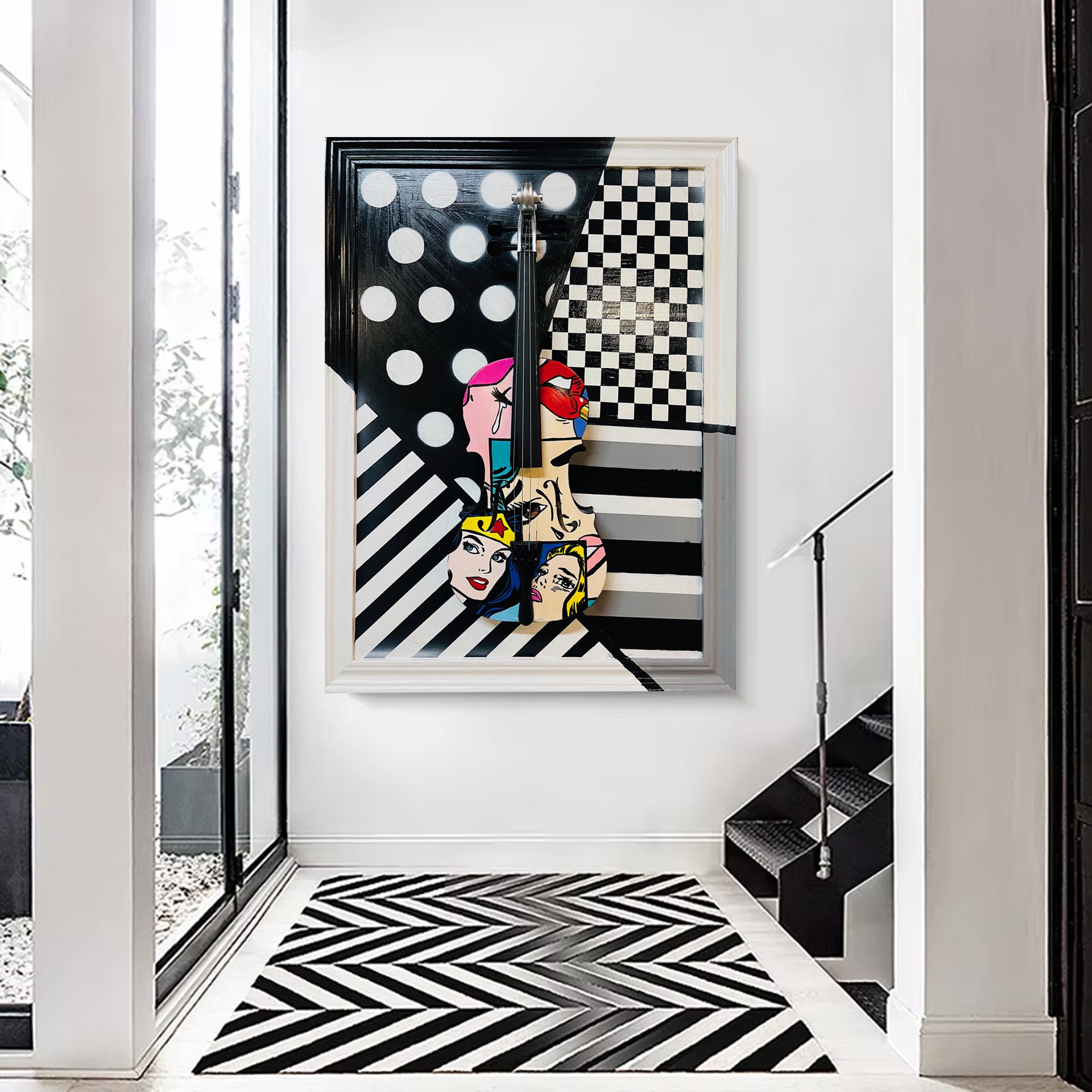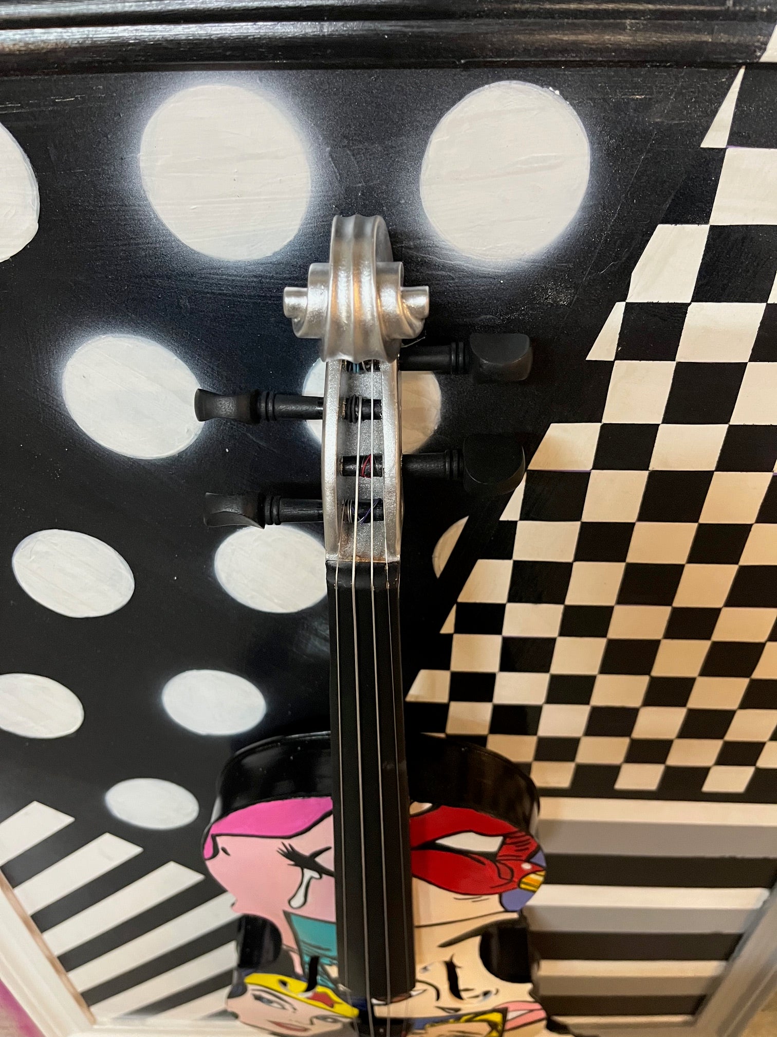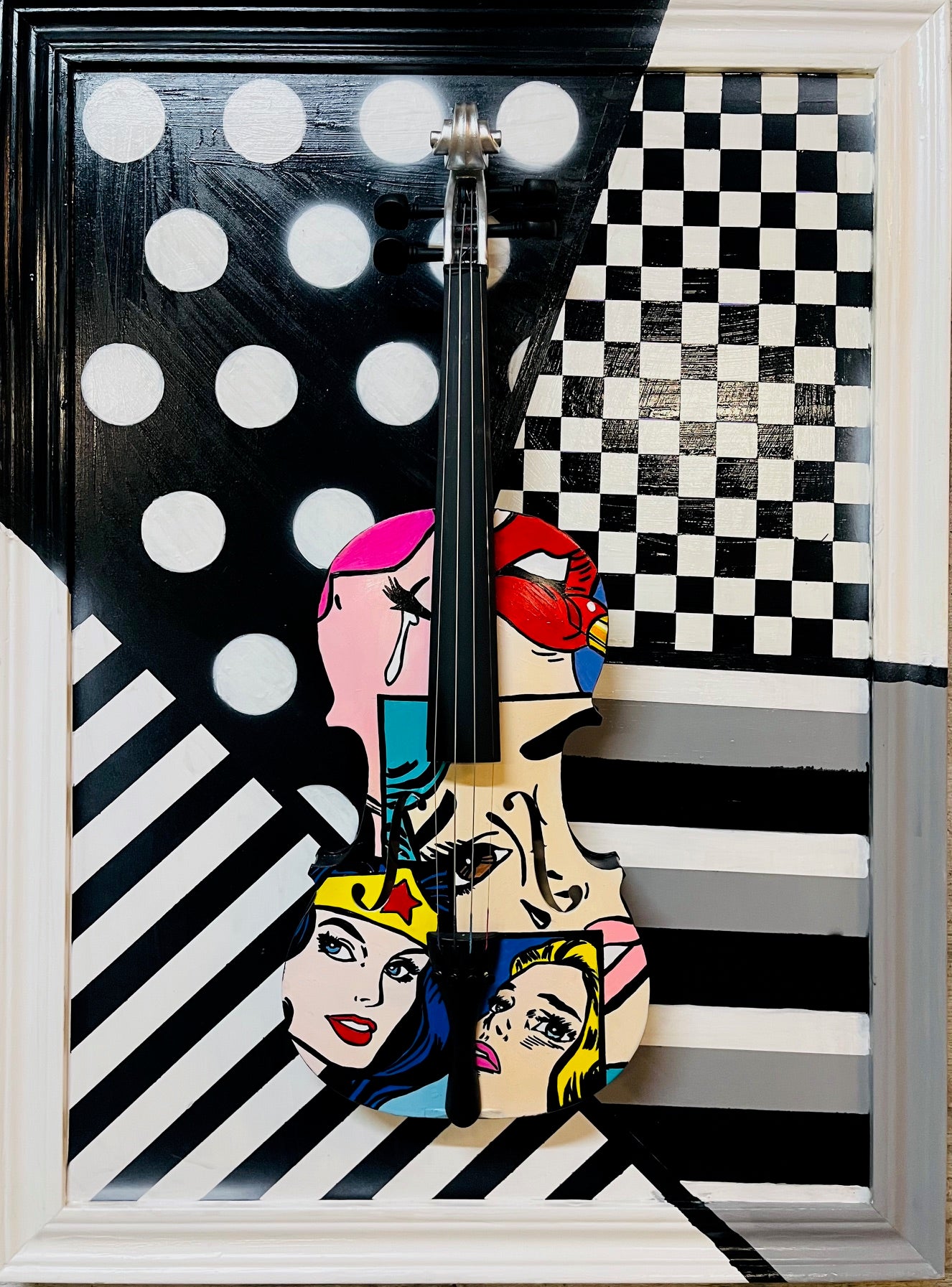 In Symphony of Pop, Simone De Rosa transforms a traditional violin into a vibrant intersection of fine art, pop culture, and musical heritage. The genuine string instrument, boldly repurposed as canvas, becomes an emblem of the artist's daring creativity. Layered against a striking backdrop of black-and-white polka dots, checkers, and dynamic stripes, the violin itself is adorned with vivid pop art portraits—evocative of Roy Lichtenstein’s graphic intensity and the bold femininity of comic heroines.