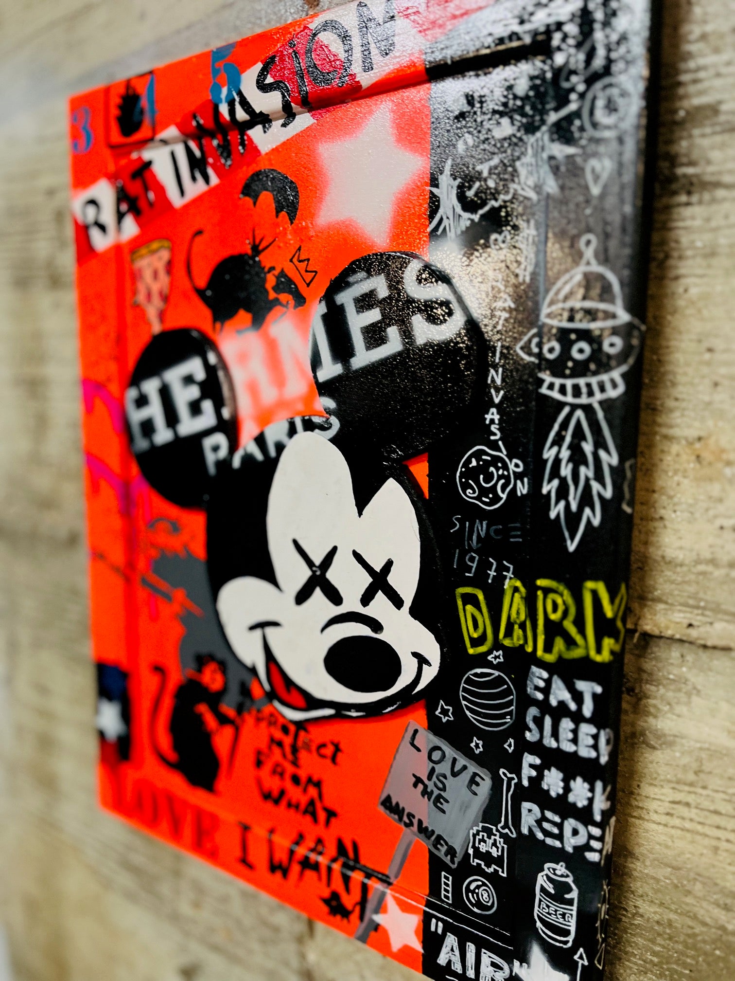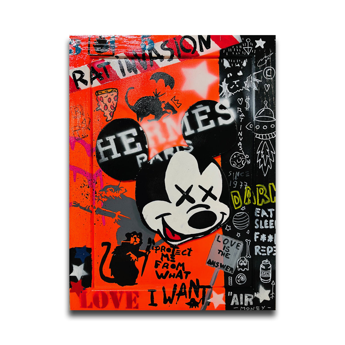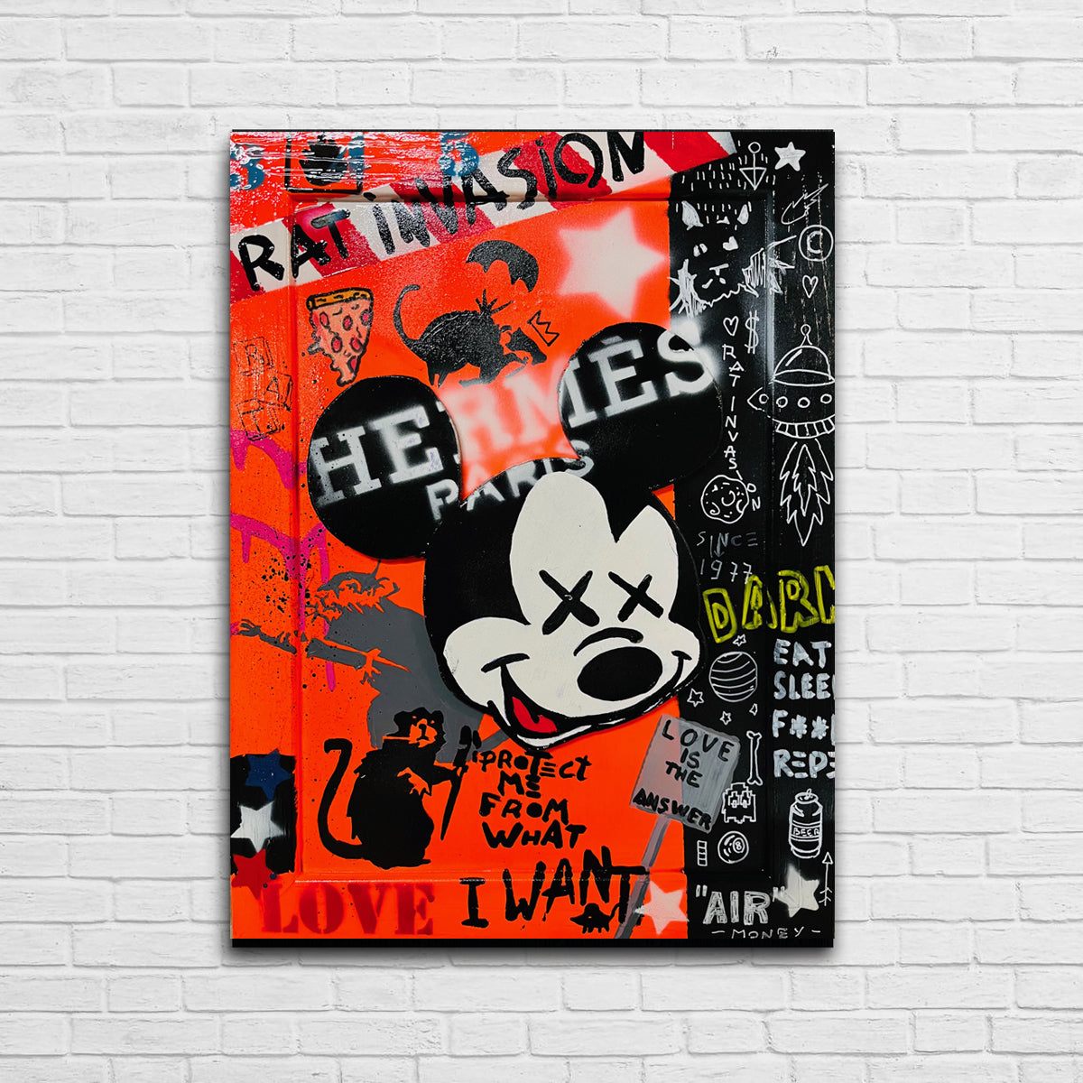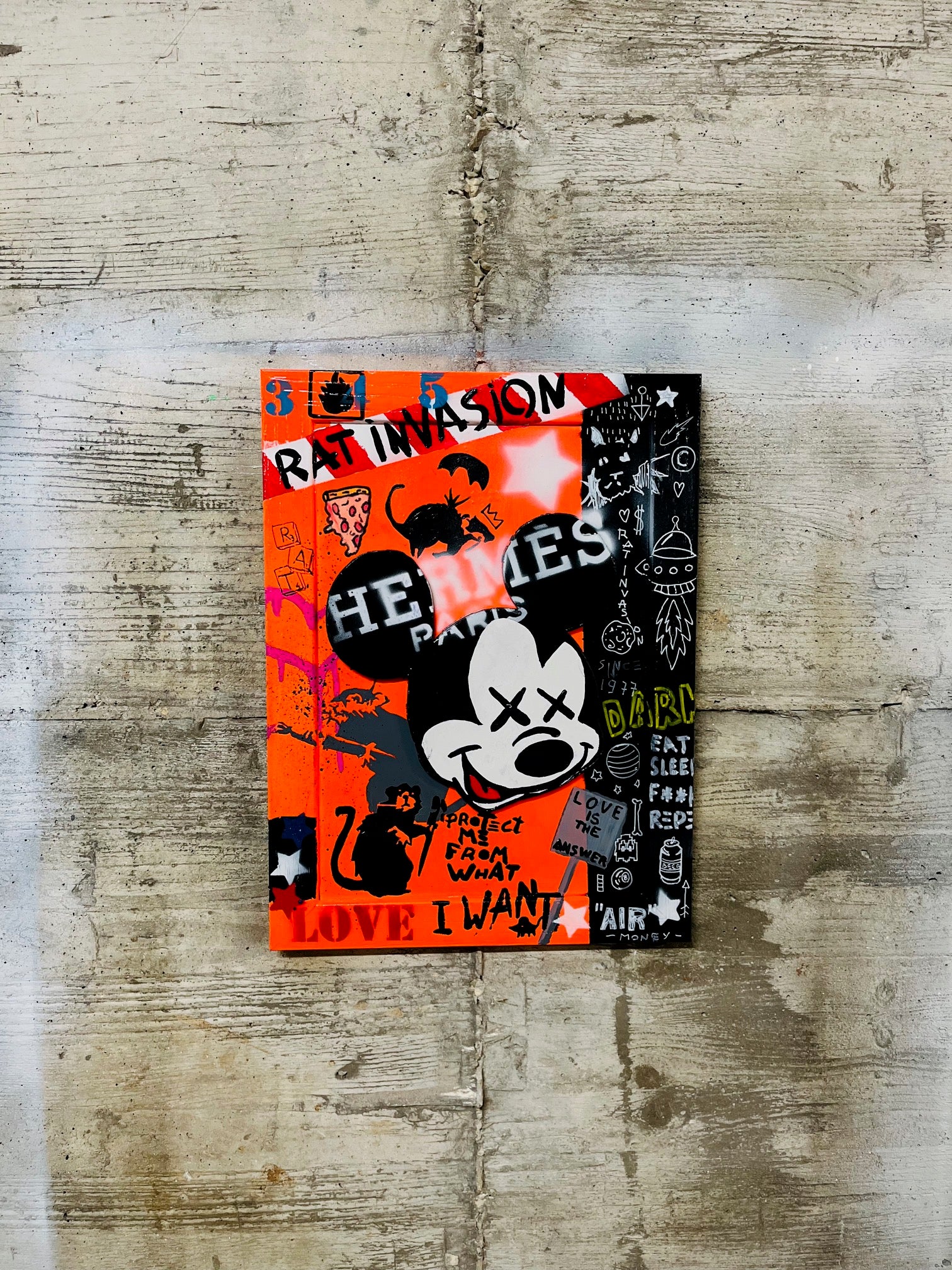 Rat Invasion is a artwork created by the Italian artist Simone De Rosa, wooden frame, the Mickey Mouse street version, drawn and carved by hand. Acrylic colors give light and vibrancy to the artwork."Each part of the Mickey has been drawn, carved and colored by hand."