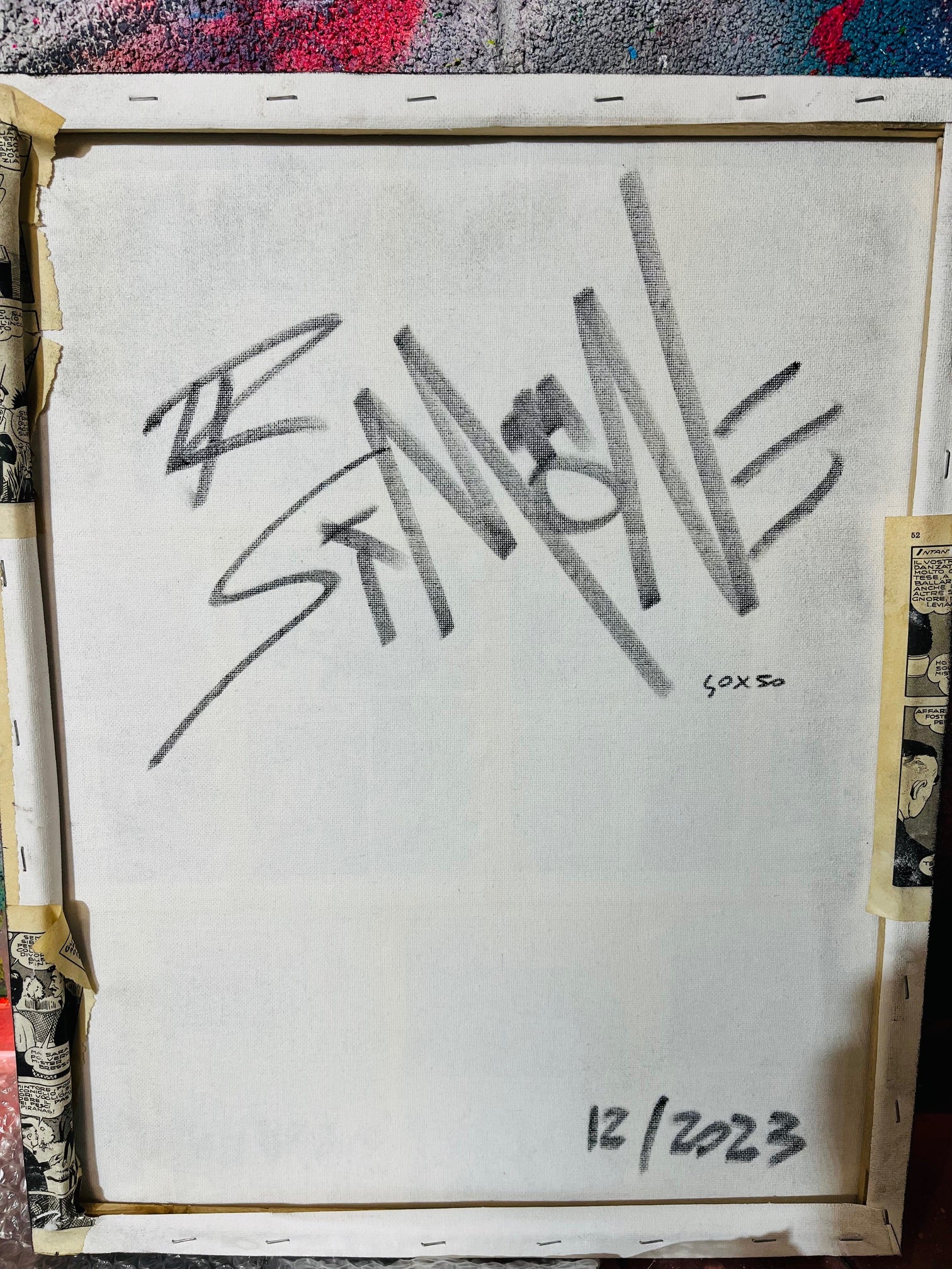 The artwork is painted by the artist with acrylic colors, spray paints and protective paint to preserve the work of art. Bacckground is created by playng comics pages collage painted with spray red color. The theme used by the artist refers to famous Diabolik - The King of Terror.