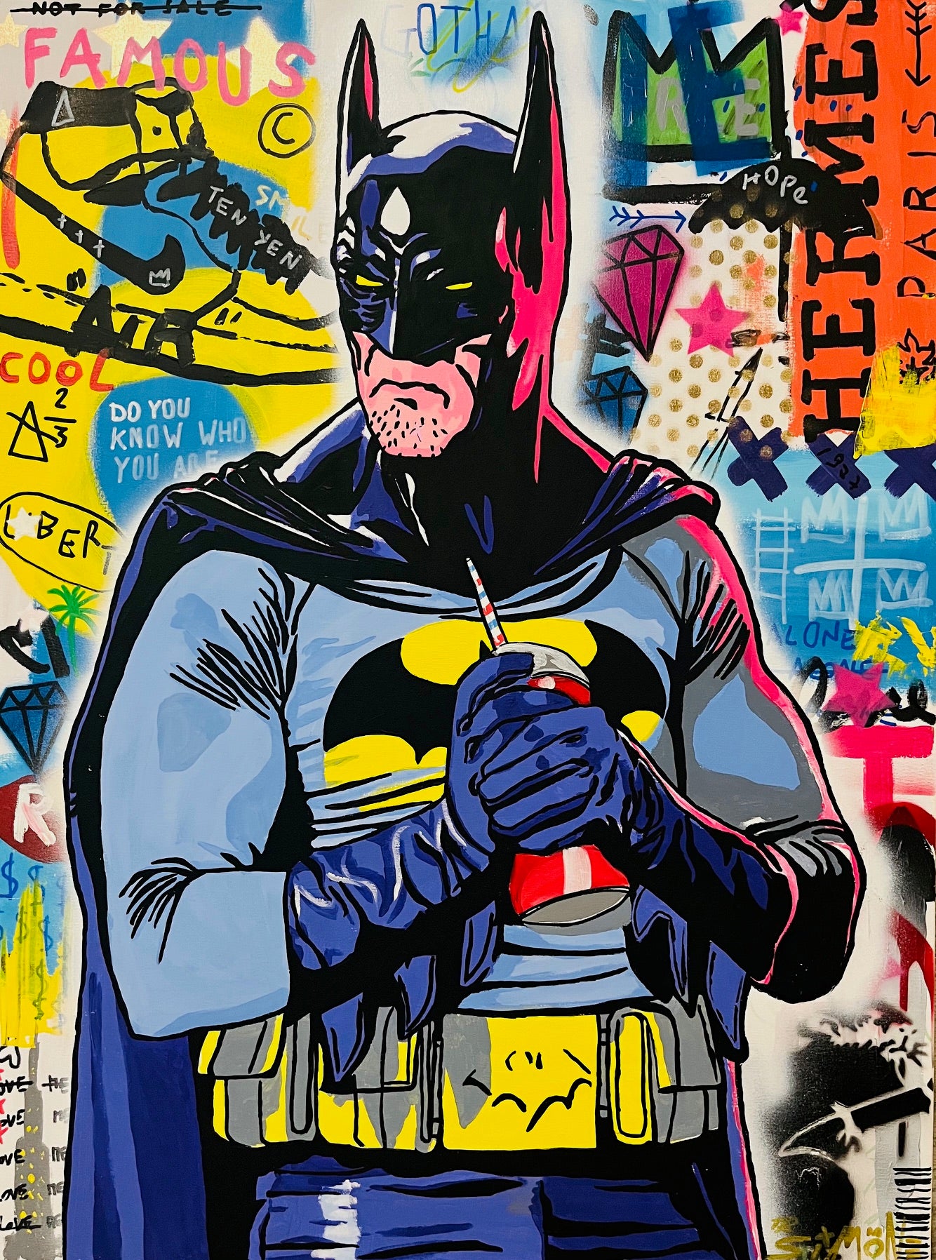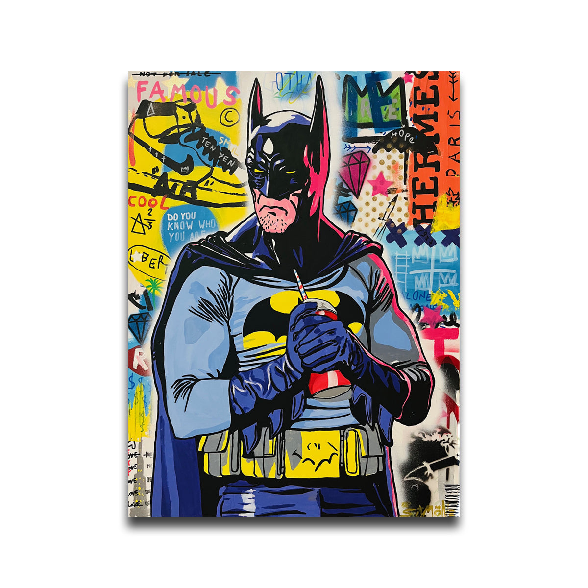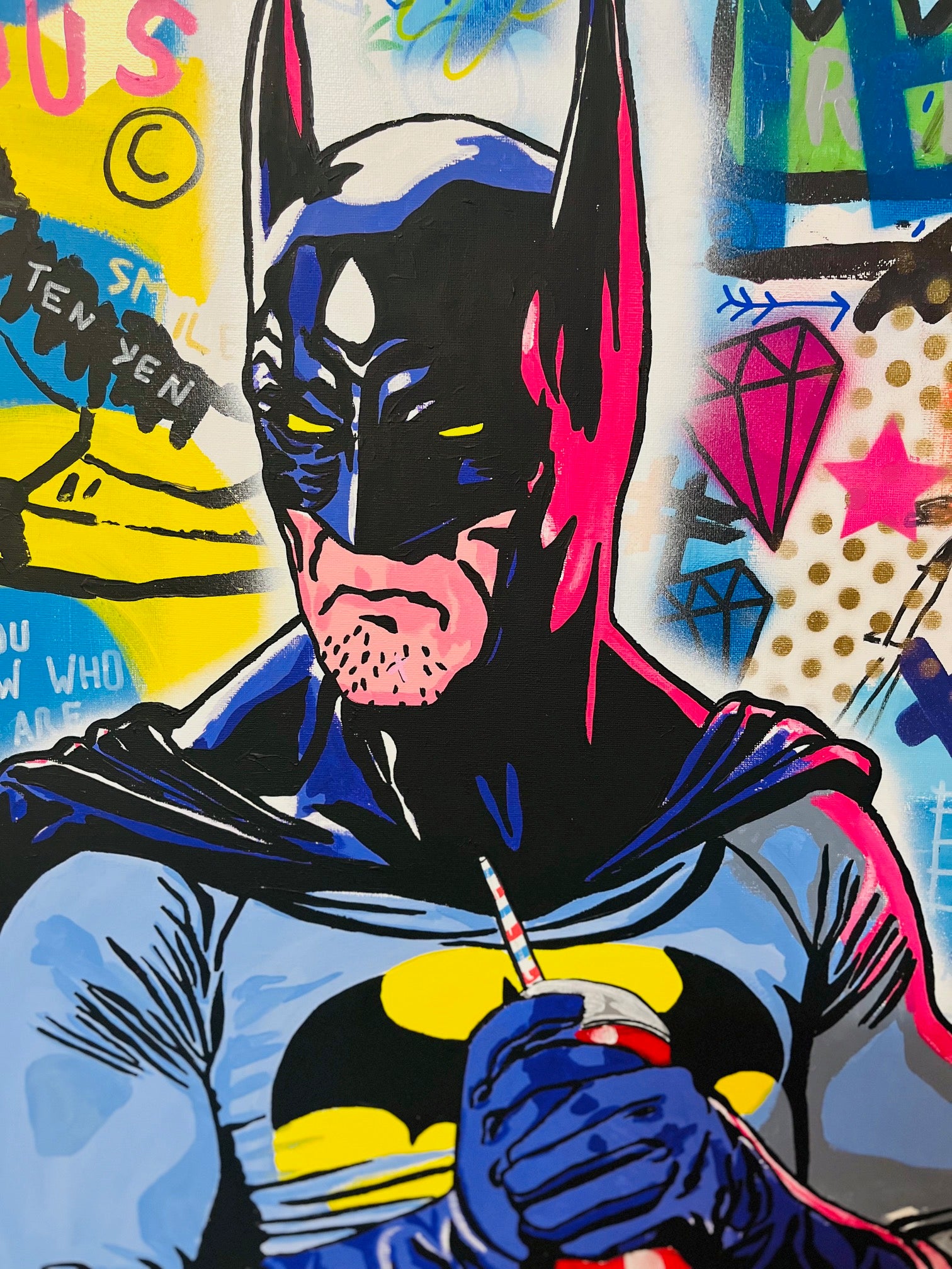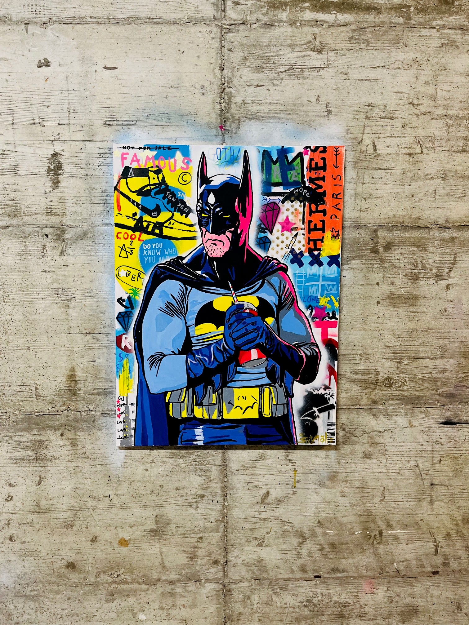 On the painting we can find a tribute to Batman in a tipical saturday night to Gotam City.