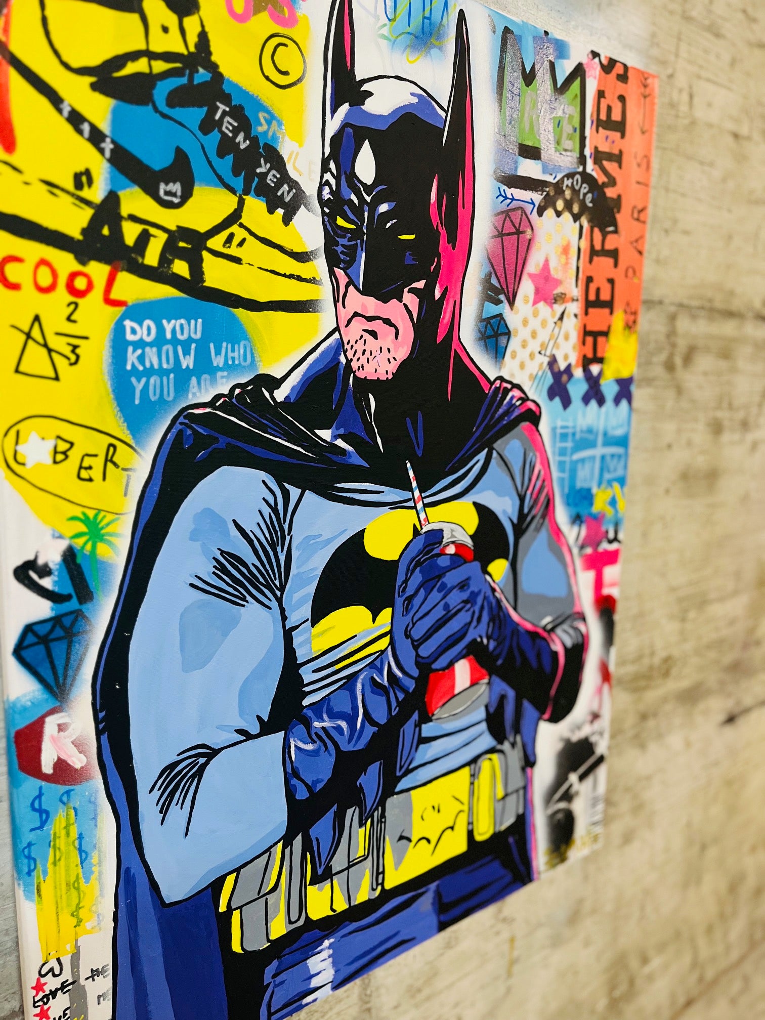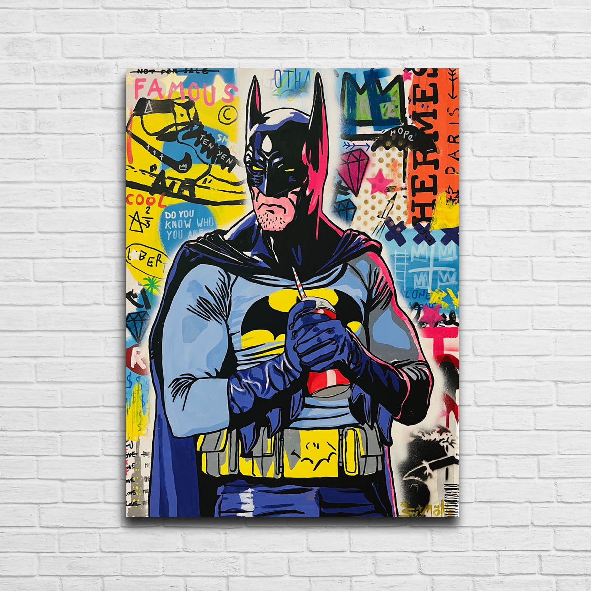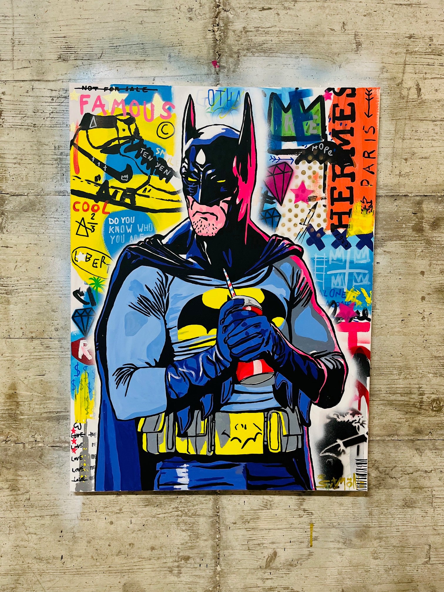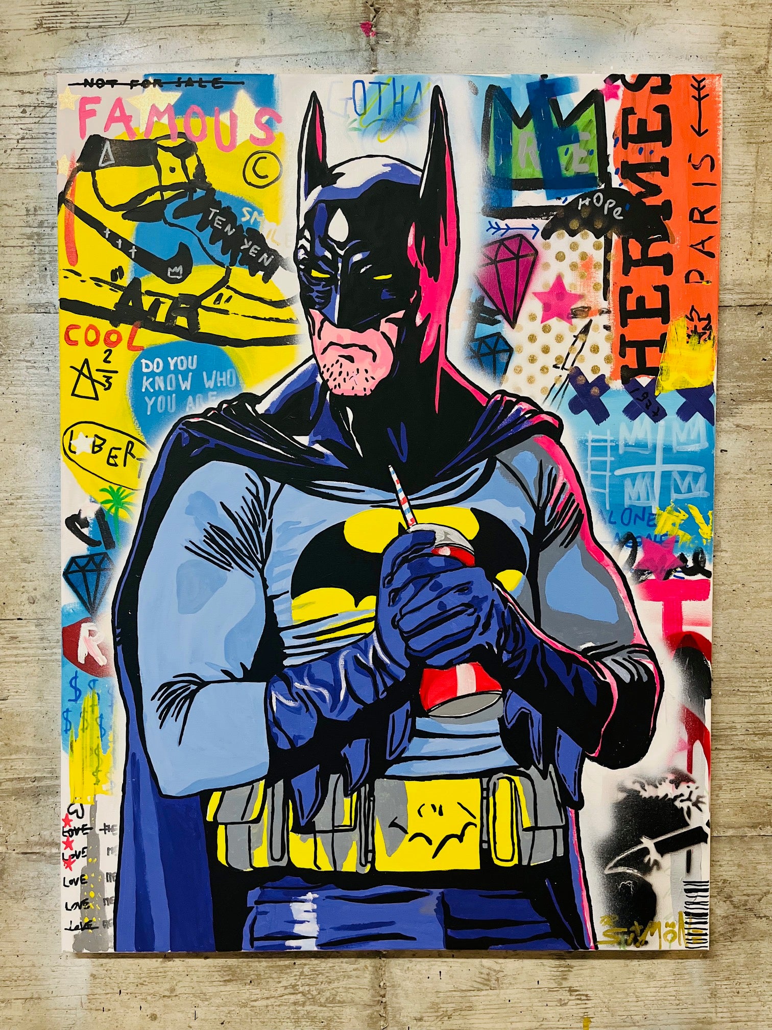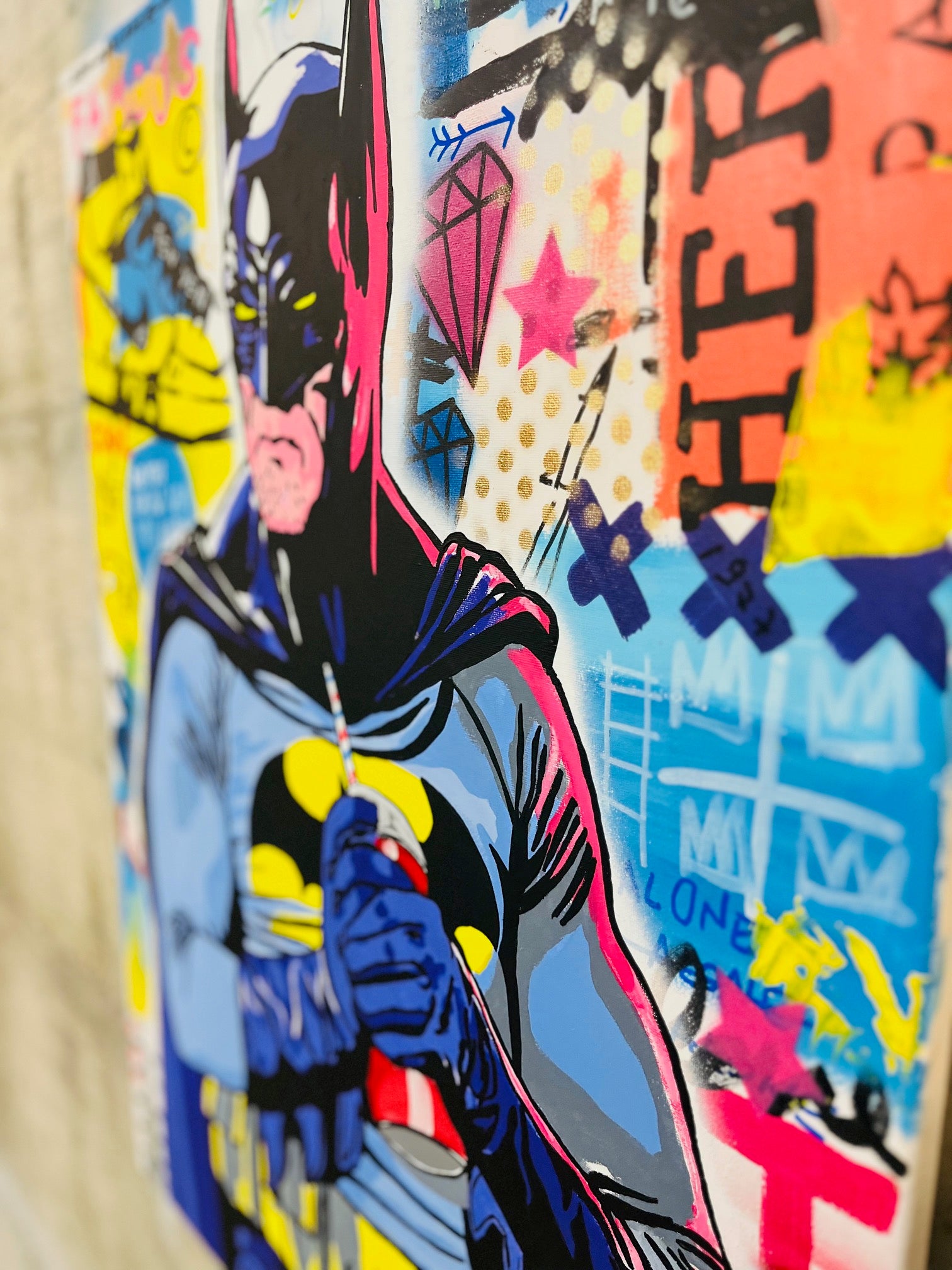 On the painting we can find a tribute to Batman in a tipical saturday night to Gotam City.
