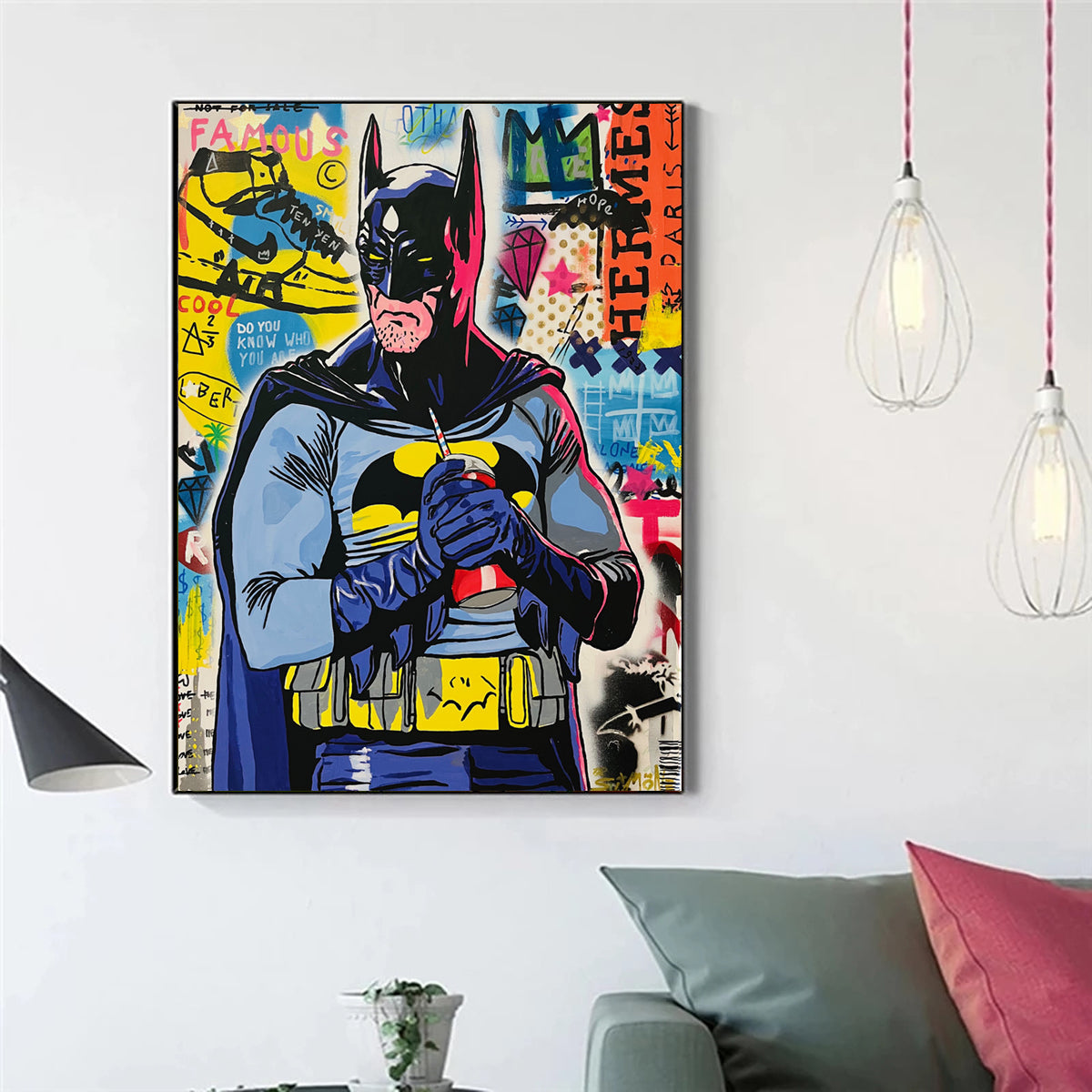 The background is a set of colors and well-known pop and street art references. In the background we find an explosion of graffiti with bright colors and iconic writings, an interesting painting to capture the attention of those who look at it.
