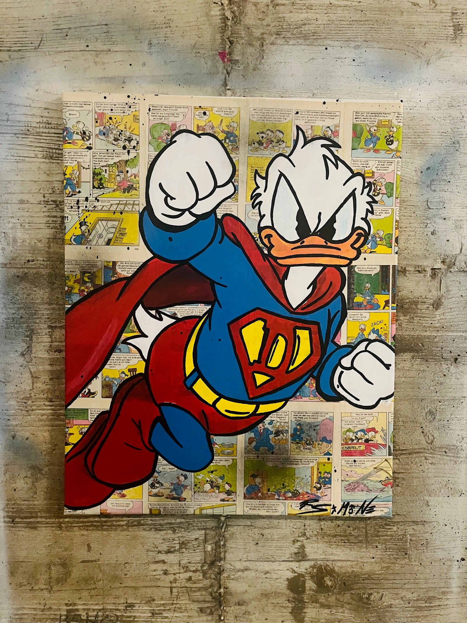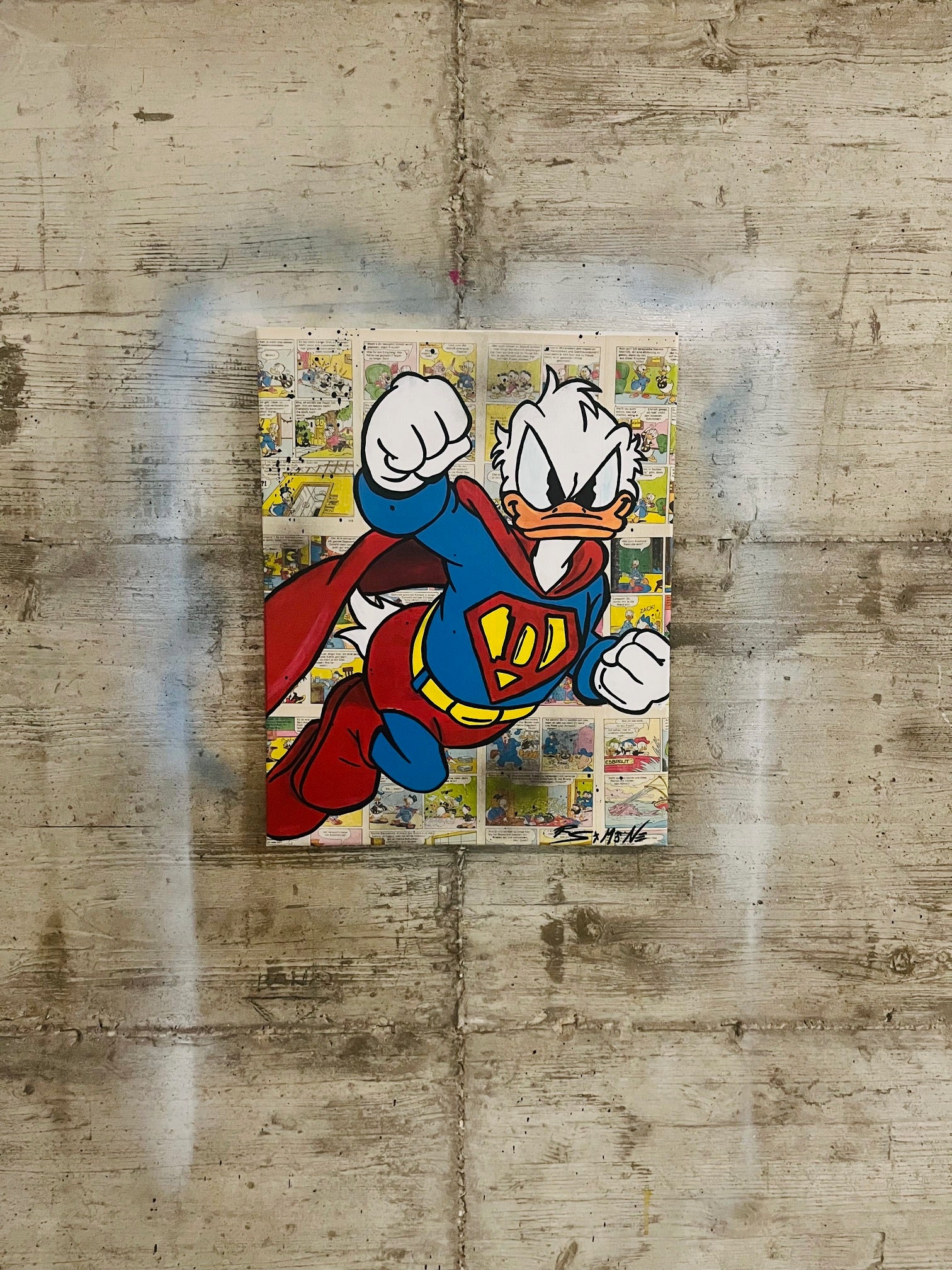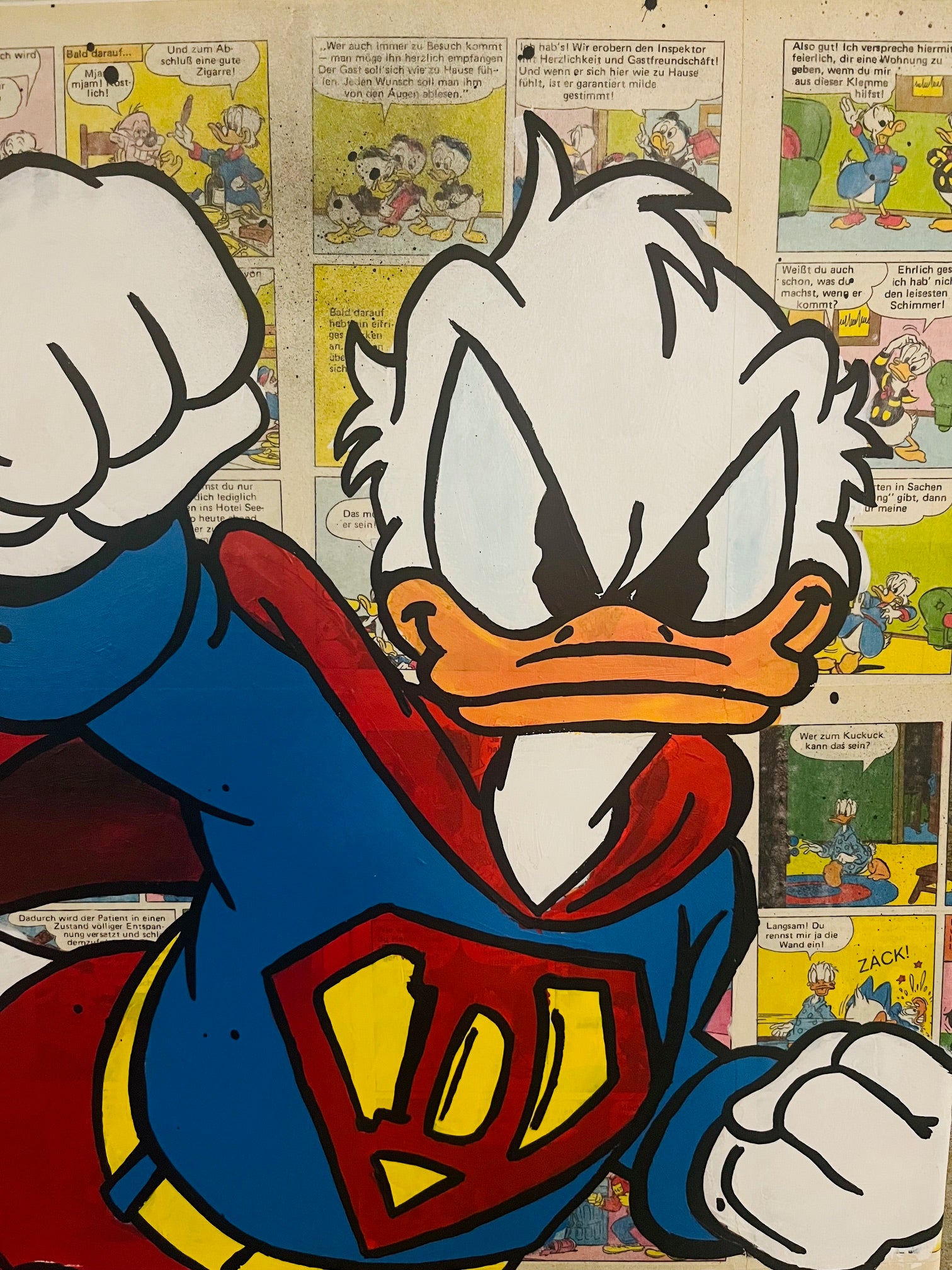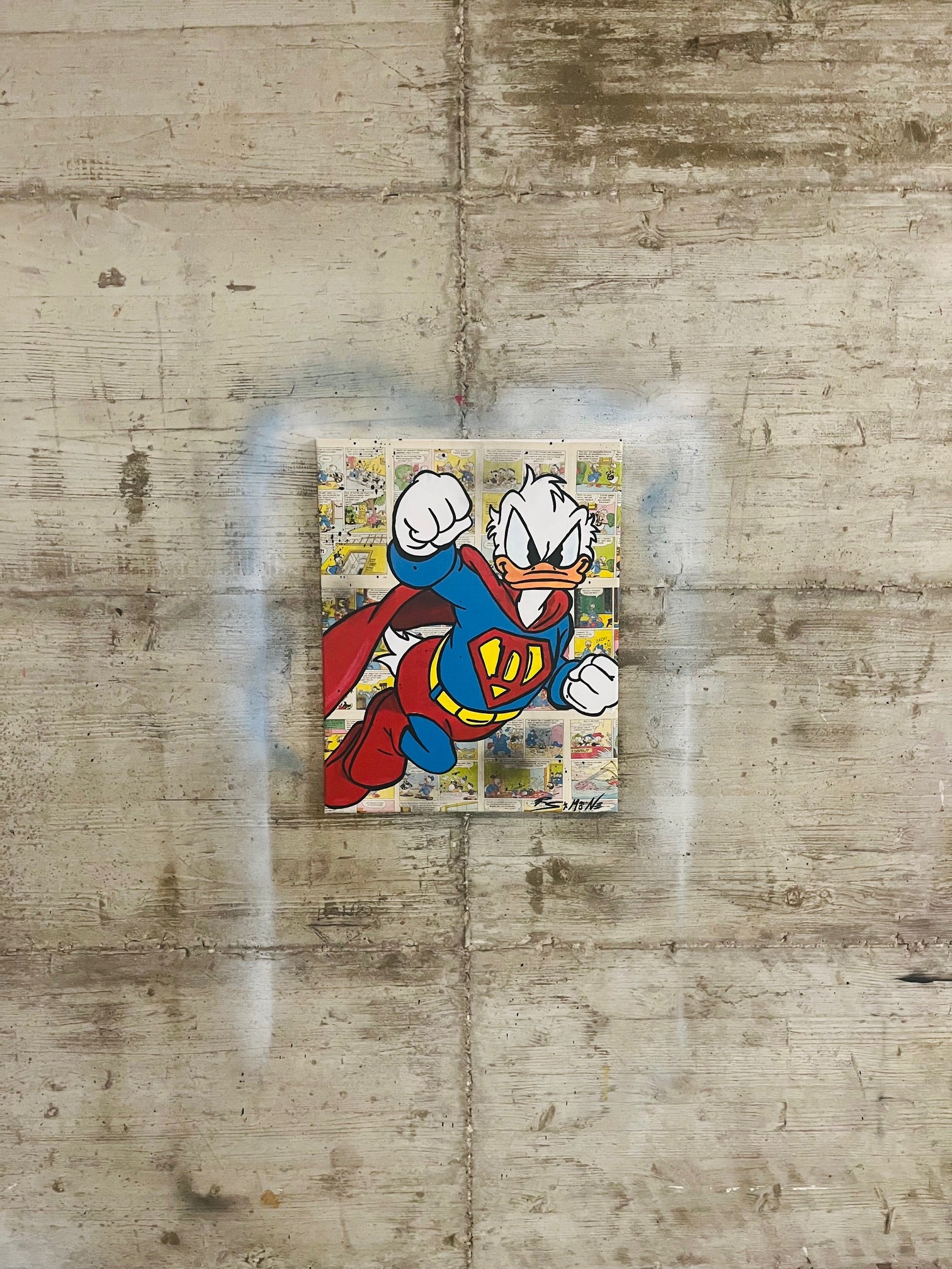The Artworks are painted by the artist with acrylic colors, spray paints and protective paint to preserve the work of art. Bacckground is created by playng comics pages collage. The theme used by the artist refers to famous Donald Duck in a superheroes version.