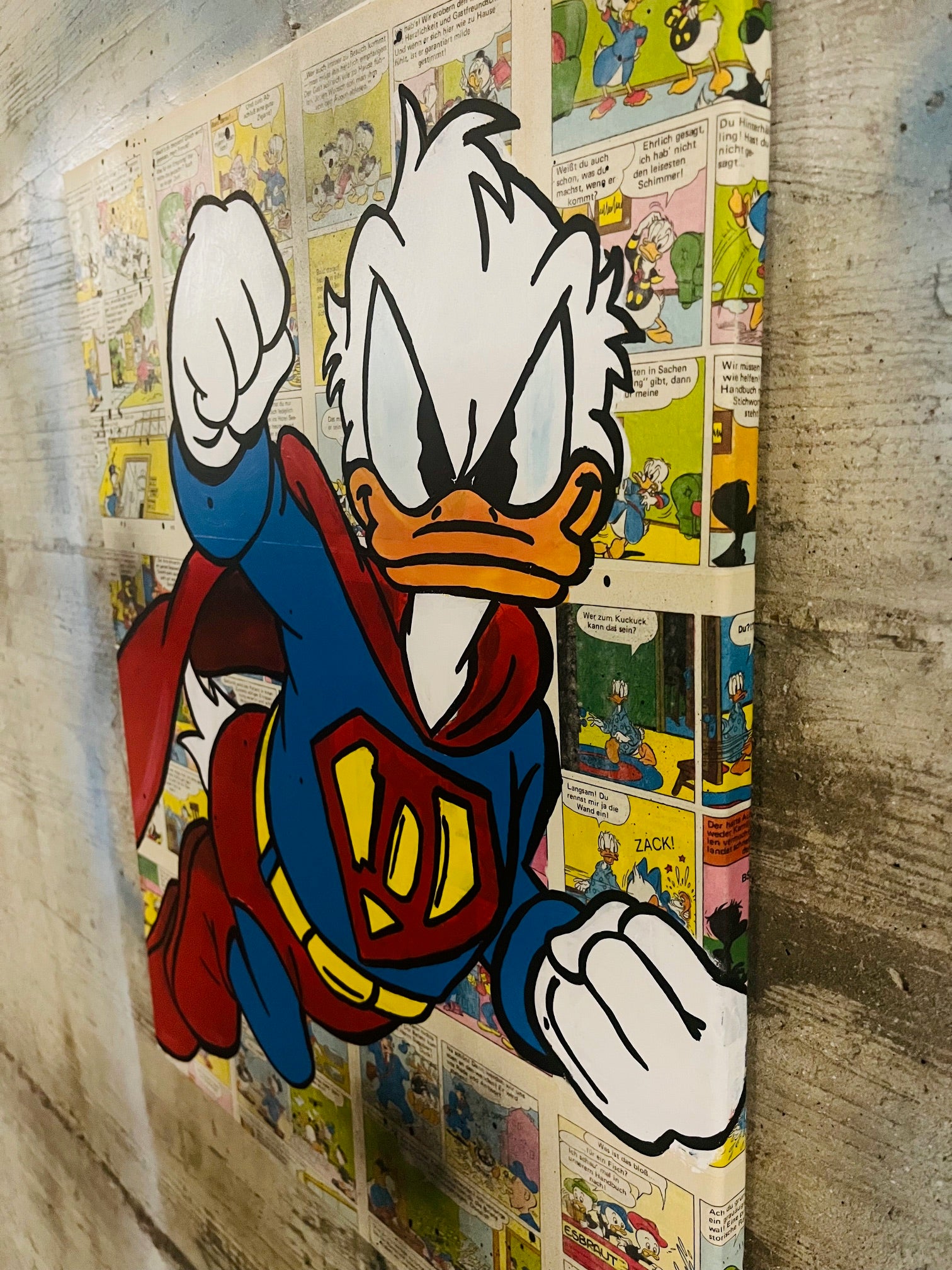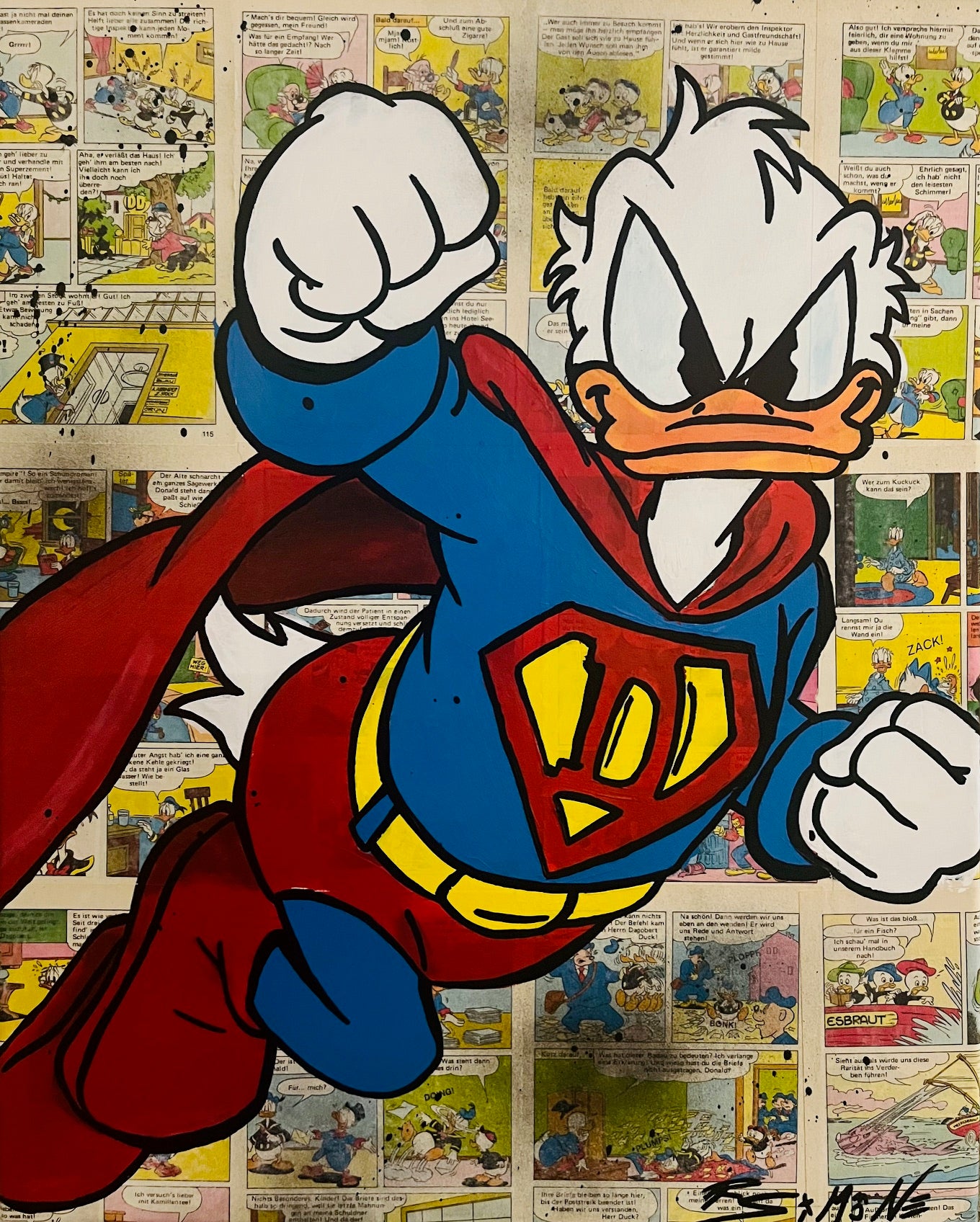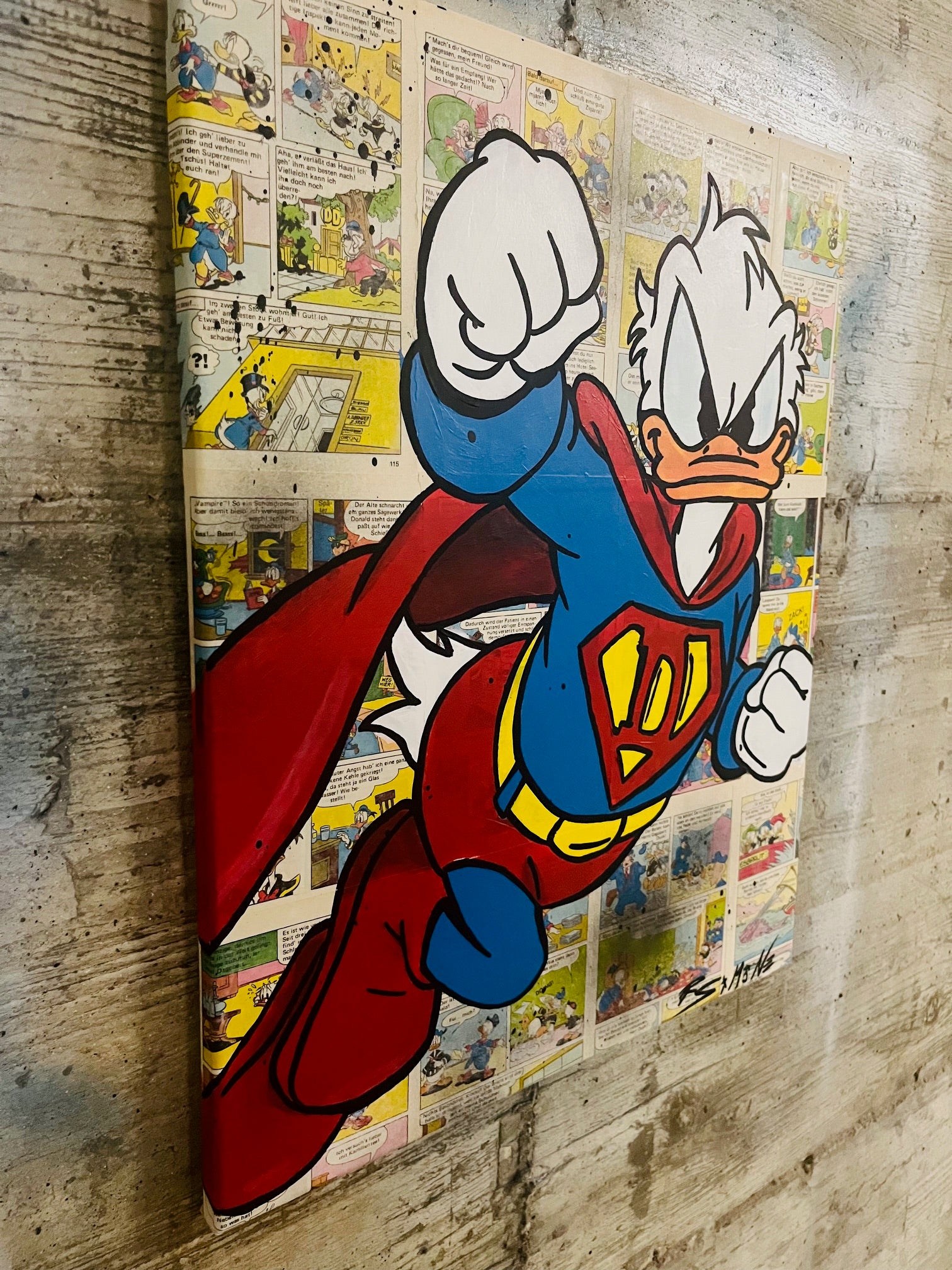 The Artworks are painted by the artist with acrylic colors, spray paints and protective paint to preserve the work of art. Bacckground is created by playng comics pages collage. The theme used by the artist refers to famous Donald Duck in a superheroes version.