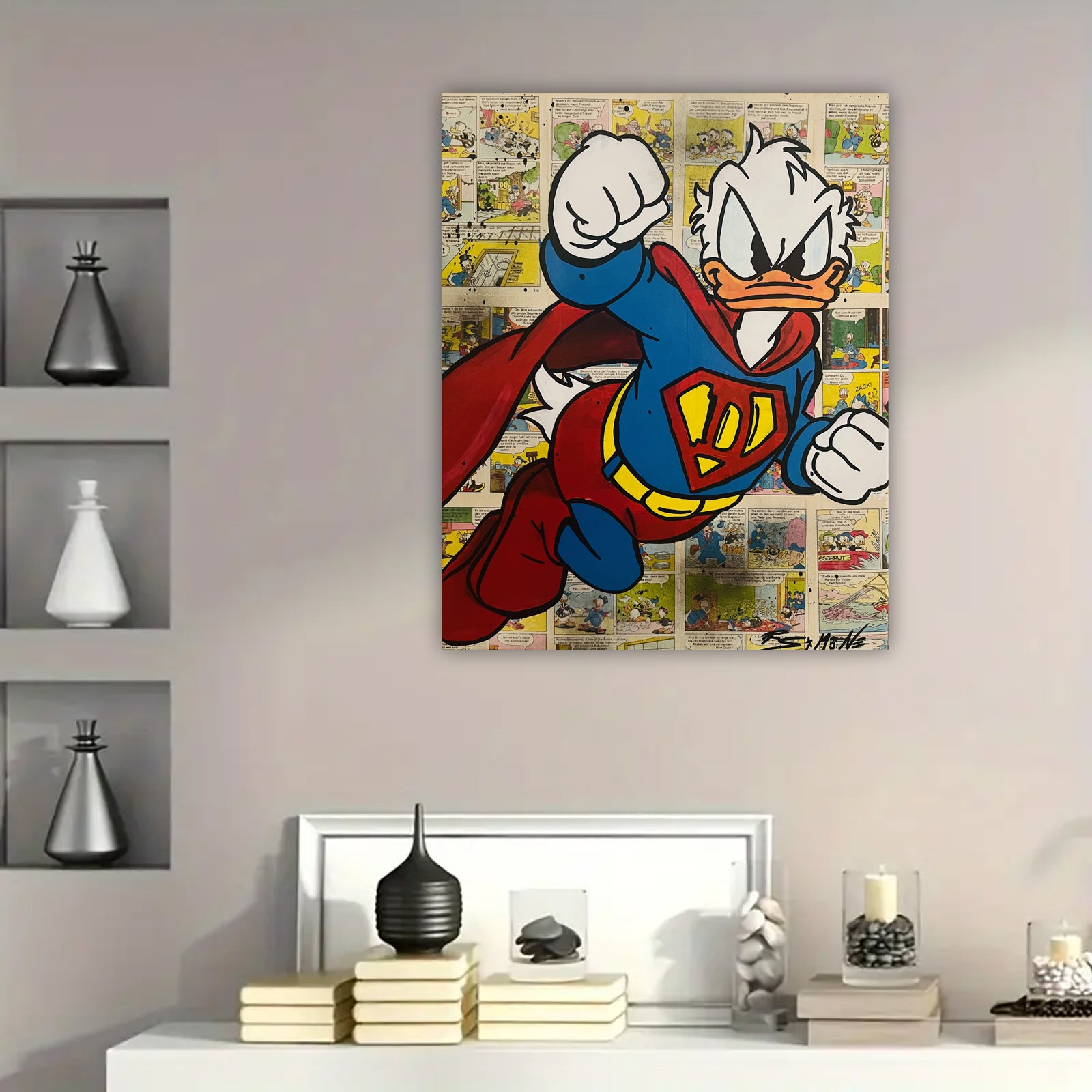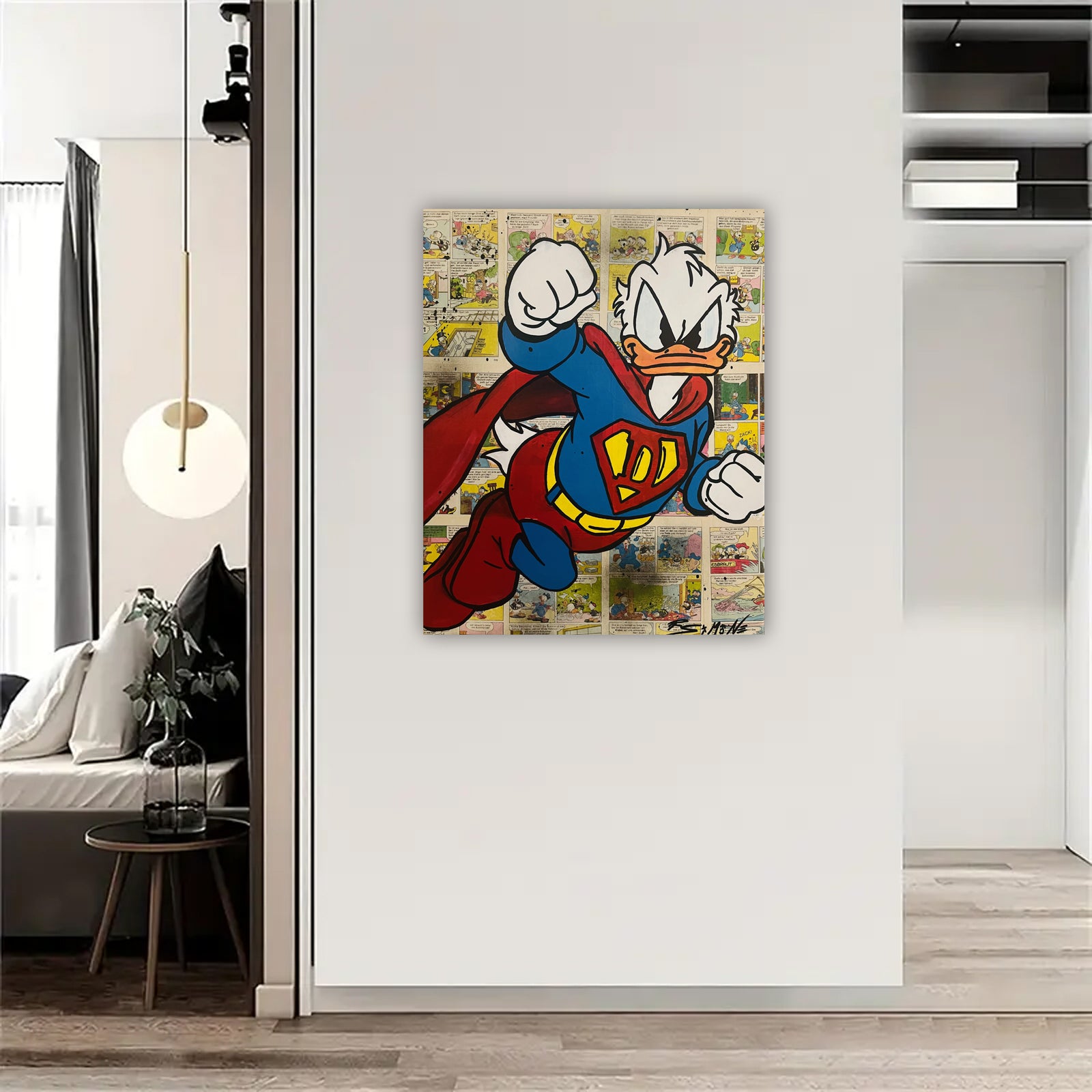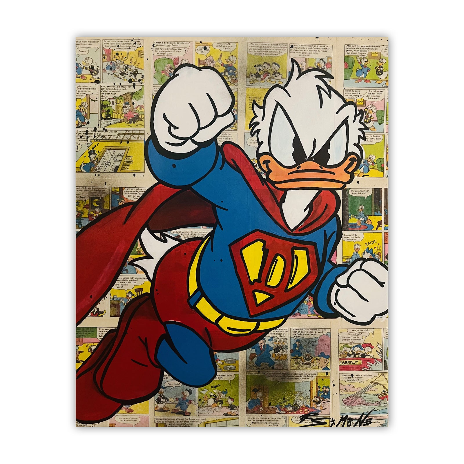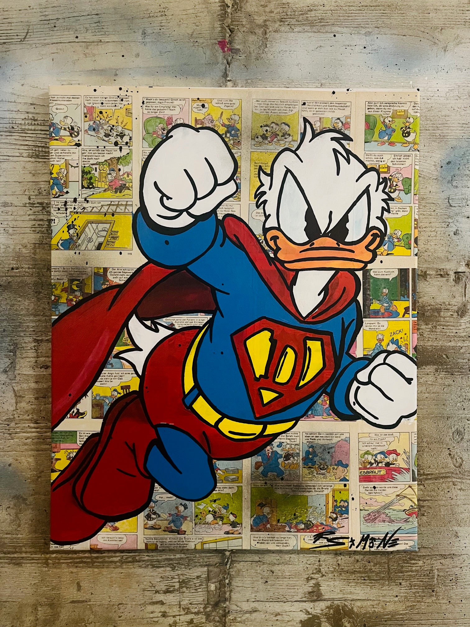 The Artworks are painted by the artist with acrylic colors, spray paints and protective paint to preserve the work of art. Bacckground is created by playng comics pages collage. The theme used by the artist refers to famous Donald Duck in a superheroes version.