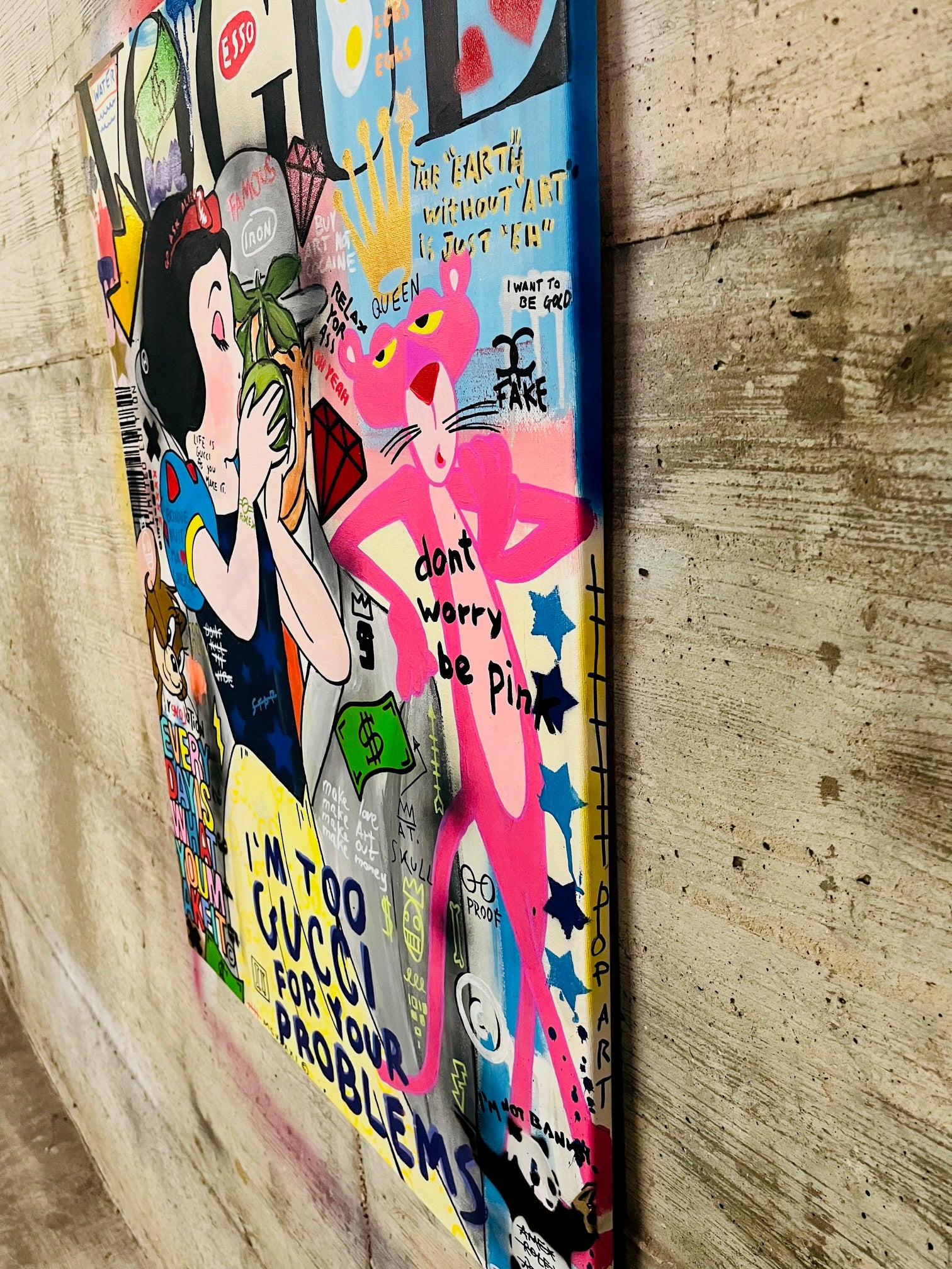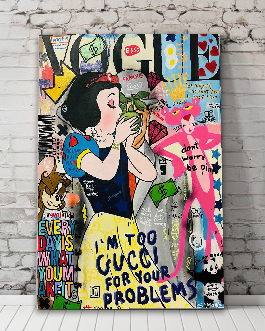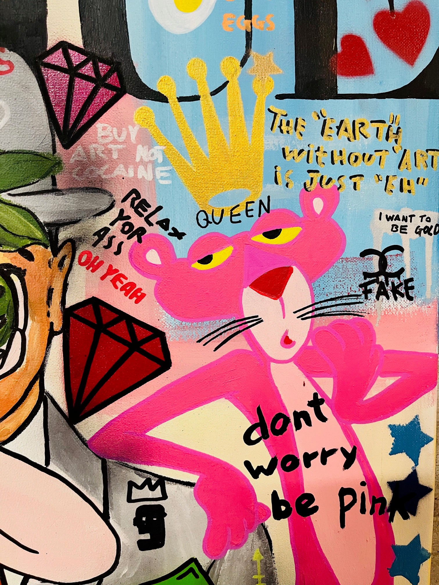 Street Art Dialogue: The canvas is covered with a frenzy of text and symbols that echo the visual overload of modern media and street art. Phrases like "I'M TOO GUCCI FOR YOUR PROBLEMS" and "EVERY DAY IS WHAT YOU MAKE IT" act as contemporary mantras, while familiar characters like Pink Panther and Jerry (from Tom and Jerry) introduce a playful yet anarchic element.