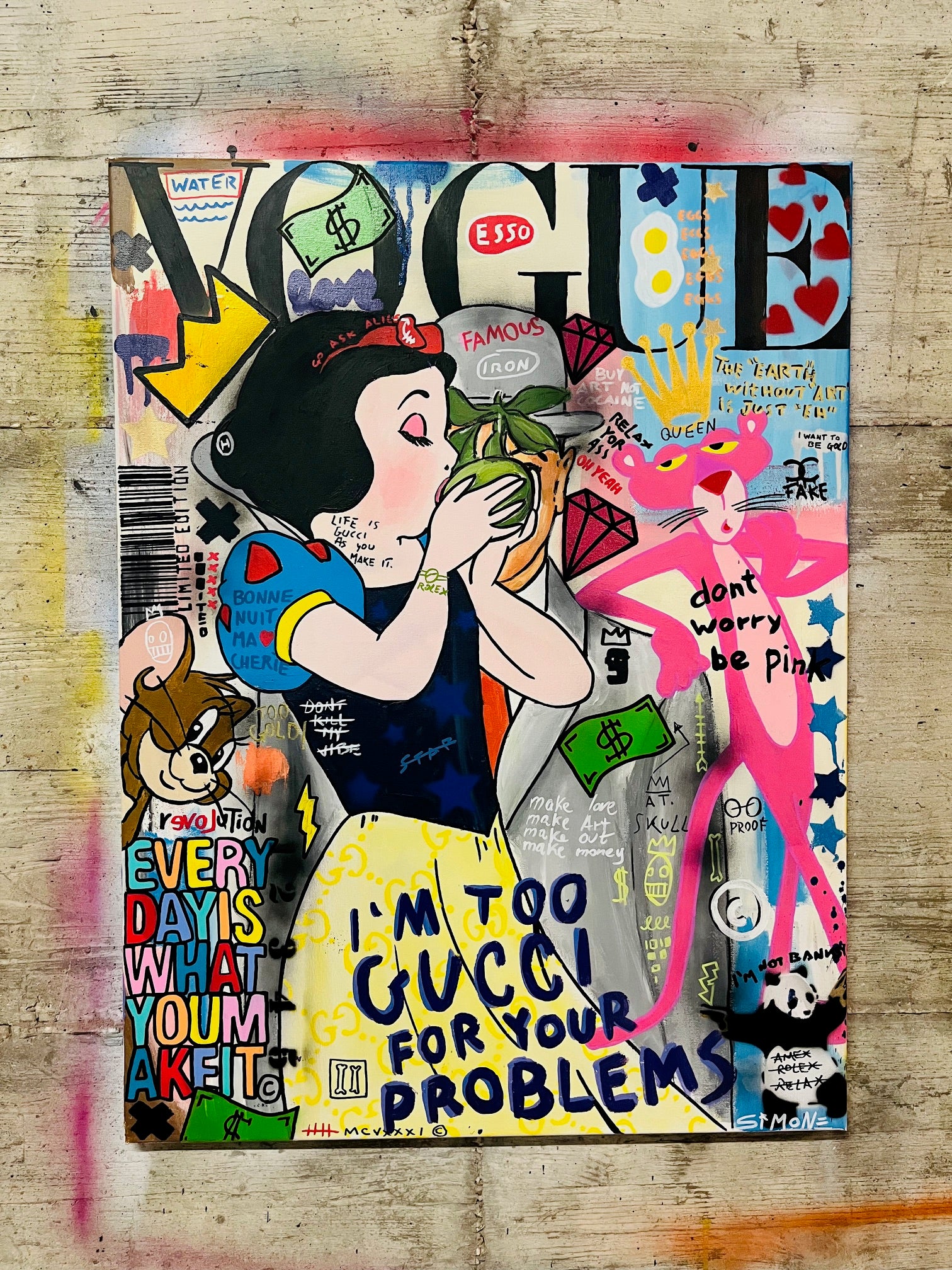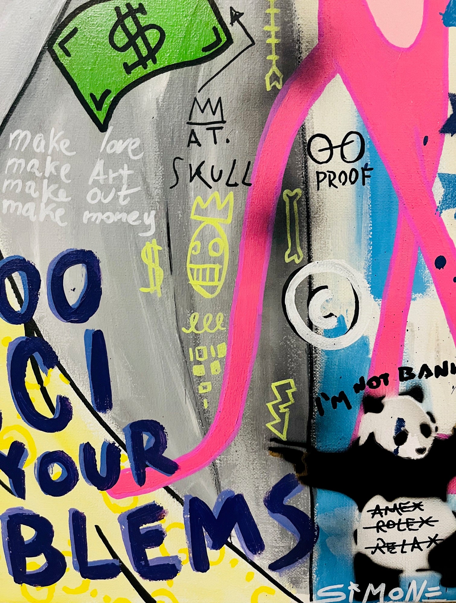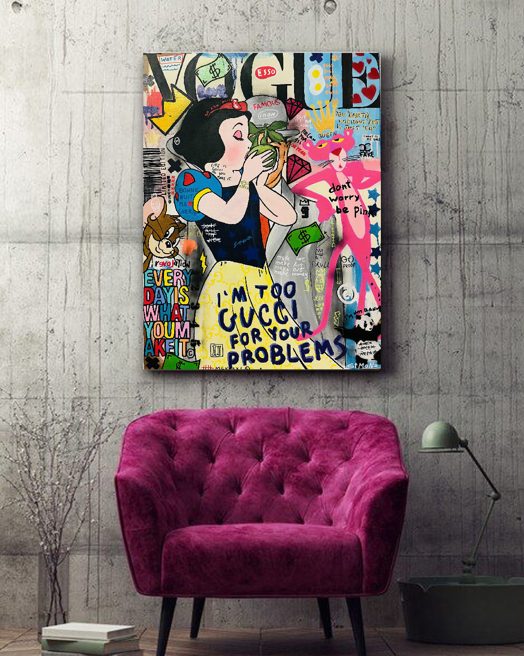 Street Art Dialogue: The canvas is covered with a frenzy of text and symbols that echo the visual overload of modern media and street art. Phrases like "I'M TOO GUCCI FOR YOUR PROBLEMS" and "EVERY DAY IS WHAT YOU MAKE IT" act as contemporary mantras, while familiar characters like Pink Panther and Jerry (from Tom and Jerry) introduce a playful yet anarchic element.