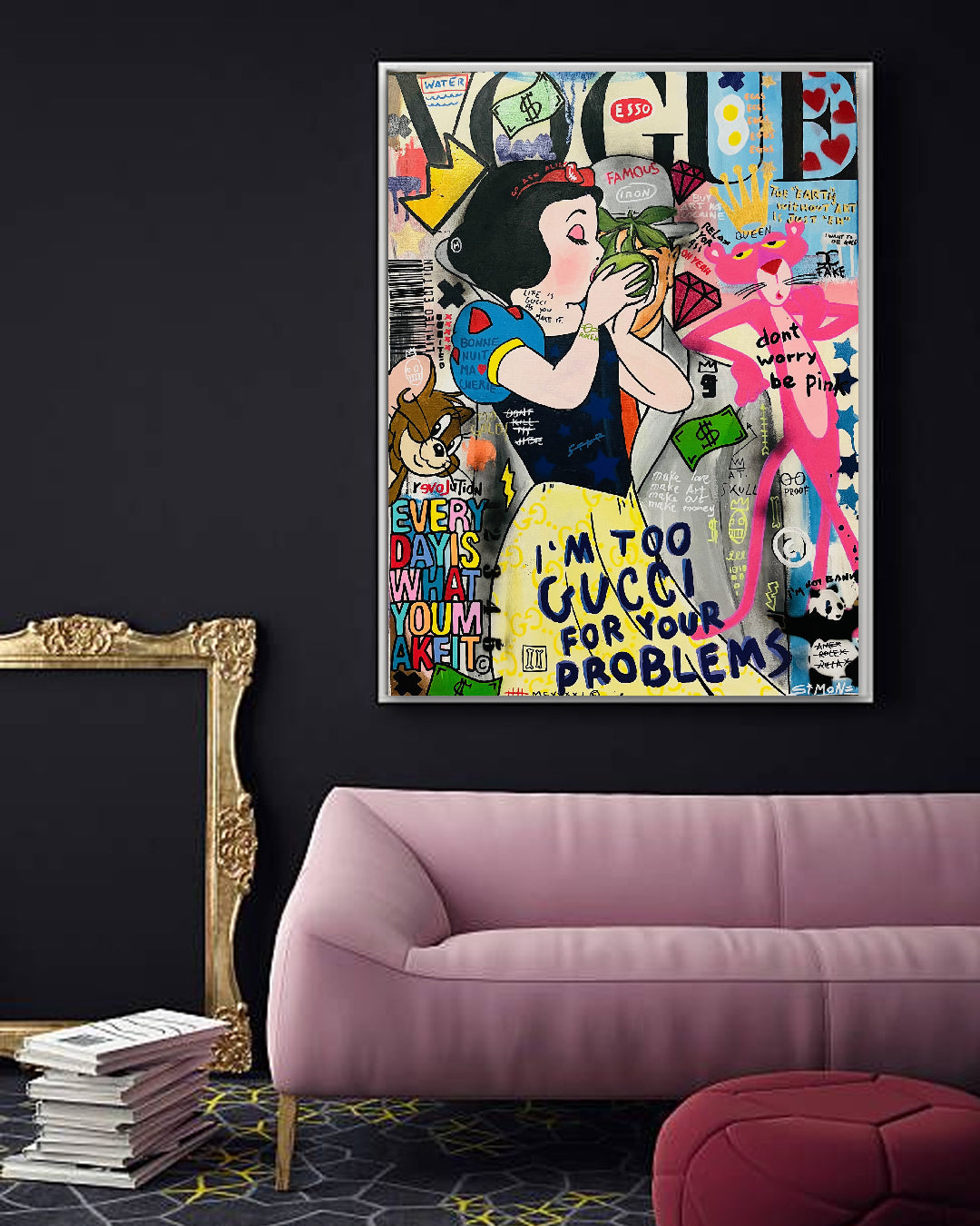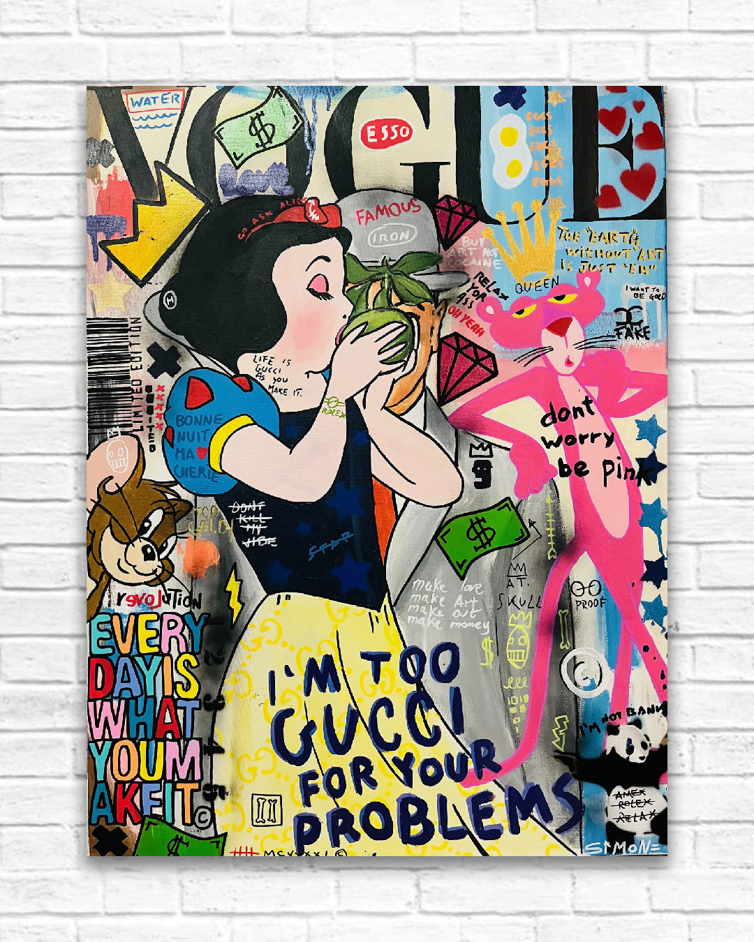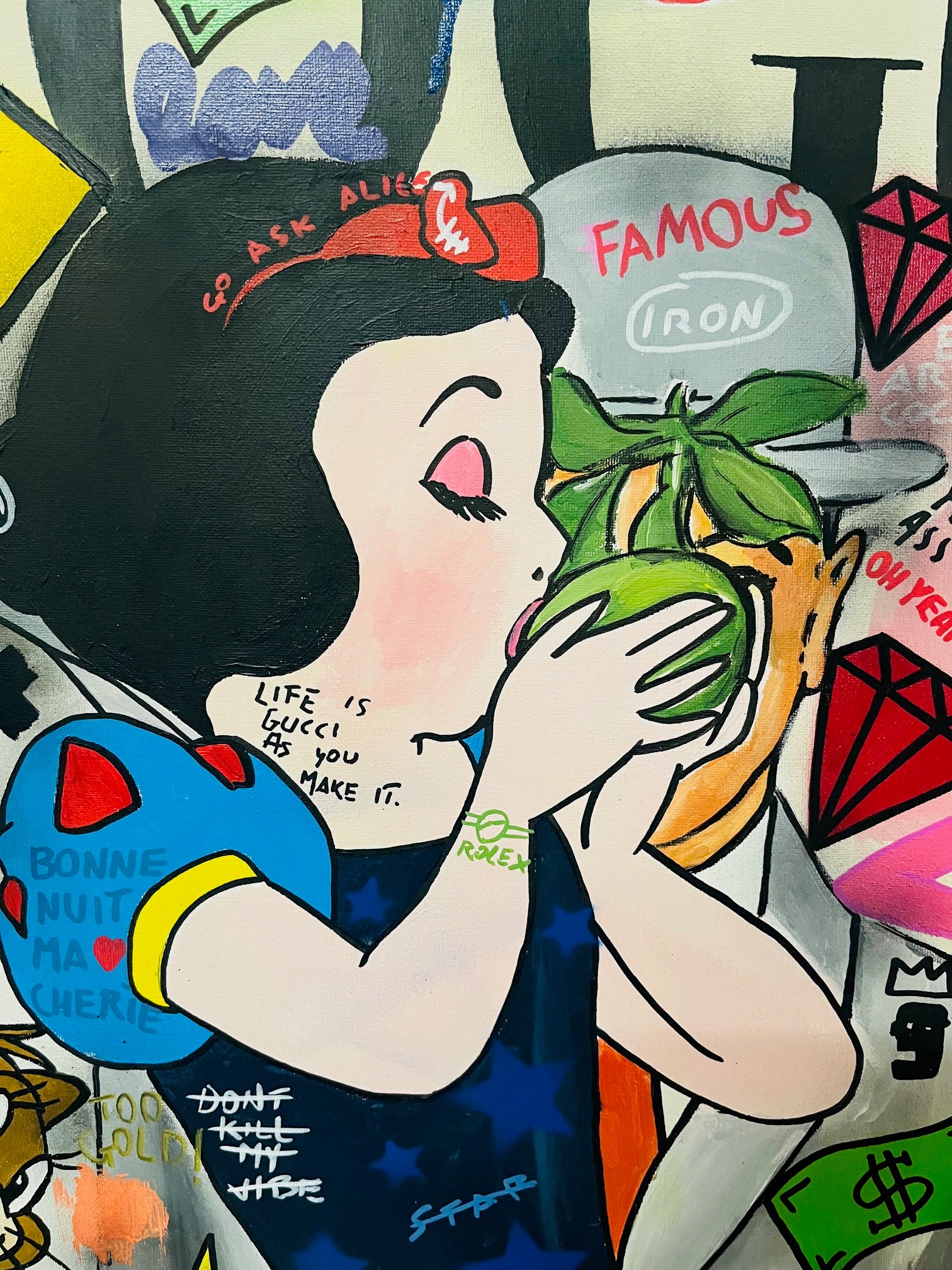 Iconographic Fusion: The central image of Snow White, rendered in a classic cartoon style, is immediately subverted. She is not biting a poisoned apple, but is instead seen contemplating, or perhaps consuming, a symbolic object that represents desire in the age of global capitalism. Her dress is emblazoned with the prominent Gucci logo, a direct confrontation between high fashion and popular fantasy.