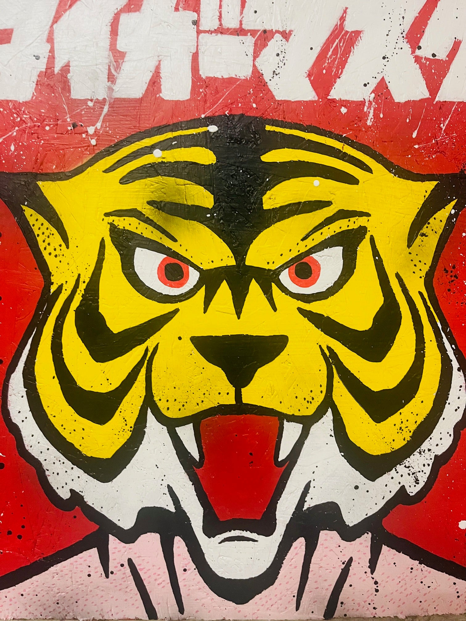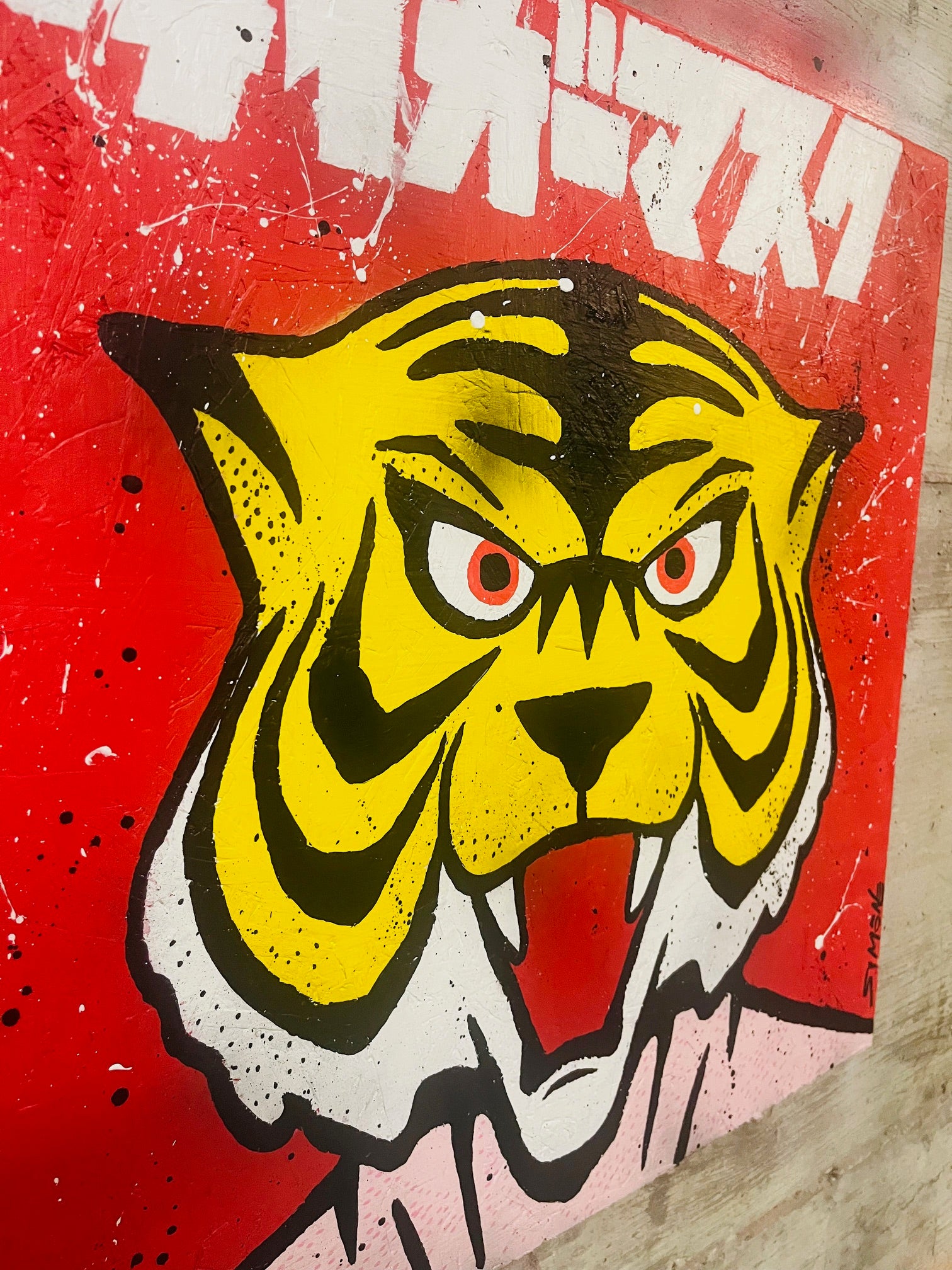 The composition is dominated by a fierce, hyper-saturated aesthetic. The striking chrome yellow and bold black of the tiger's face leap off the wood panell, set against an aggressive, action-packed crimson red backdrop that evokes the raw energy of a wrestling ring or a battle scene. The use of paint splatters—a deliberate artistic choice—adds a layer of chaotic dynamism, suggesting a moment of intense, unrestrained power.